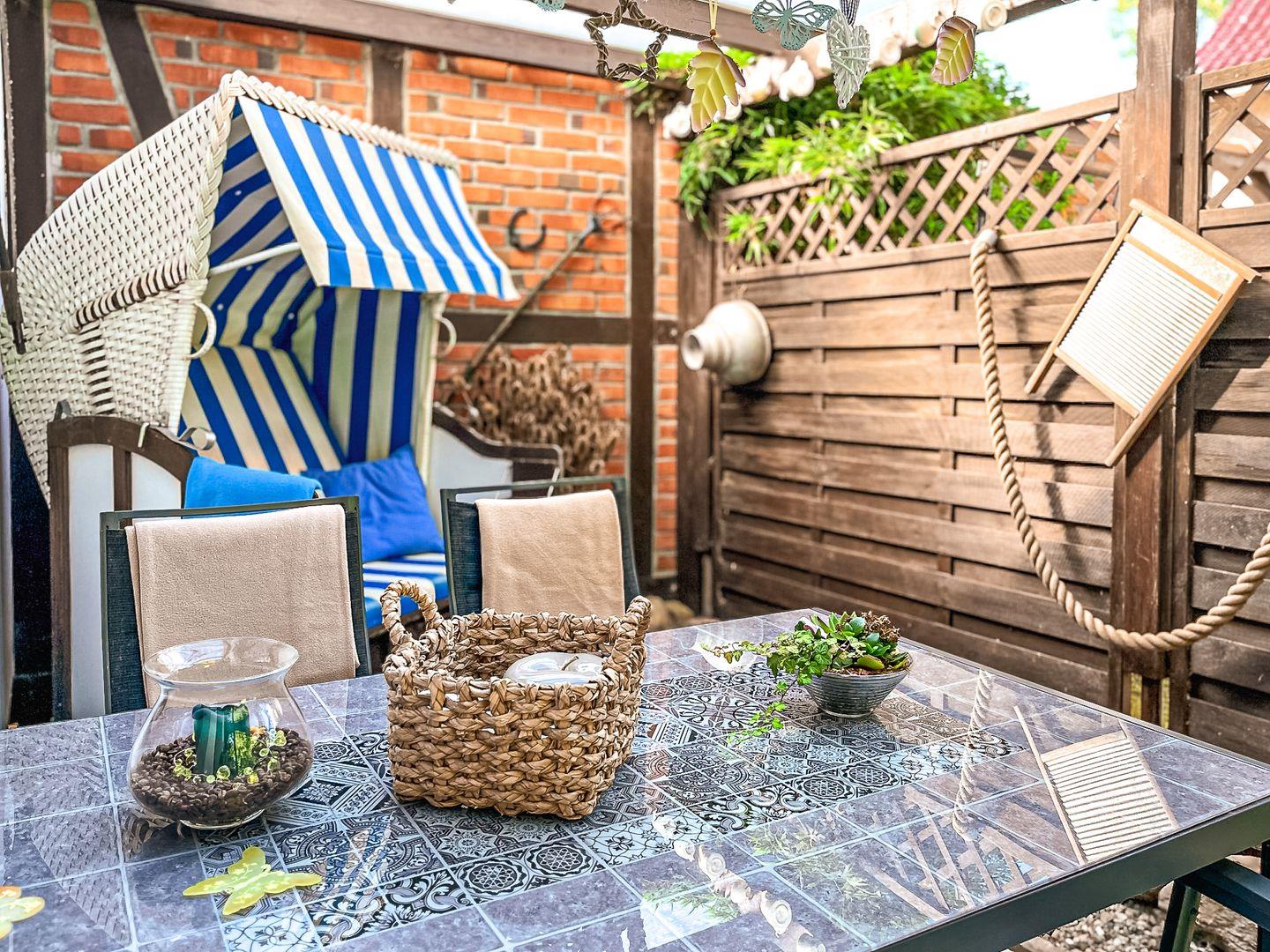 Für Entspannungsmomente nach einem ereignisreichen Urlaubstag sorgen im Wohnzimmer das behagliche Sofa und die gemütlich eingerichtete Essecke. Der TV und das Radio bieten Unterhaltungsmöglichkeiten. Direkt vor deiner Eingangstür lässt du auf der überdachten, möblierten Terrasse mit Strandkorb den Tag Revue passieren und genießt die Ruhe in Boltenhagens Ortsteil Redewisch.
