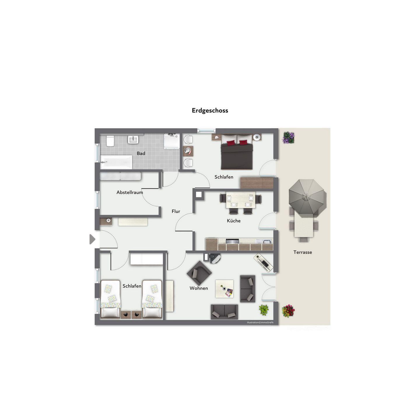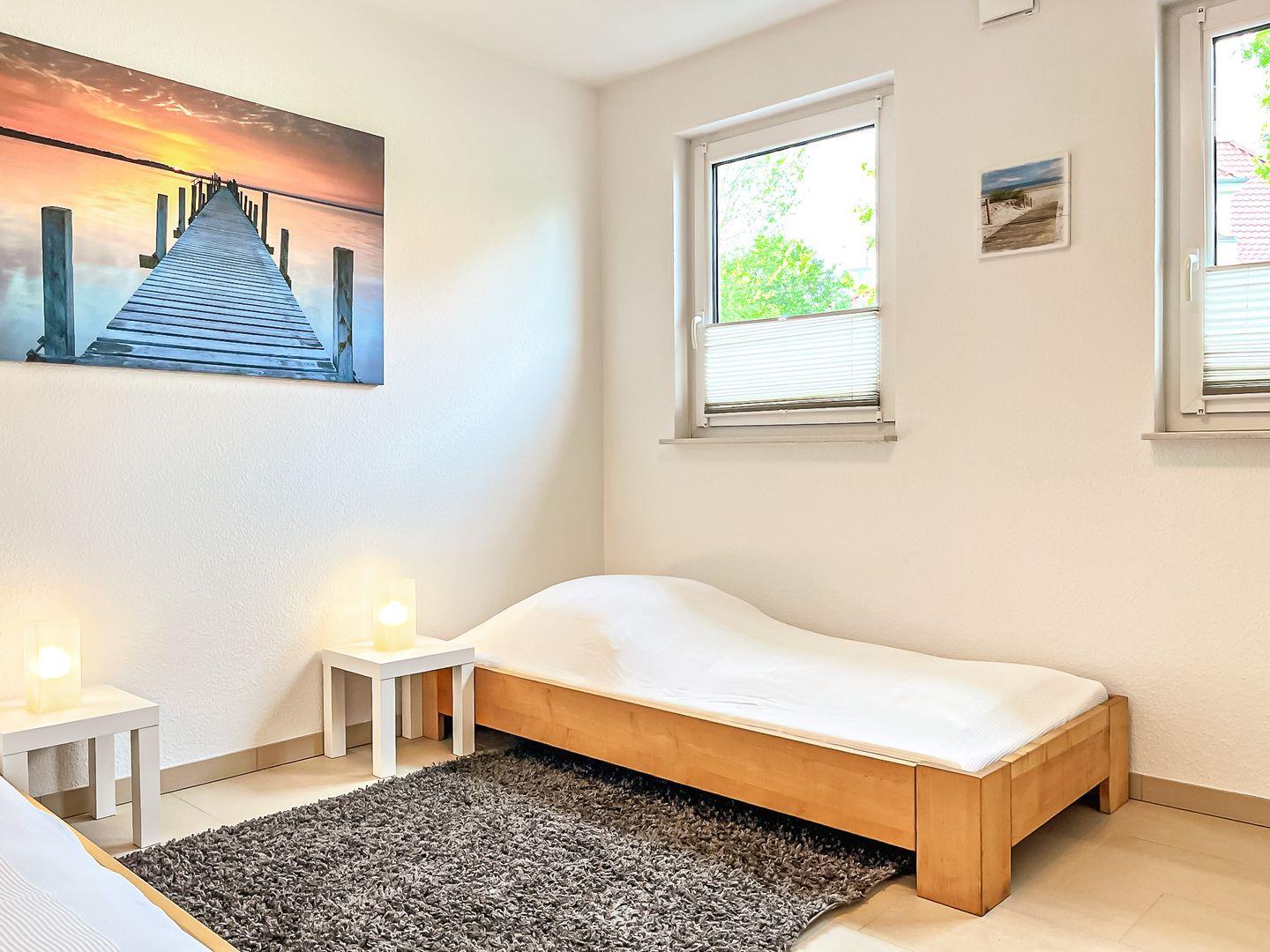 Im ersten Schlafzimmer stehen zwei Einzelbetten (mäßige Höhe) sowie ein Kleiderschrank, welcher genügend Platz für deine Urlaubsgarderobe bietet. Das zweite Schlafzimmer der Ferienwohnung ist mit einem Doppelbett ausgestattet. Ebenfalls steht hier ein geräumiger Kleiderschrank. Von diesem Schlafzimmer aus gelangst du ebenfalls auf die große Terrasse.