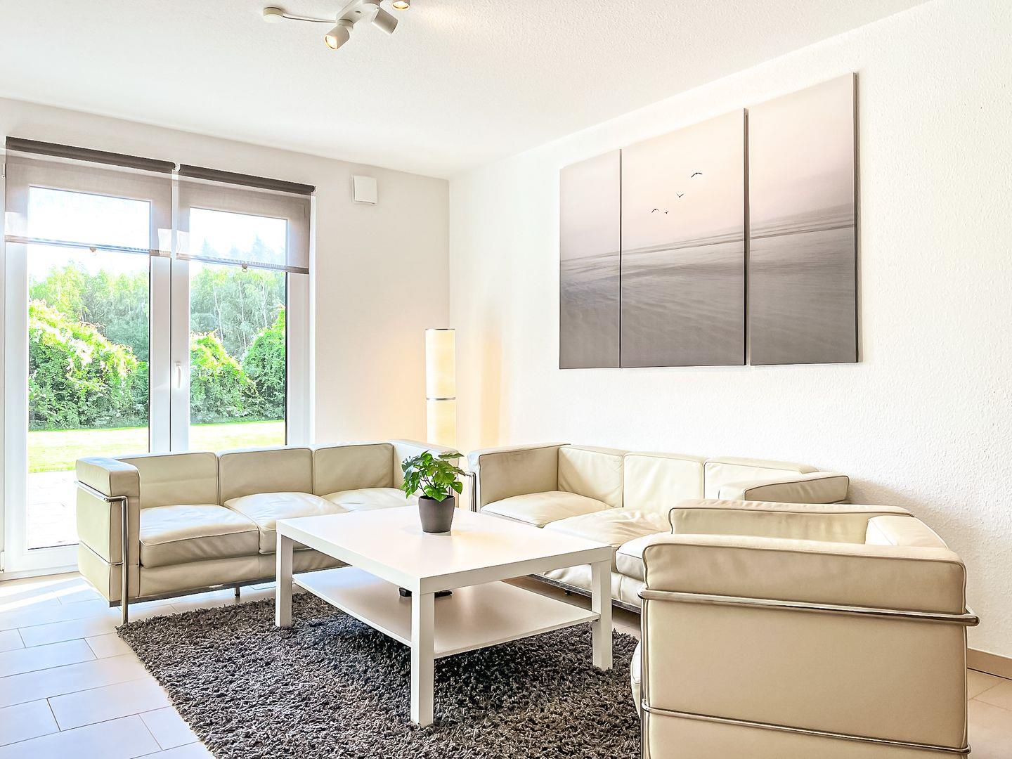 Im gemütlich eingerichteten Wohnzimmer lädt das Sofa mit den Sesseln zum entspannten TV-Abend ein. Für ein gemütliches Ambiente und wohlige Wärme sorgt der Kamin. Vom Wohnzimmer aus gelangst du auf die Nord-Ost-Terrasse. Hier findest du während der Saison Terrassenmöbel und einen Sonnenschirm vor. Ebenfalls kann die hinter dem Haus liegende Wiese zum Spielen genutzt werden.