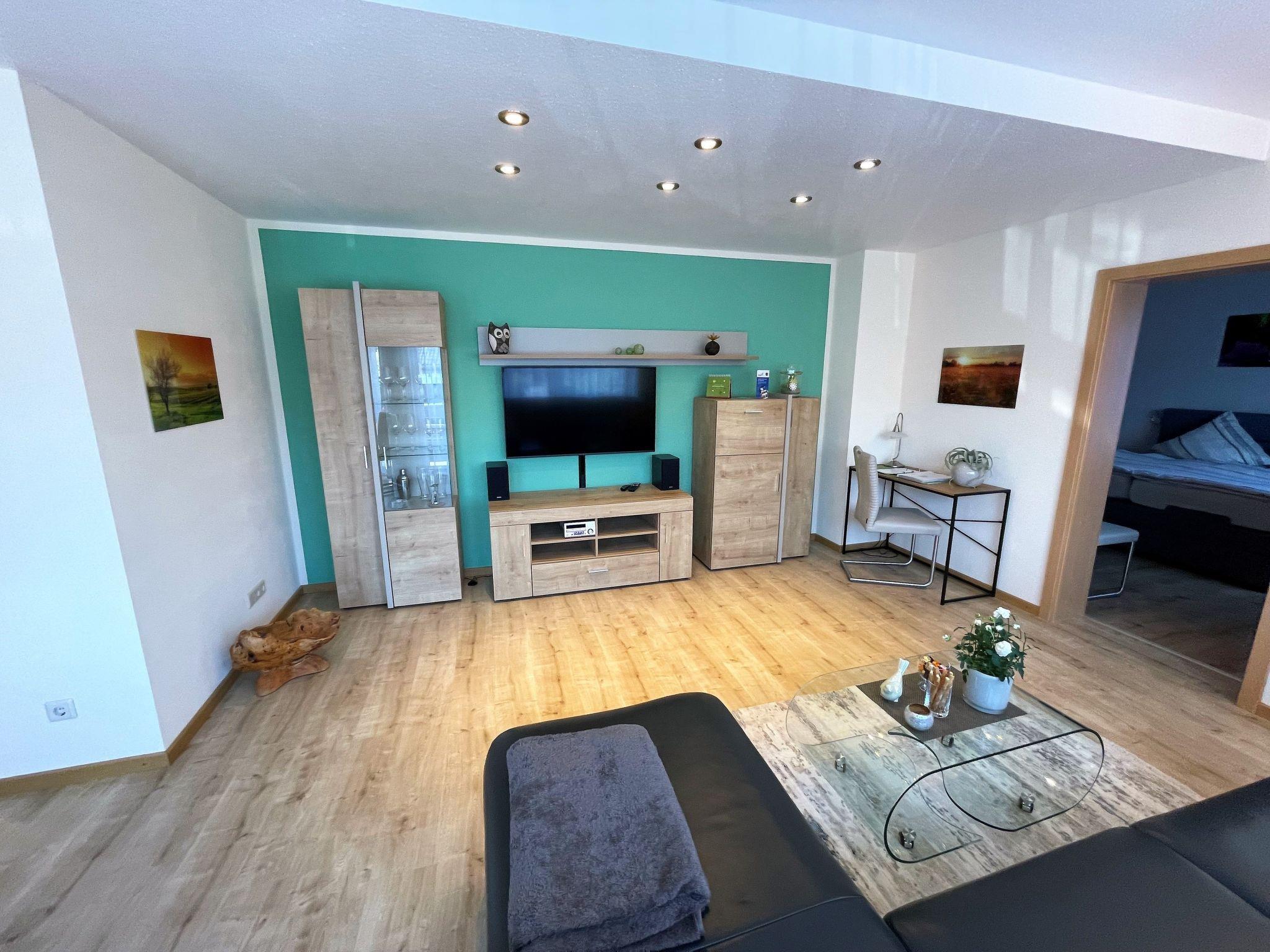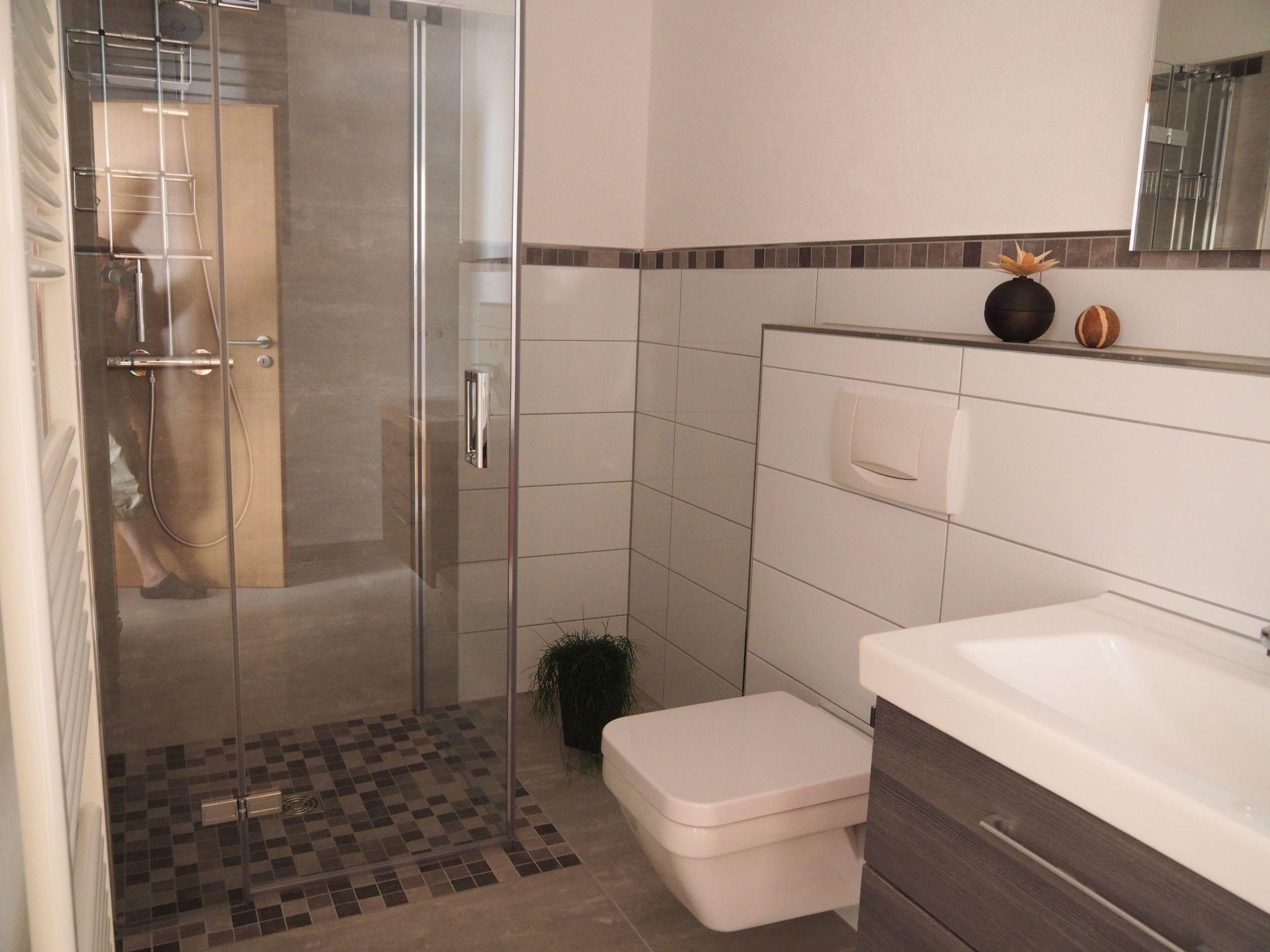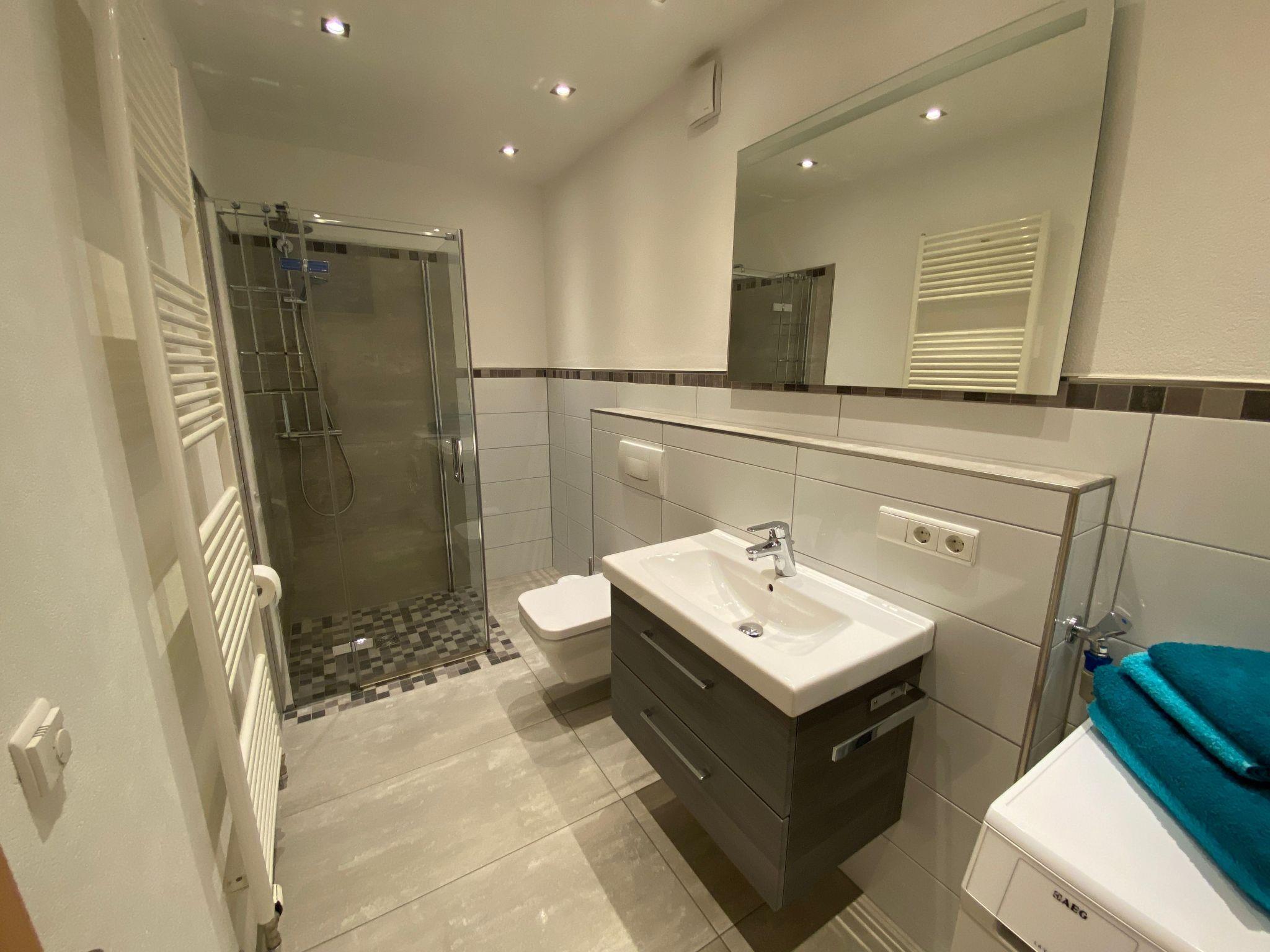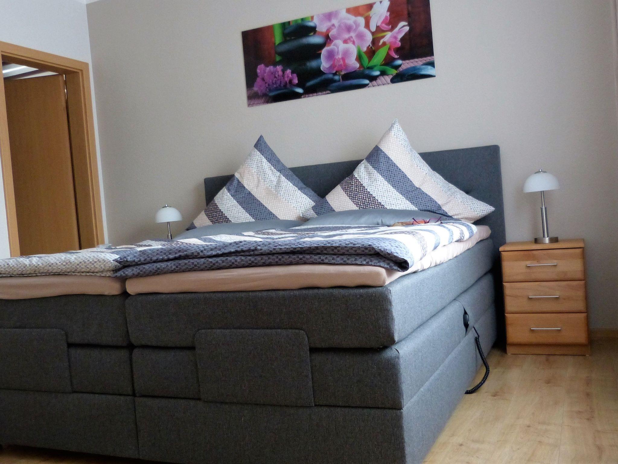The modern fitted kitchen is equipped with branded built-in appliances, small appliances and stylish crockery and has a spacious dining area with comfortable chairs. There is a cosy dining/living area with a leather seating area and a modern shower room. In the bedroom, an electrically adjustable box-spring bed ensures sleeping comfort and pure relaxation, and a wardrobe with sliding doors and mirror is available for your wardrobe. Facilities in detail:OutsideGroomed outdoor facilities, garden furniture, parasol, beach chair, barrier-free, car park directly in front of the FEWO, paved terrace, storage space for your bicycles and storage space for e-bikes in the property free of charge and e-charging possibility for your car - for a fee - directly at the property. Living area:Dining table with 4 chairs, coffee table, leather couch, side table, modern wall unit, floor lamp. KitchenModern fitted kitchen with granite worktop, oven with top and bottom heat and convection, separate freezer compartment, dishwasher, coffee machine and on request Nespresso capsule machine with milk frother, toaster, kettle, egg cooker, Bosch food processor (on request), dishcloths and tea towels. Sanitary facilitiesModern barrier-free shower room with rainforest shower, washbasin, illuminated mirror, towel dryer, WC, towels, washing machine. Sleeping areaBedroom with electric box-spring bed (0.90m x 2m, 4-door wardrobe, hairdryer, maco satin or jersey bed linen, 2-4 towels and 1 shower towel per person, roller blinds. Extra duvets and microfibre blankets are available in the wardrobe. EntertainmentInternet - free of charge, W-Lan, CD player, hi-fi system with USB input, radio, LCD/LED satellite TV (internet-enabled).
