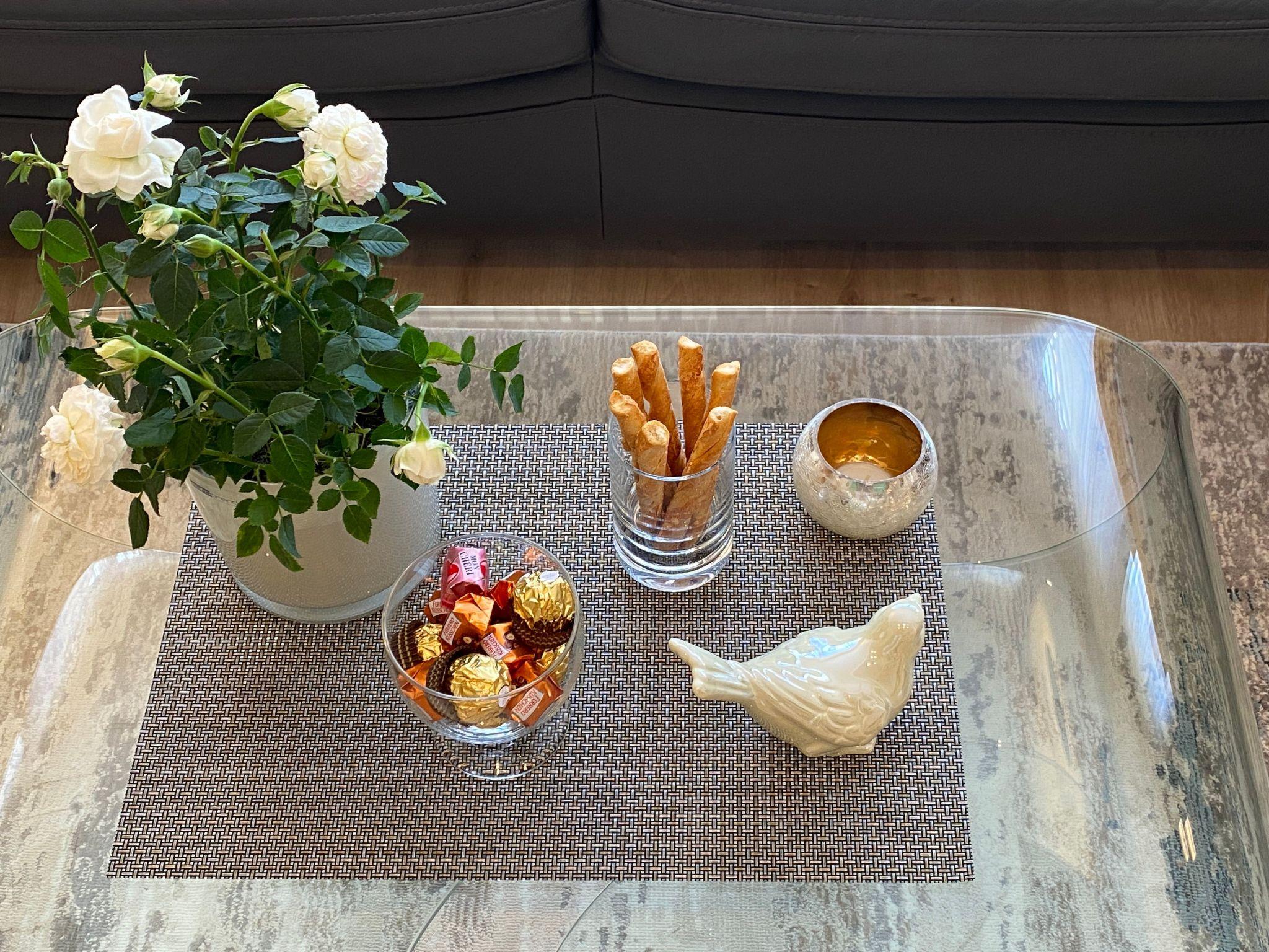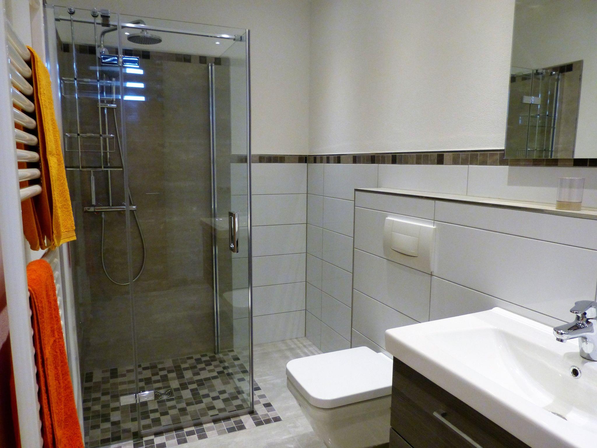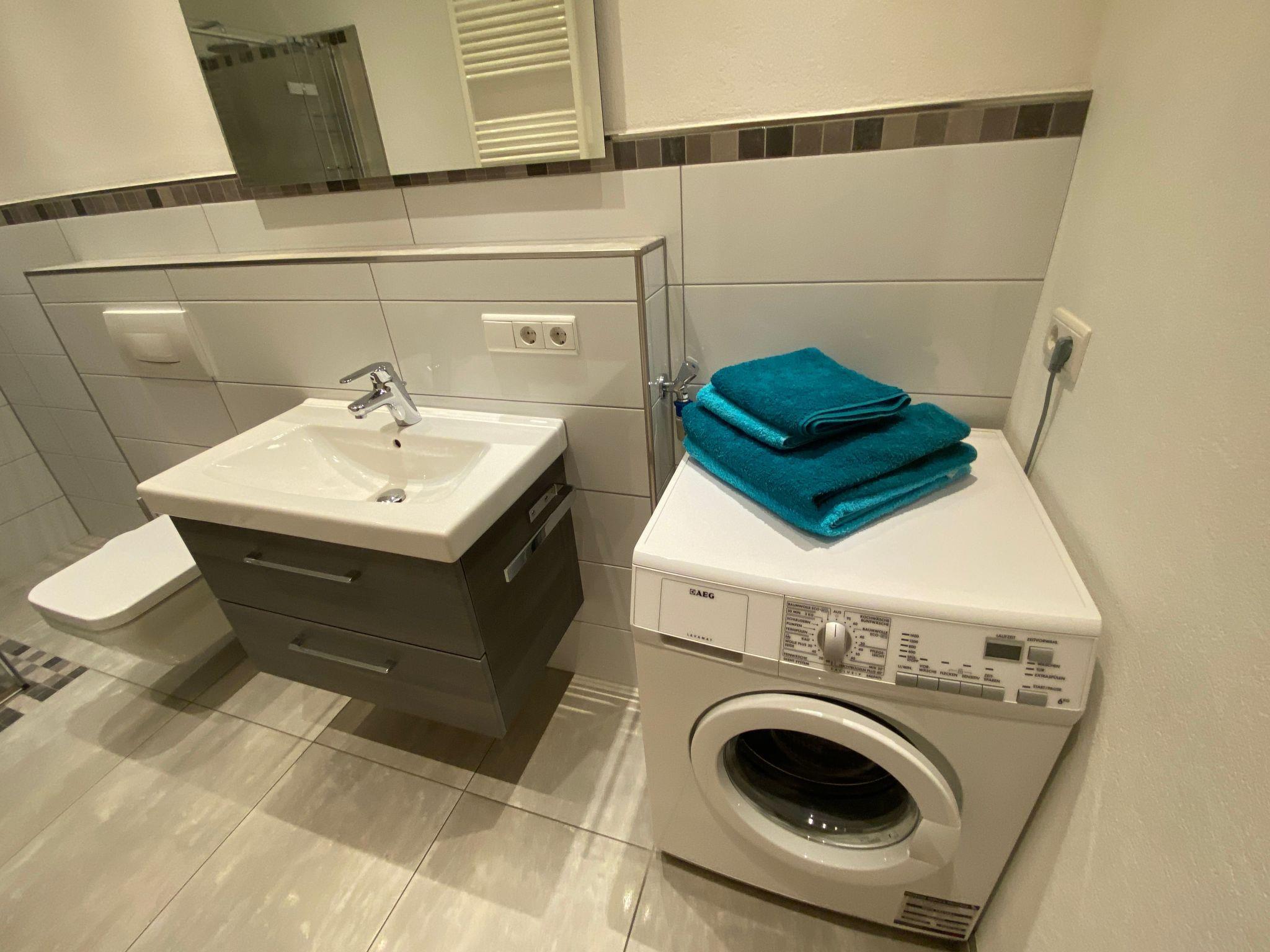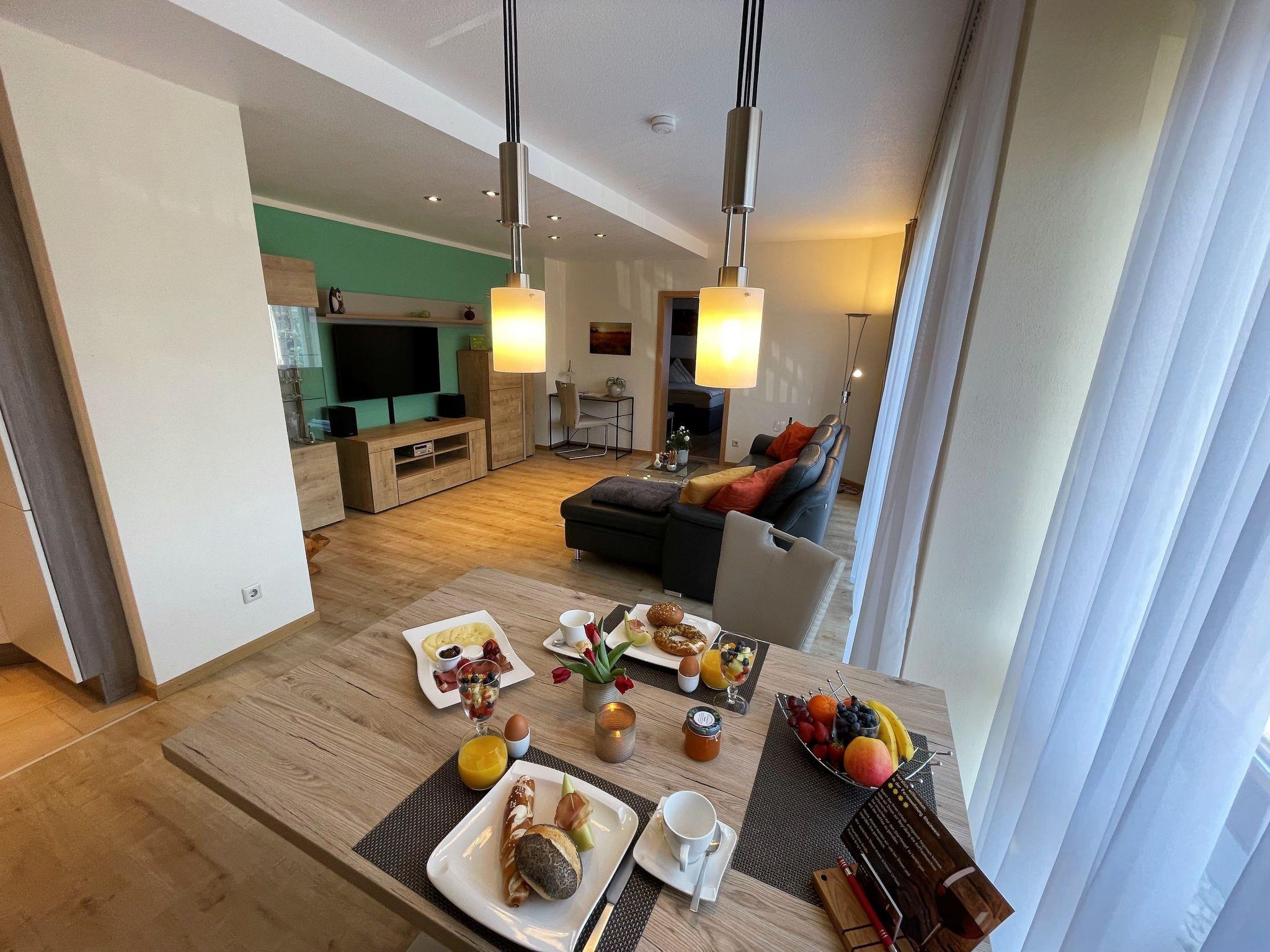 The modern fitted kitchen is equipped with branded built-in appliances, small appliances and stylish crockery and has a spacious dining area with comfortable chairs. There is a cosy dining/living area with a leather seating area and a modern shower room. In the bedroom, an electrically adjustable box-spring bed ensures sleeping comfort and pure relaxation, and a wardrobe with sliding doors and mirror is available for your wardrobe. Facilities in detail:OutsideGroomed outdoor facilities, garden furniture, parasol, beach chair, barrier-free, car park directly in front of the FEWO, paved terrace, storage space for your bicycles and storage space for e-bikes in the property free of charge and e-charging possibility for your car - for a fee - directly at the property. Living area:Dining table with 4 chairs, coffee table, leather couch, side table, modern wall unit, floor lamp. KitchenModern fitted kitchen with granite worktop, oven with top and bottom heat and convection, separate freezer compartment, dishwasher, coffee machine and on request Nespresso capsule machine with milk frother, toaster, kettle, egg cooker, Bosch food processor (on request), dishcloths and tea towels. Sanitary facilitiesModern barrier-free shower room with rainforest shower, washbasin, illuminated mirror, towel dryer, WC, towels, washing machine. Sleeping areaBedroom with electric box-spring bed (0.90m x 2m, 4-door wardrobe, hairdryer, maco satin or jersey bed linen, 2-4 towels and 1 shower towel per person, roller blinds. Extra duvets and microfibre blankets are available in the wardrobe. EntertainmentInternet - free of charge, W-Lan, CD player, hi-fi system with USB input, radio, LCD/LED satellite TV (internet-enabled).