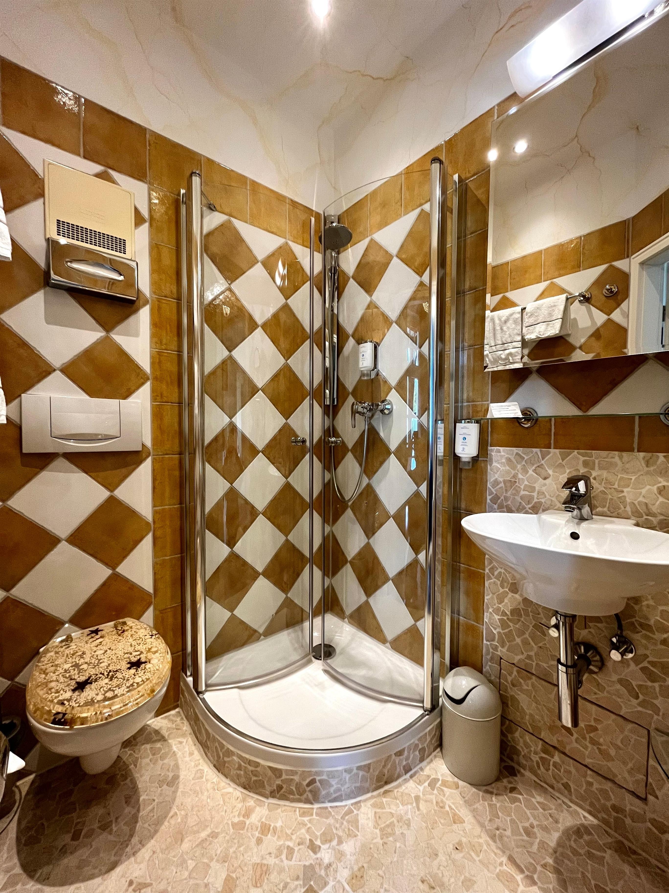 Das Studio verfügt über zwei Balkone, die beide auf den Kurpark ausgerichtet sind. Eine Frühstücksküche mit Geschirr und englische Antiquitäten runden das Angebot des Studios ab. Das Duschbad mit geschmackvollen Keramikfliesen und Marmorboden ist mit Handtüchern und Kosmetikprodukten ausgestattet.
