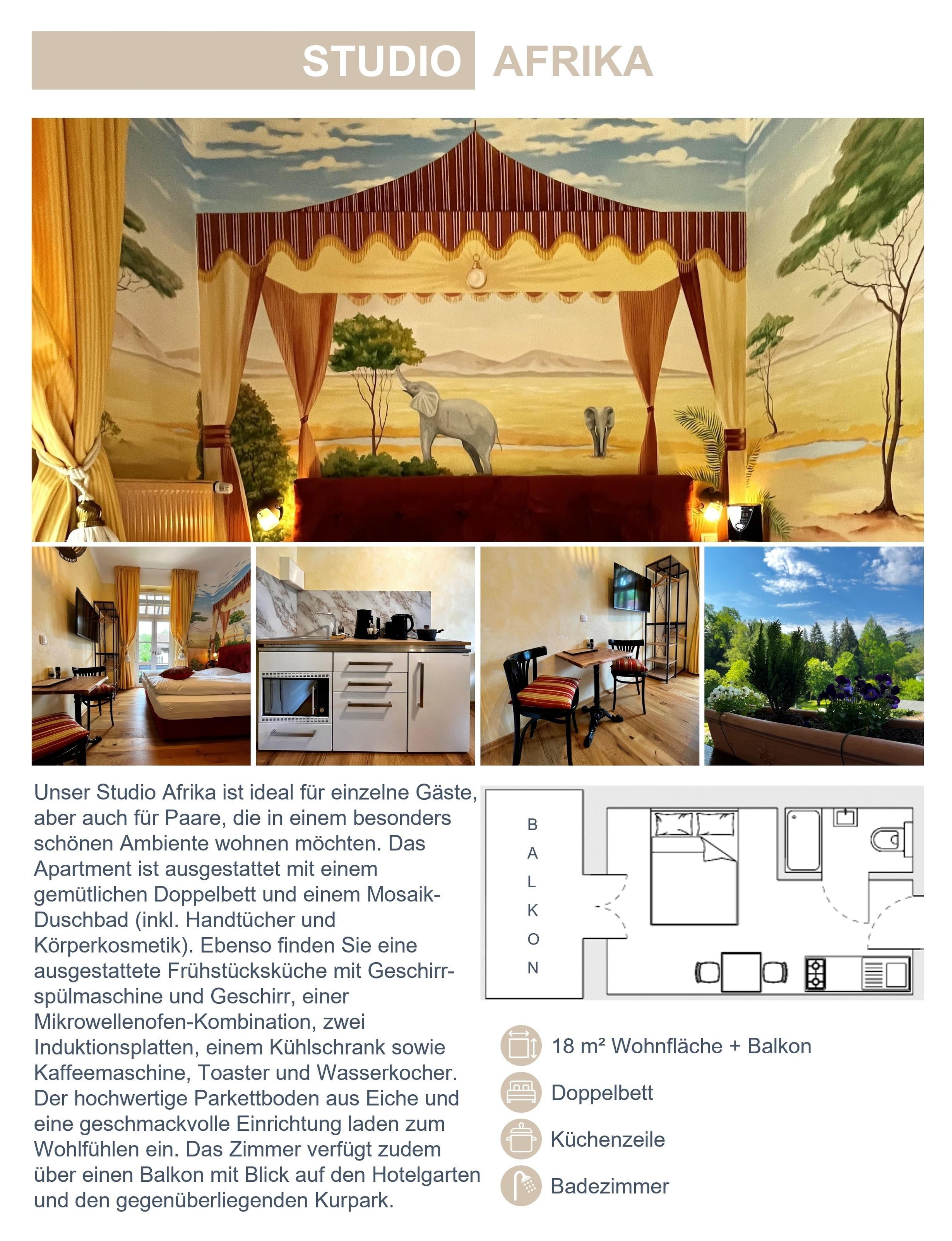 Die PARK VILLA existiert seit 1907 und hat im Laufe ihres Bestehens Zeitgeschichte erlebt und geschrieben. Wir suchten nach einer Möglichkeit, unserer schönen PARK VILLA eine neue Zukunft zu geben. Mit großer Freude dürfen wir Ihnen heute unsere neuen Apartments vorstellen, die von 1 bis 6 Personen buchbar sind. Alle unsere Apartments und Zimmer sind alle liebevoll gestaltet und wir haben unser beliebtes Themenkonzept beibehalten. Die Apartements sind mit kleinen Küchen ausgestattet, sodass unsere Gäste in Zukunft ausschlafen und in Ruhe ihr Frühstück auf ihrem Zimmer zubereiten können. Die neuen Küchen verfügen über einen Kühlschrank, ein Induktionskochfeld, einen Geschirrspüler, eine Mikrowellen/Ofen Kombi und sind mit einer Senseo-Kaffeemaschine, einem Toaster und einem Wasserkocher und Geschirr ausgestattet. Bei den Renovierungsarbeiten haben wir darauf geachtet, dass der in unserer Villa so geschätzte Stil erhalten bleibt.