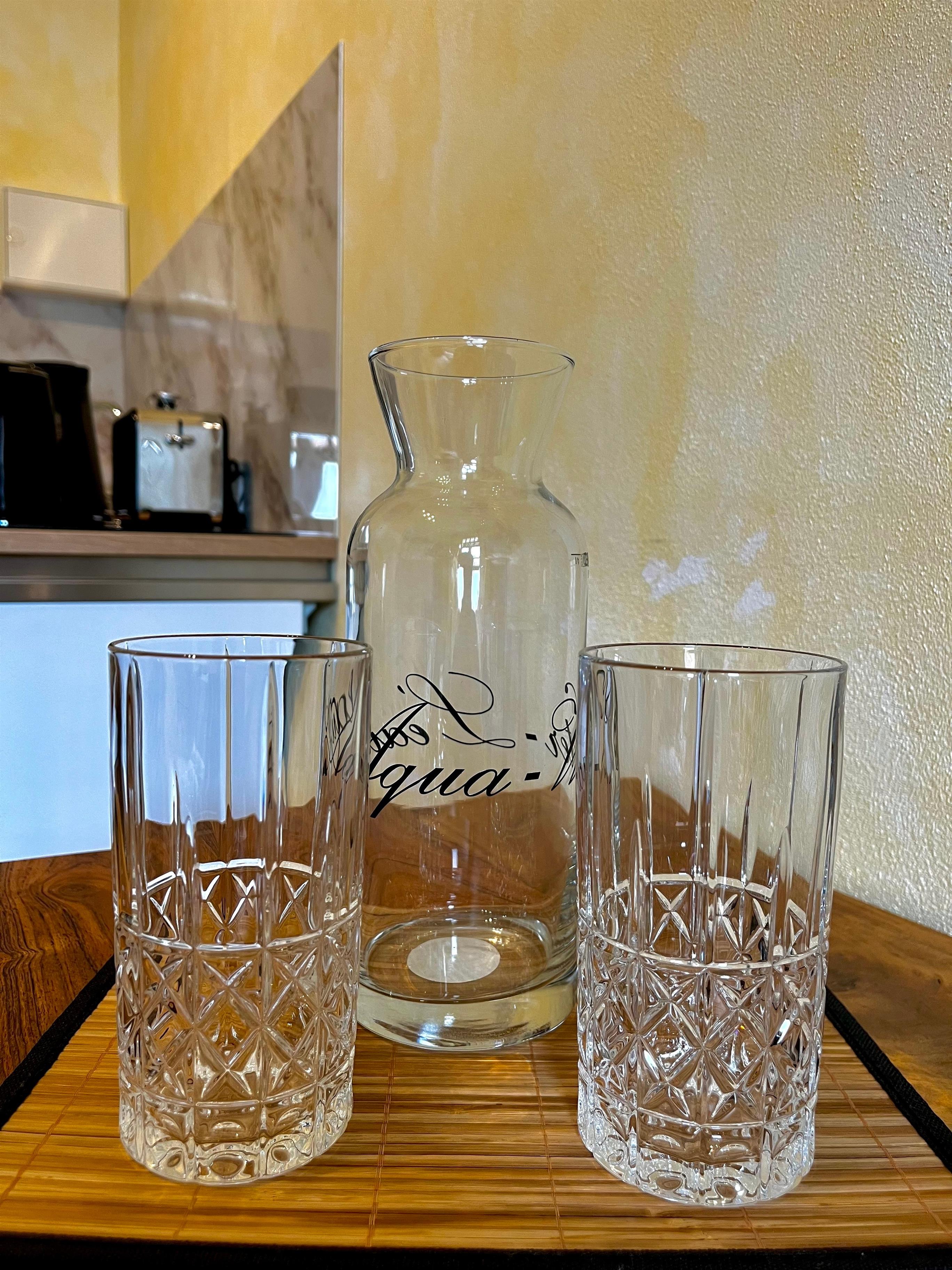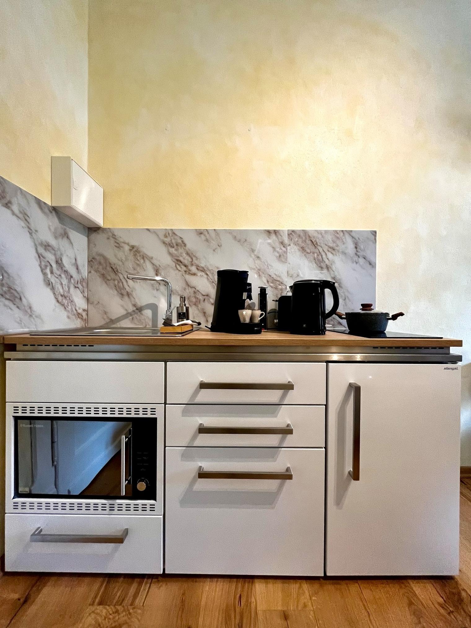 Frühstücksküche mit Geschirrspüler, Mikrowelle-Ofenkombi, zwei Induktionsplatten, Kühl/Gefrierkombi, Toaster, Senseo-Kaffeemaschine und Wasserkocher, Geschirr