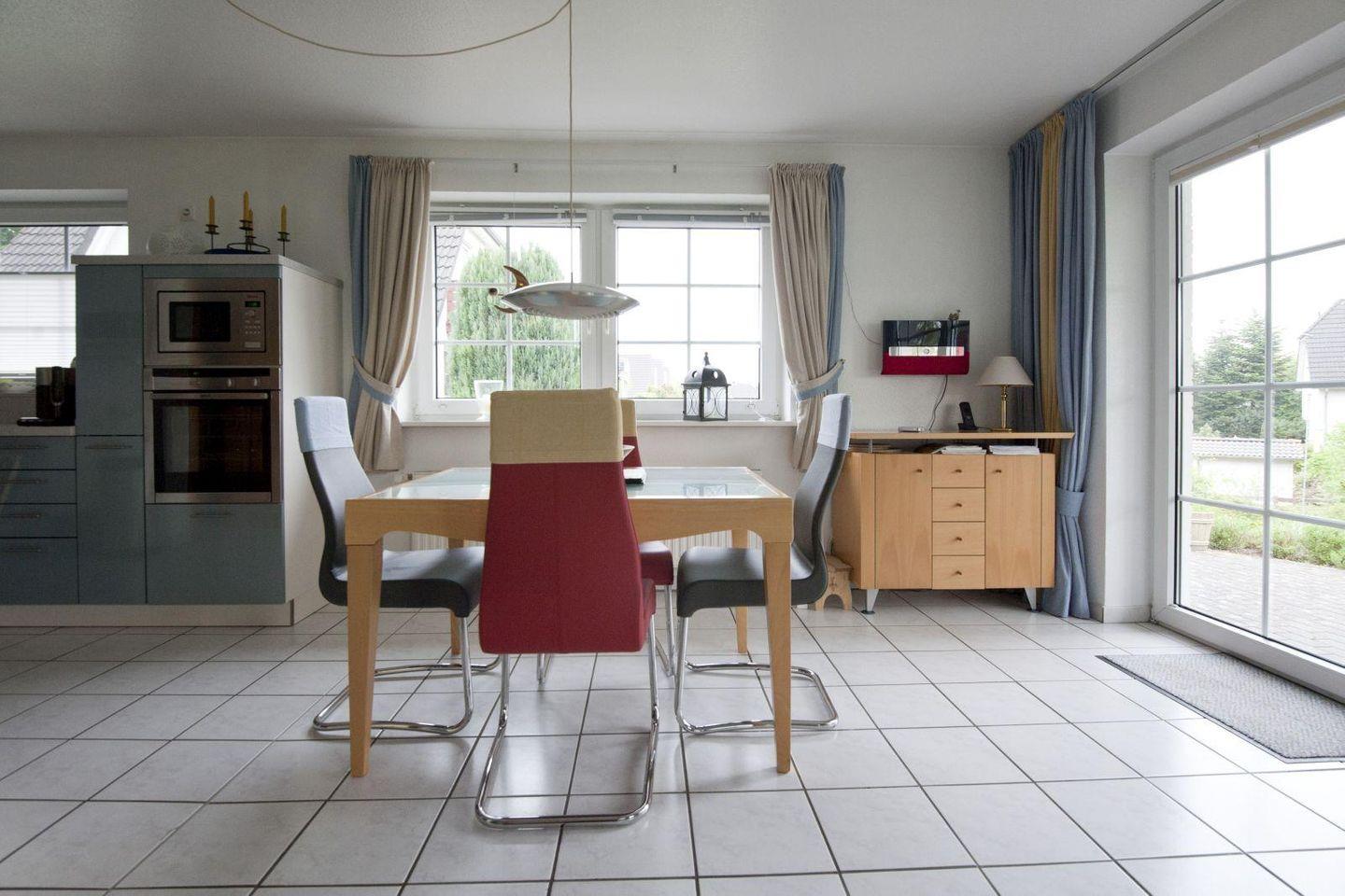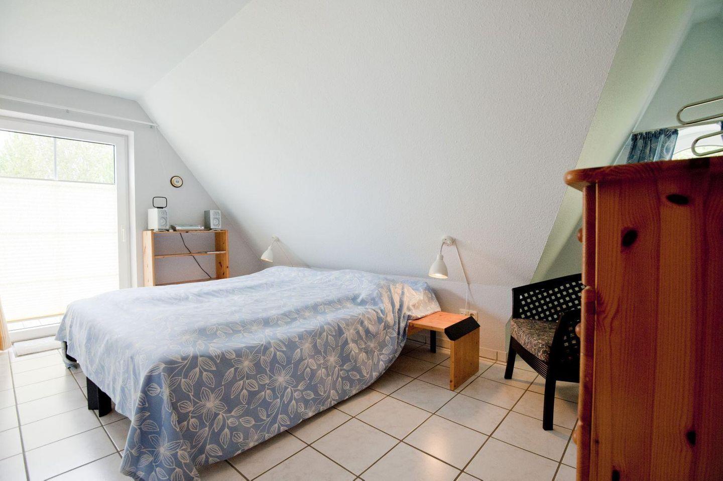 Von der Terrasse aus genießen Sie den Blick auf die Schlei. Im Obergeschoss sind die Schlafräume und ein Bad mit Wanne und Bidet.
