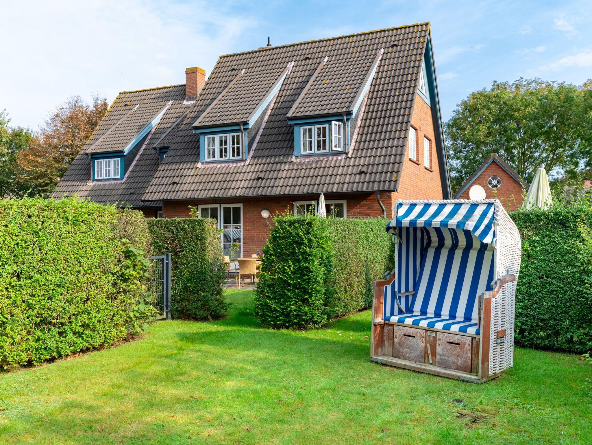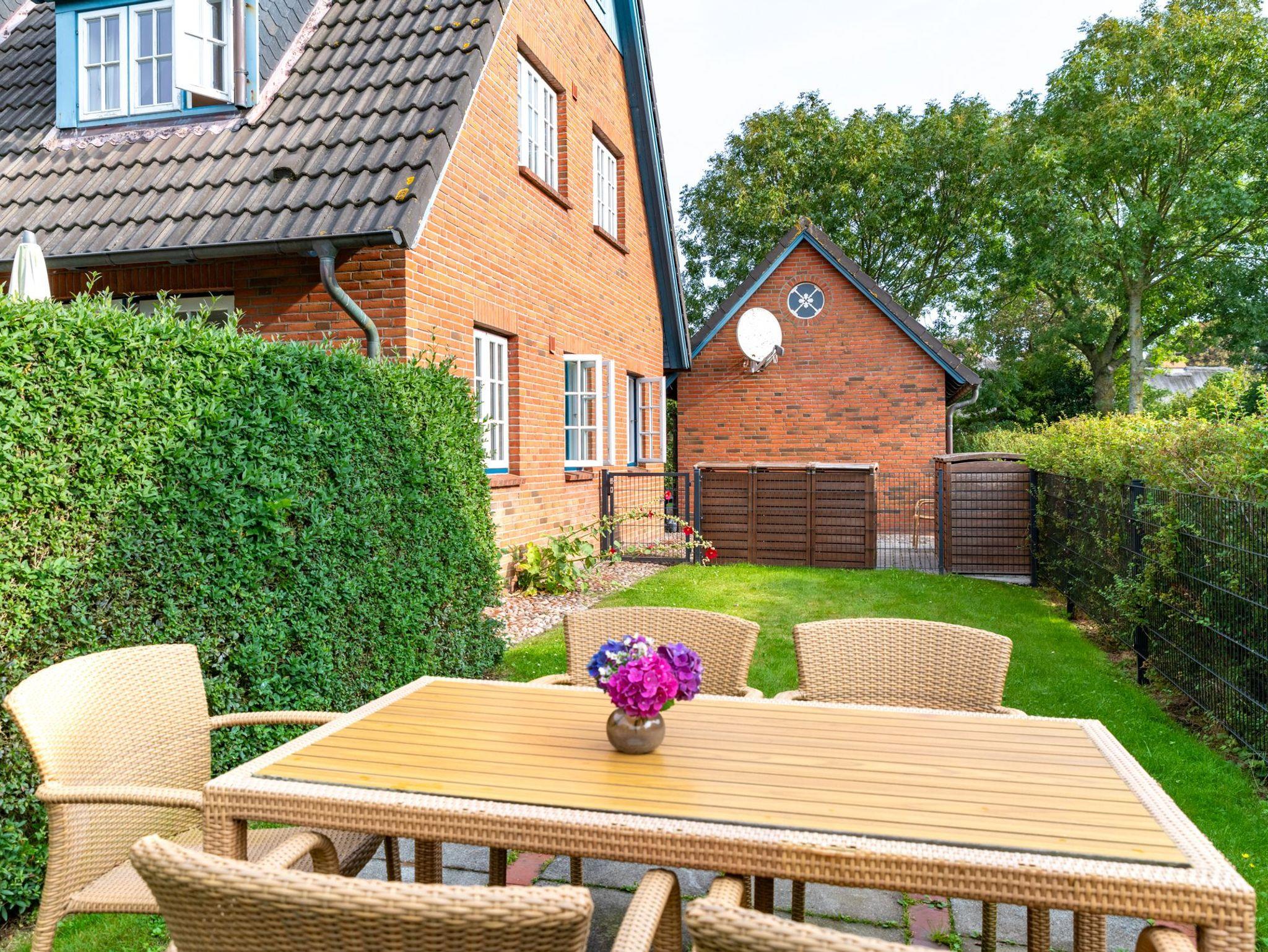 Zur Wohnung gehört ein kleiner Garten mit Essgruppe, Sonnenliegen und einem Strandkorb. Waschmaschine und Trockner sind gegen Gebühr gemeinschaftlich nutzbar. Vor dem Haus befindet sich ein großzügiger Parkplatz, Abstellmöglichkeiten für Fahrräder sind vorhanden. Hinter dem Haus liegt der großzügige und gepflegte Garten.