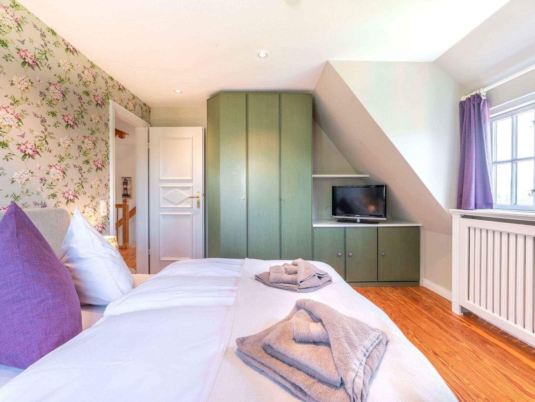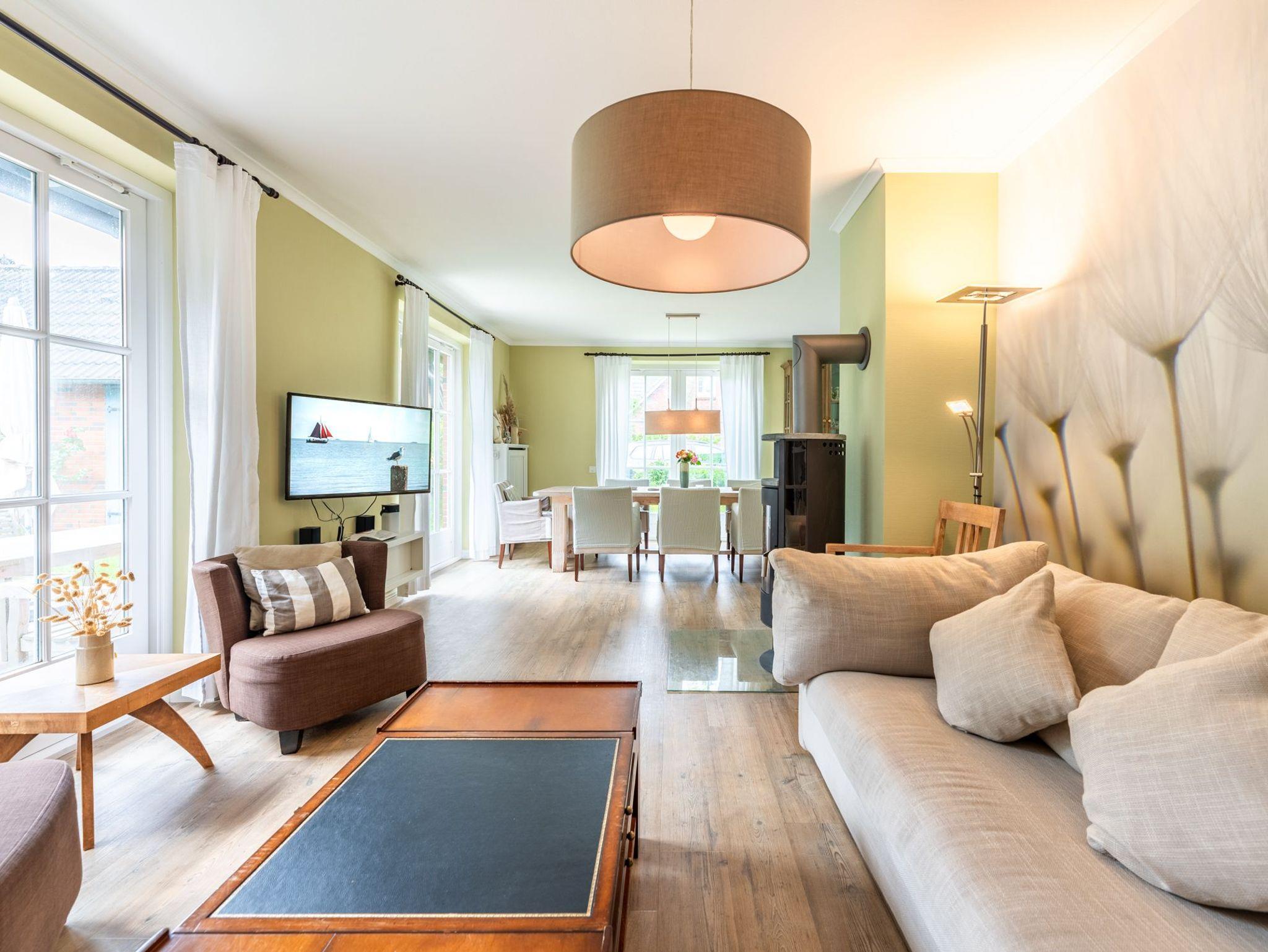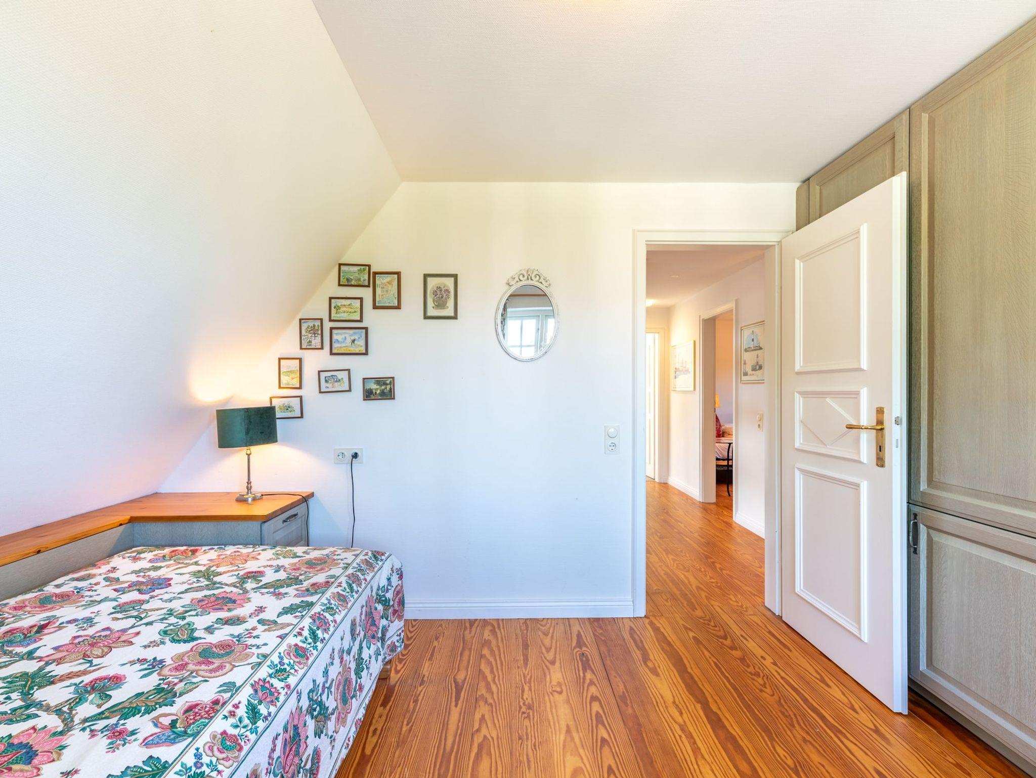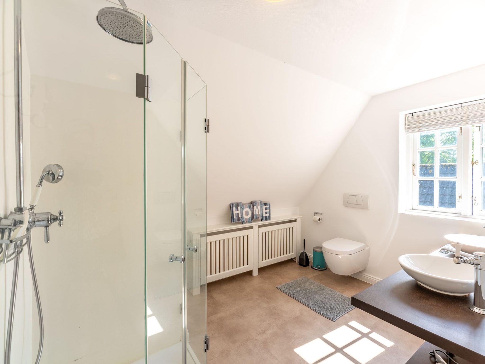 Im Erdgeschoss befindet sich der große Koch-, Wohn- und Essbereich und ein großes Duschbad mit WC. Vom Wohnzimmer hat man einen direkten Zugang zur Terrasse, welche mit Terrassenmöbeln und Strandkorb ausgestattet ist sowie den dazugehörigen großen Gartenanteil. Im ersten Stock befindet sich ein Doppelzimmer mit TV, ein Einzelzimmer mit TV, ein weiteres Einzelzimmer und ebenfalls ein großes Duschbad mit WC. Im zweiten Stock befindet sich ein weiteres Doppelzimmer mit TV und ein Schlafraum mit 3 Einzelbetten.