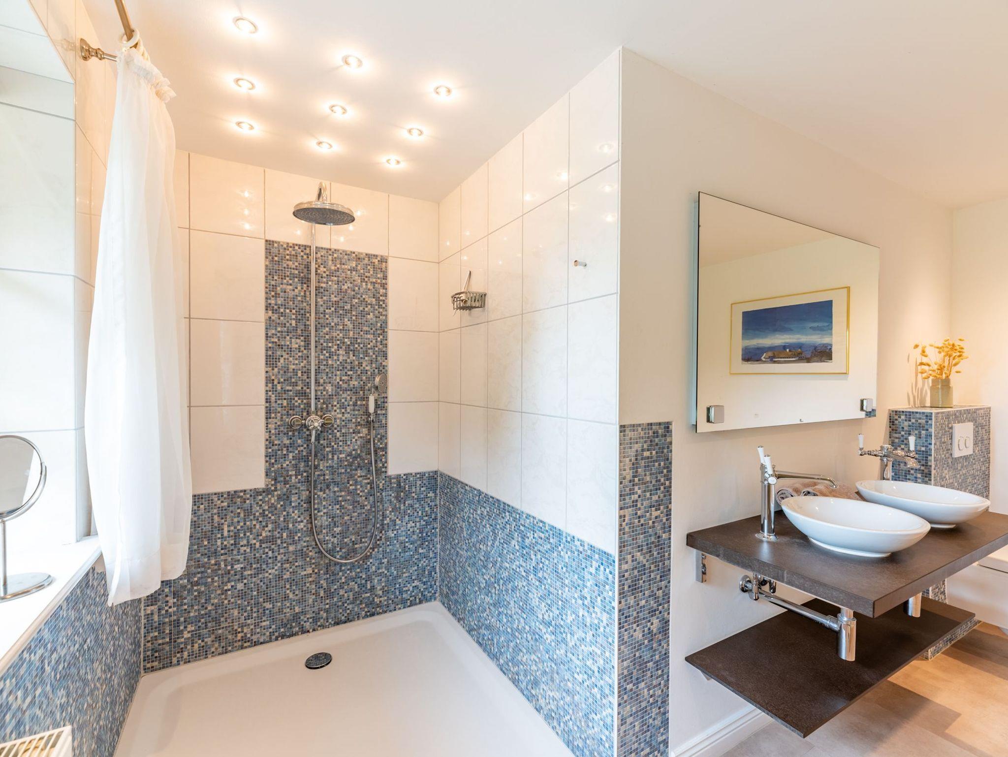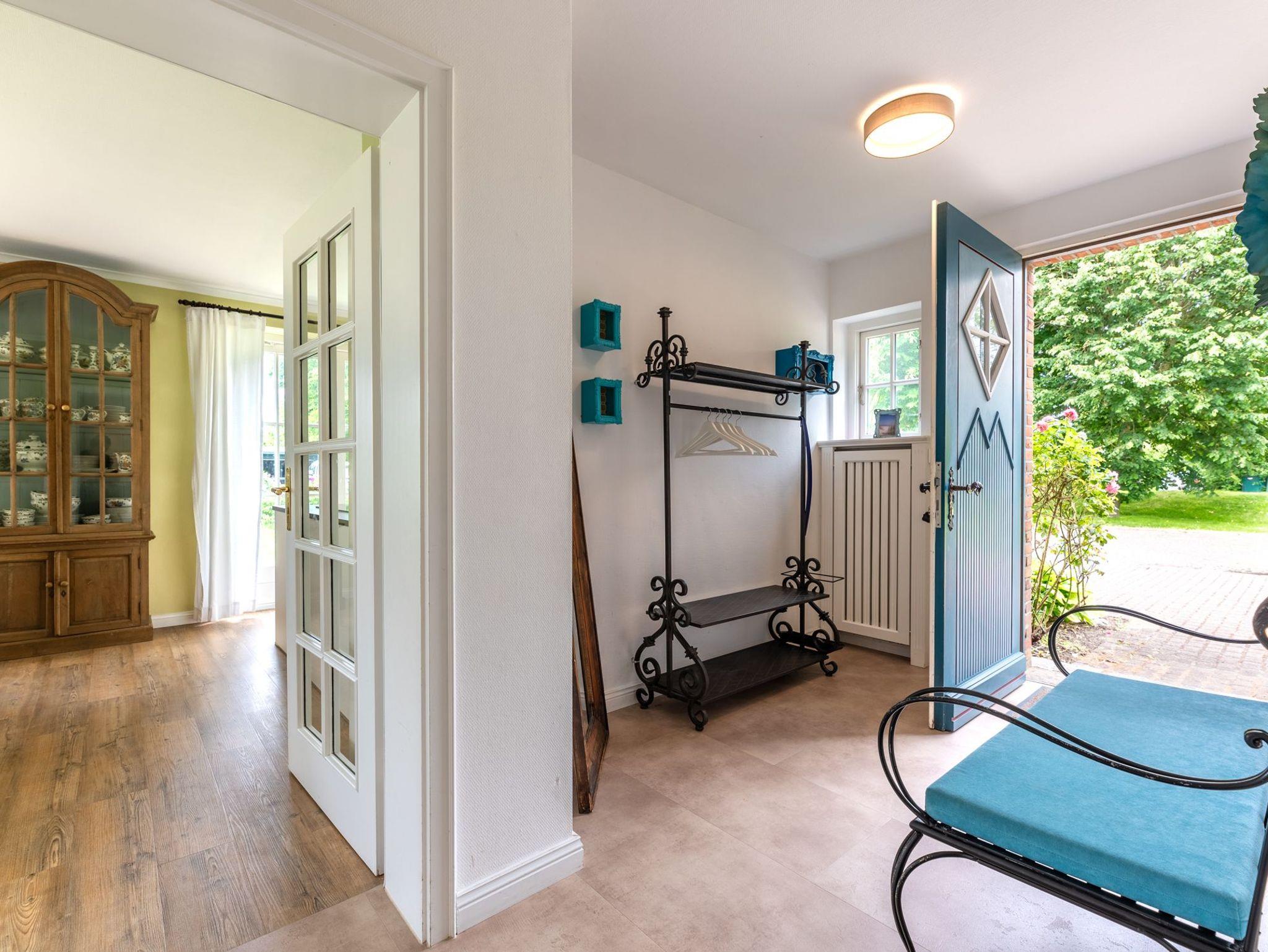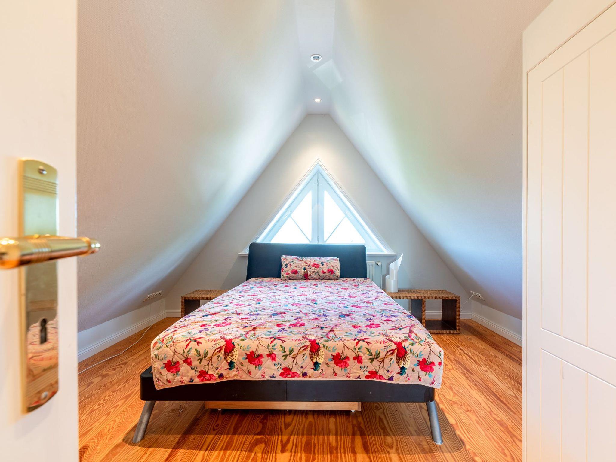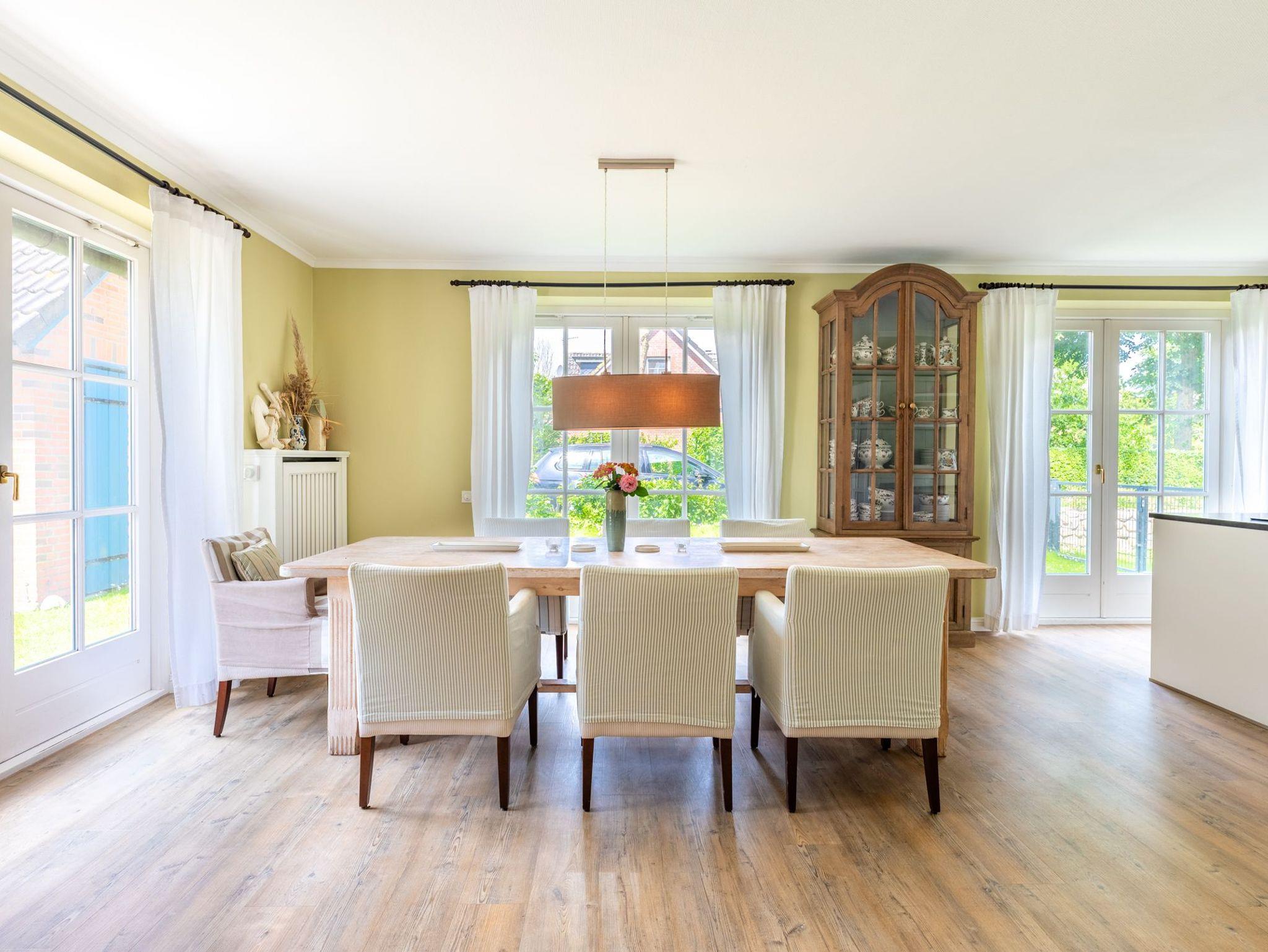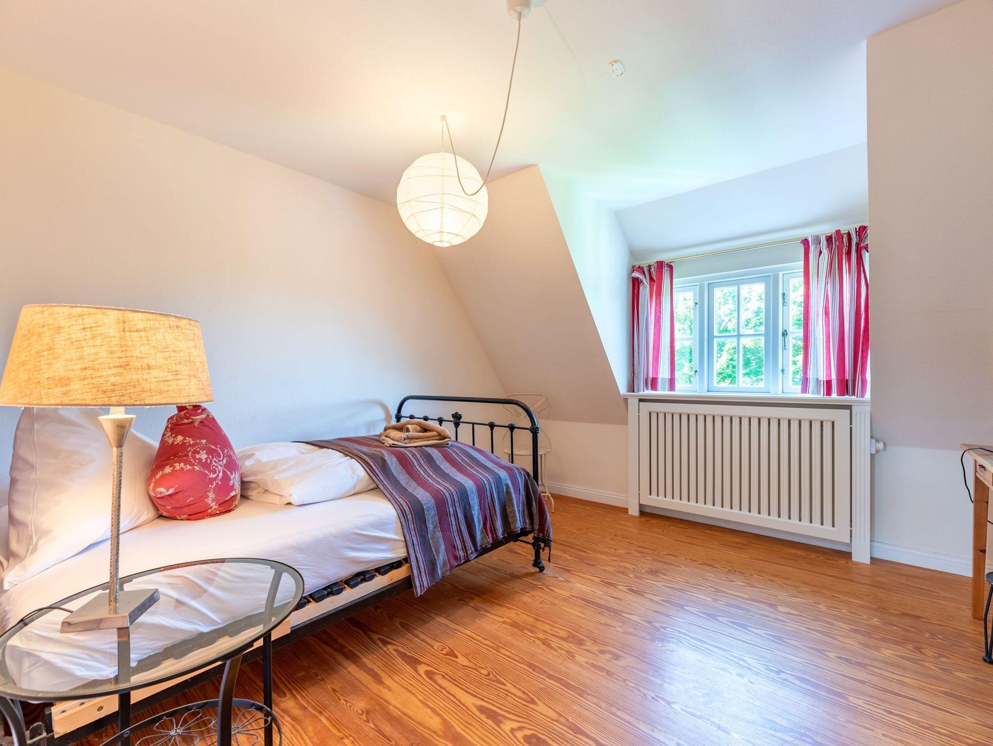 Im Erdgeschoss befindet sich der große Koch-, Wohn- und Essbereich und ein großes Duschbad mit WC. Vom Wohnzimmer hat man einen direkten Zugang zur Terrasse, welche mit Terrassenmöbeln und Strandkorb ausgestattet ist sowie den dazugehörigen großen Gartenanteil. Im ersten Stock befindet sich ein Doppelzimmer mit TV, ein Einzelzimmer mit TV, ein weiteres Einzelzimmer und ebenfalls ein großes Duschbad mit WC. Im zweiten Stock befindet sich ein weiteres Doppelzimmer mit TV und ein Schlafraum mit 3 Einzelbetten.