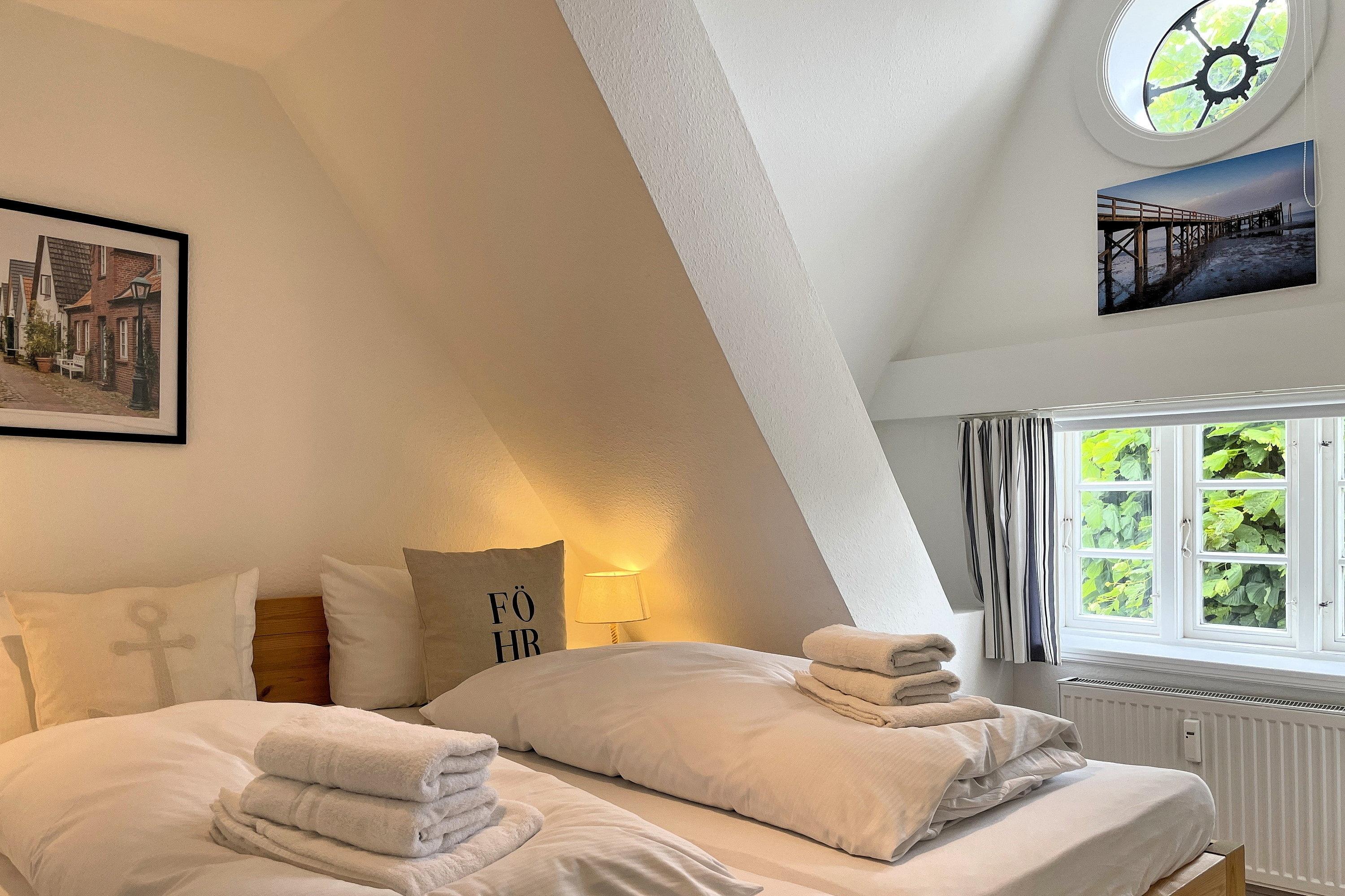 Im ruhigen Inseldorf Borgsum befindet sich der restaurierte Friesenhof Taarepswoi. Auffallend hübsch hebt sich das rote Gebäude mit Reetdach von dem großzügigen, gepflegten Außengelände mit mehreren Terrassensitzplätzen und dem Fahrradunterstellplatz ab. Unsere Wohnung befindet sich im Obergeschoss und eignet sich für 2 bis 3 Gäste hervorragend für erholsame Urlaubstage. Der Wohnraum dieser hübschen 43 qm großen Ferienwohnung ist unterteilt in einen gemütlichen Essplatz mit gut ausgestatteter Küchenzeile und einer bequemen Sitzecke mit Schlafsofa (140 x 195 cm), WLAN, Flachbild-TV und Stereoanlage. Eine kleine Auswahl an Urlaubslektüre steht ebenfalls für Sie bereit. Das Schlafzimmer im Giebelzimmer ist behaglich eingerichtet und verfügt über ein Doppelbett (180 x 200 cm). Das hellgeflieste Bad mit Dusche und Fenster ist geräumig und bietet genügend Stellfläche für Ihre Kosmetiksachen. Die vielen, kleinen Fenster sind typisch für Föhrer Friesenhäuser und verleihen- ebenso wie die liebevoll ausgesuchte Dekoration- dieser Wohnung eine freundlich- friesische Atmosphäre. Im Sommer können unsere Gäste auf dem Terrassensitzplatz im Garten herrliche Sonnenstunden genießen. Ihr gut erzogener Hund ist ebenfalls Willkommen. Den PKW können Sie auf dem gemeinschaftlich, nutzbaren Parkplatz direkt vor dem Haus abstellen. Schräg gegenüber befindet sich der Landbäcker und nebenan ein Fahrradverleih. Weiterhin bietet Borgsum ein nettes Restaurant mit guter Hausmannskost, die Borgsumer Mühle, das Erdbeerfeld zum Selberpflücken, das Maislabyrinth mit einem Adventure-Minigolfplatz und nicht zu vergessen die bekannte Lembecksburg, jetzt ein Ringwall aus der vergangener Zeit.