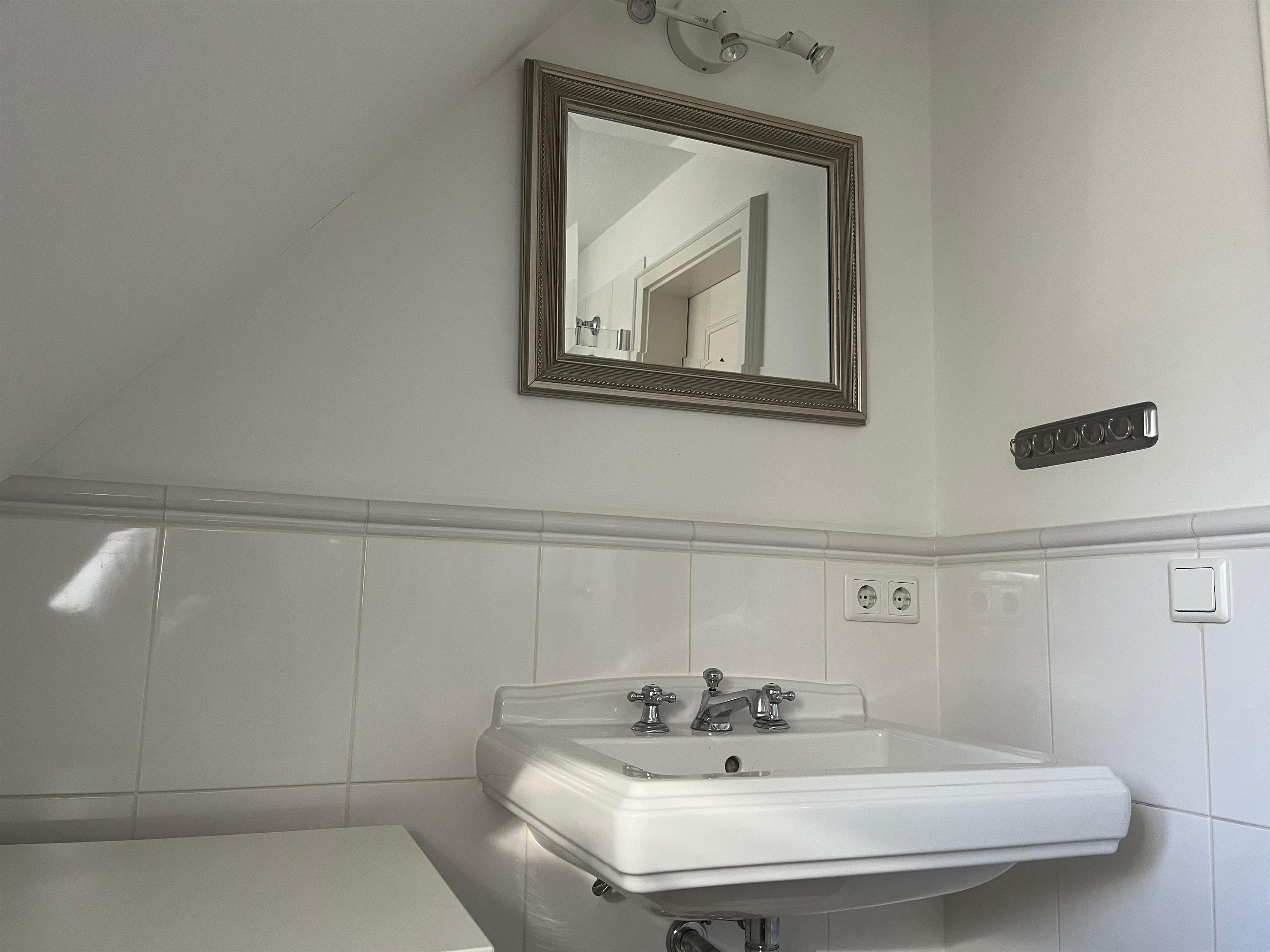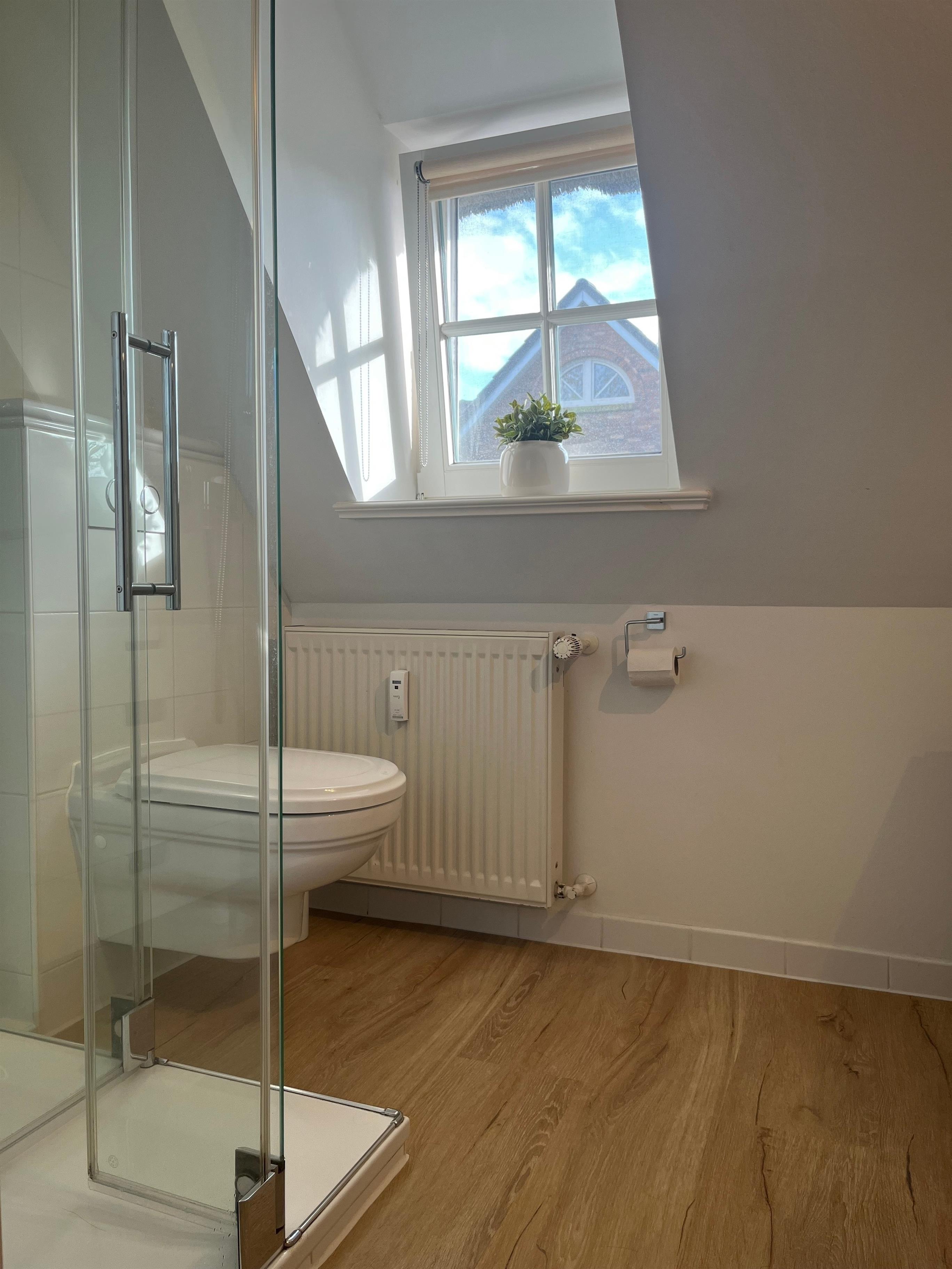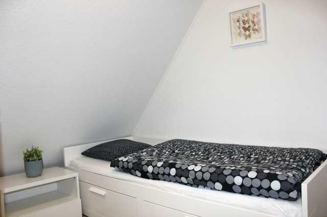 Im ersten Obergeschoss befinden sich das Badezimmer mit Duschbad, ein Flur sowie das Schlafzimmer mit Doppelbett und großem Schrank. Über eine Treppe gelangen Sie in ein weiteres Schlafzimmer mit zwei Einzelbetten. Dieser Spitzbodenbereich ist als offene gemütliche Galerie gestaltet.