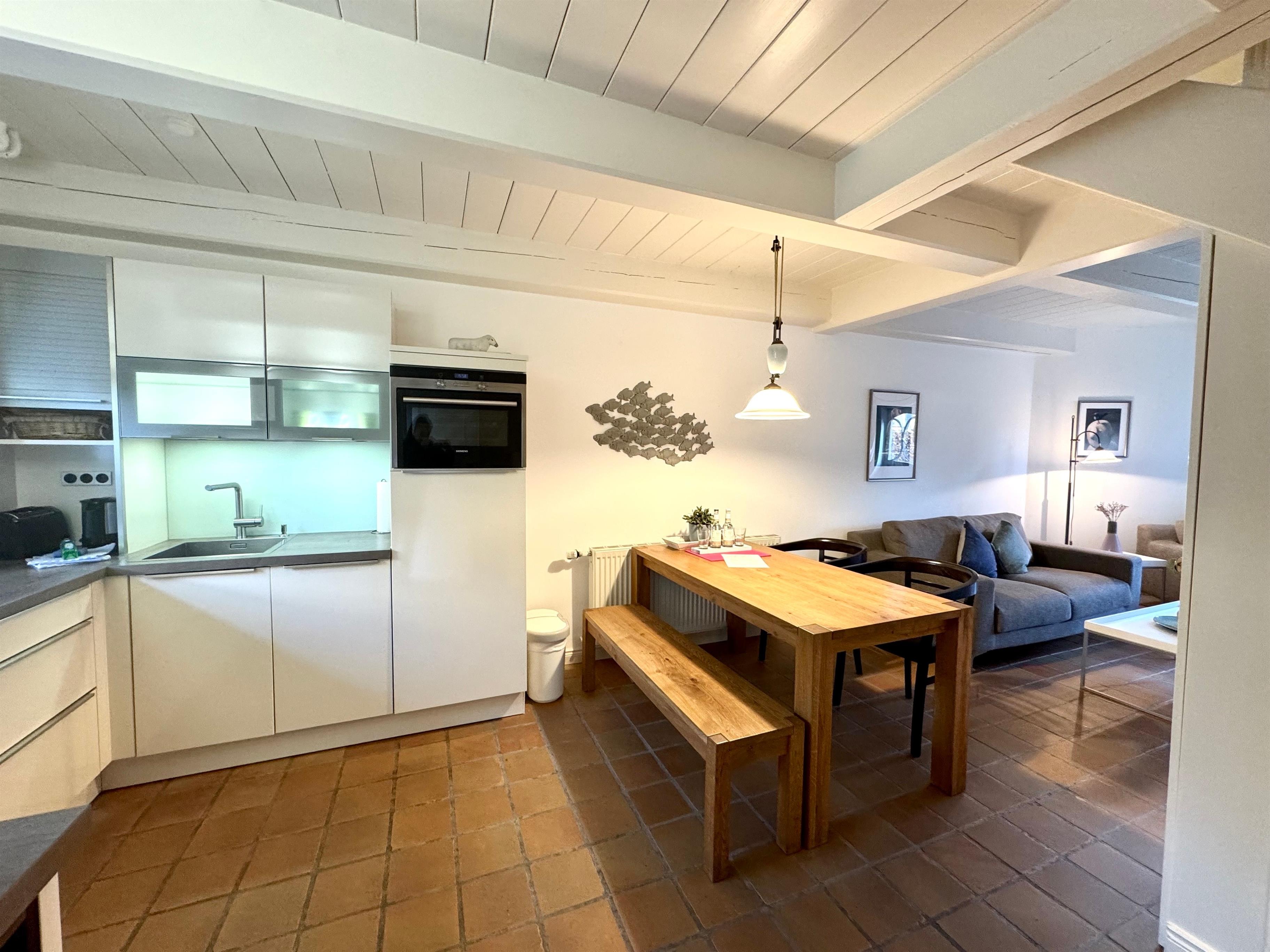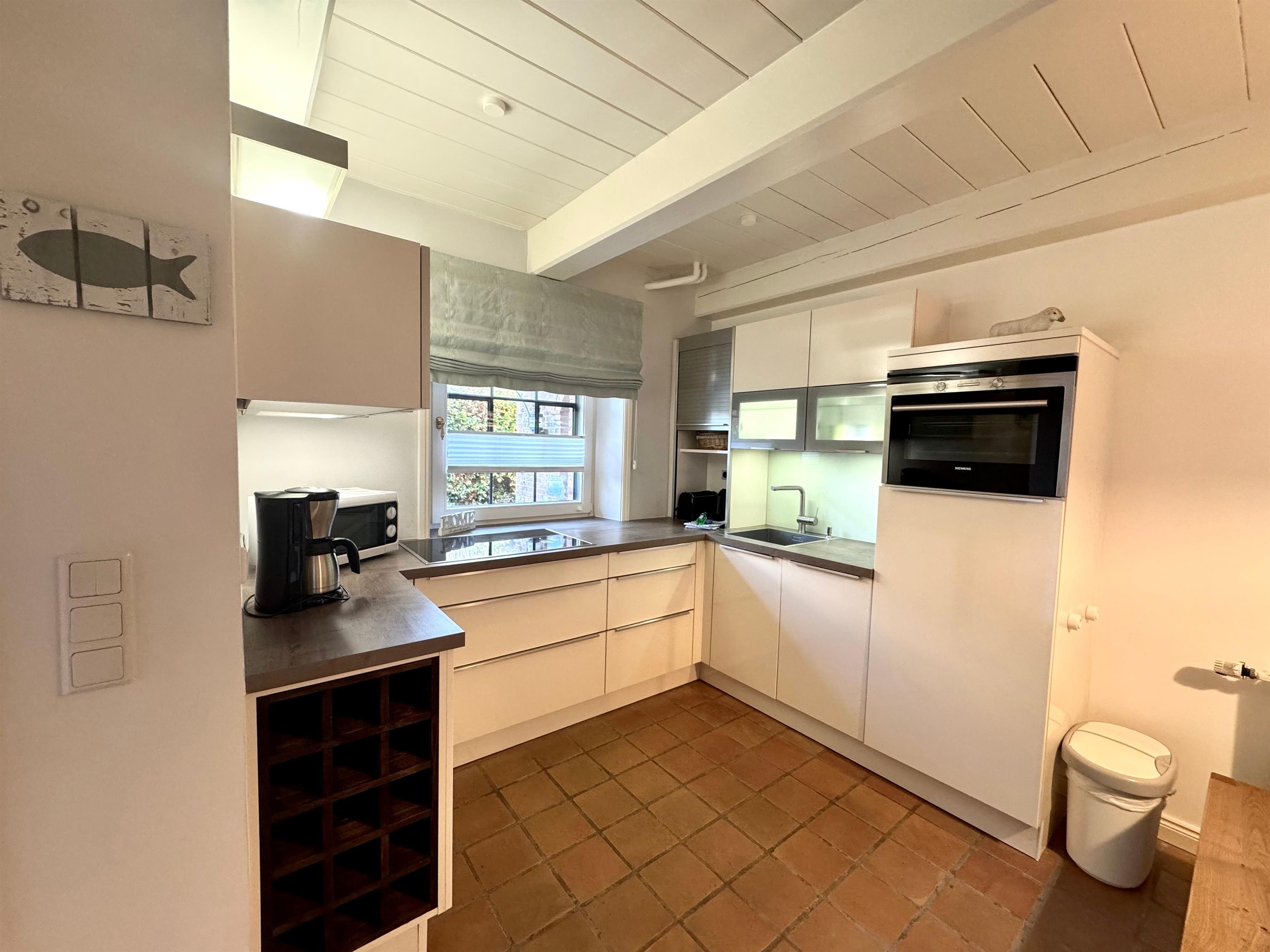 Die gemütlich eingerichtete Wohnung verbindet auf ca. 65 m² modernen Komfort mit historischem Ambiente. Über die Eingangsdiele erreichen Sie die offene Wohnküche (ausgestattet mit Geschirrspüler, Backofen/Mikrowelle) mit angrenzendem Wohnbereich. Von hier haben Sie direkten Zugang zur sichtgeschützten Westterrasse. Gegenüber der Eingangstür finden Sie eine weitere Terrasse mit Strandkorb.