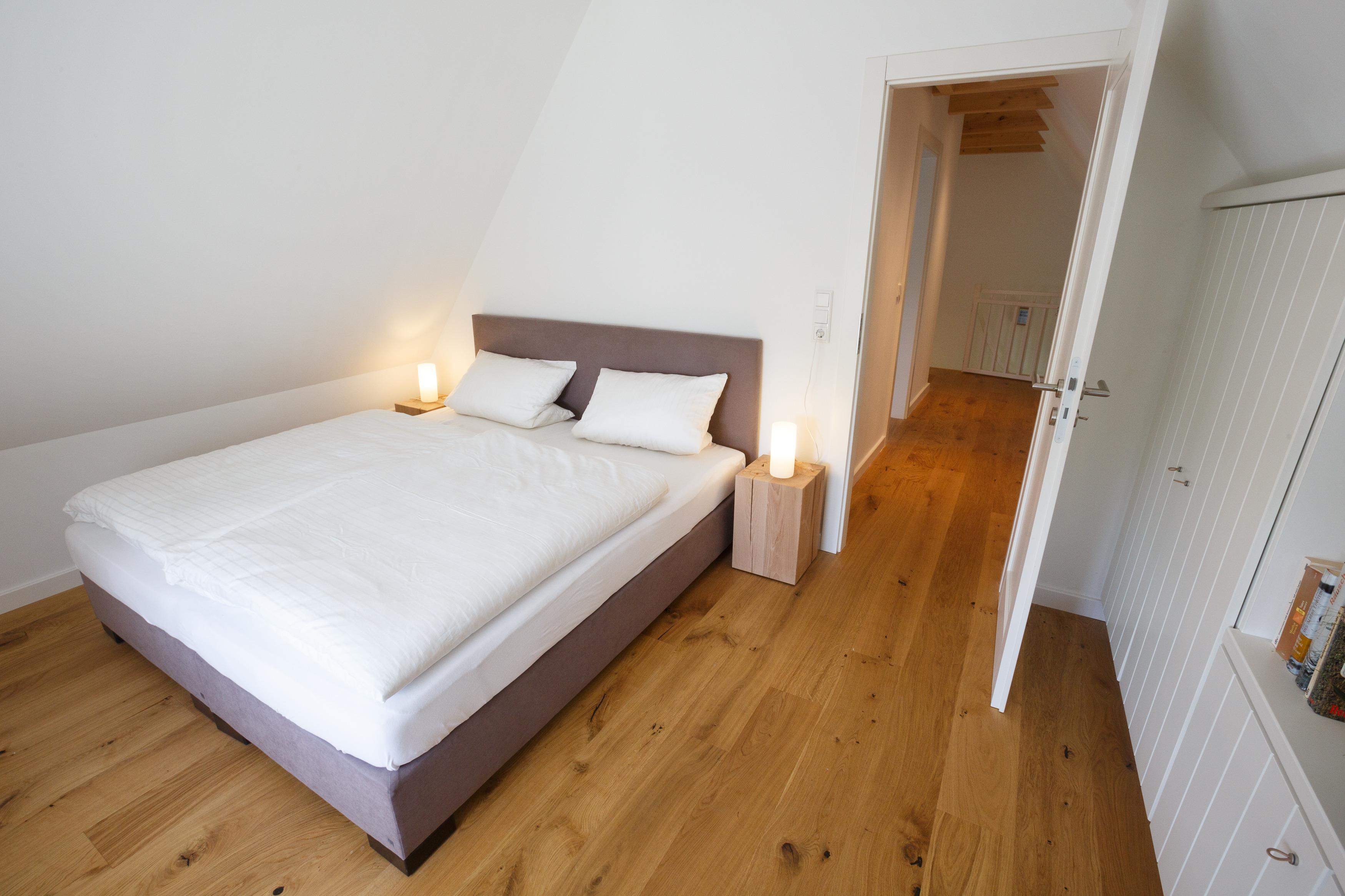 Es handelt sich um eine ca. 95 qm große Ferienwohnung über zwei Etagen mit zwei Schlafzimmern und einer Schlafkajüte. Ein Schlafzimmer mit Doppelbett findet man im Erdgeschoss. Entlang dem Flur mit Garderobe und Gäste-WC gelangt man in die komfortabel ausgestattete, offene Küche mit großem Esstisch und das anschließende, helle und moderne Wohnzimmer.Über eine breite Holztreppe erreicht man das Obergeschoss. Dort befindet sich ein großes Doppelbett-Schlafzimmer, ein großzügiges Duschbad und eine abtrennbare Schlafkajüte von 1,40 Meter Breite, die ideal für Kinder ist.