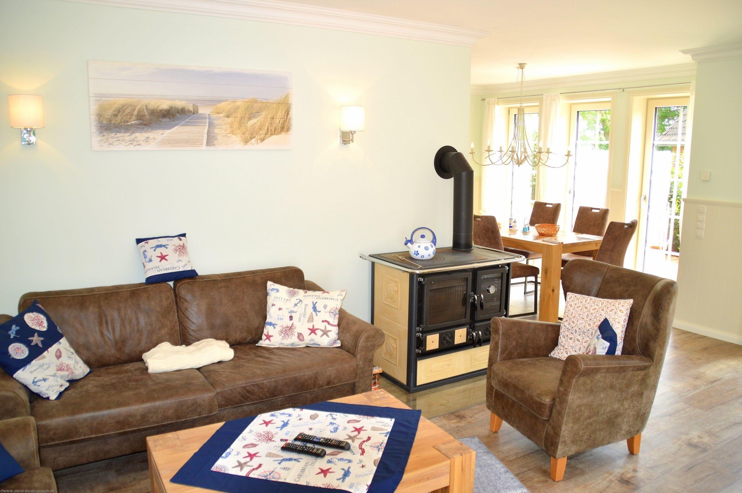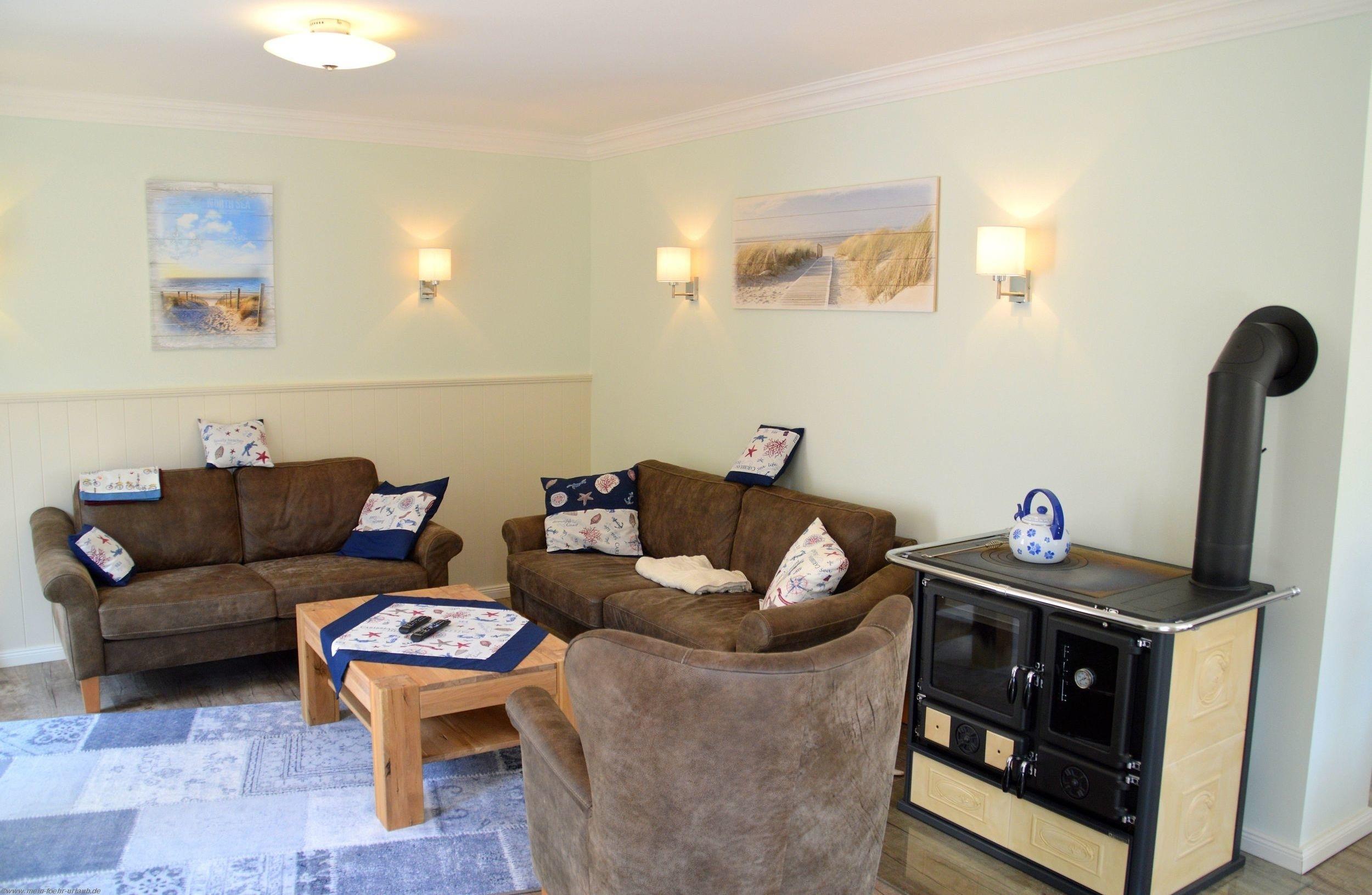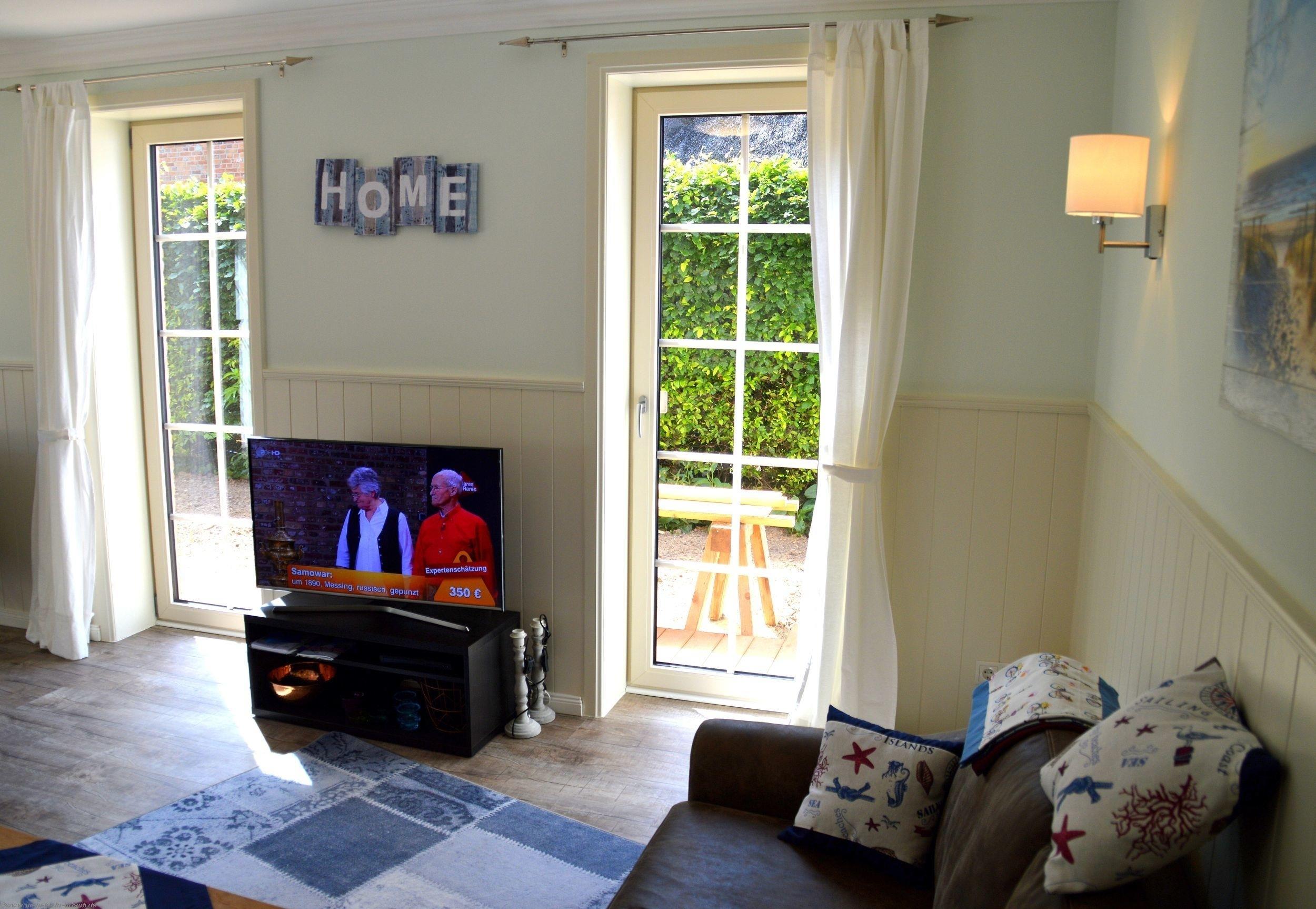 Vom Wohnbereich haben Sie auch einen direkten Zugang auf die Süd- und Westterrasse mit Gartenmöbeln, Strandkorb. In der vollausgestatteten Küche finden Sie unter anderem: Geschirrspüler, Mikrowelle, Umluftherd mit Cerankochfeld, Kühlschrank mit Gefrierfach, Toaster, Handrührer, Wasserkocher, Kaffeemaschine und allerei Pütt und Pann zum Kochen und Backen. Das Geschirr und Besteck ist in ausreichender Zahl vorhanden.