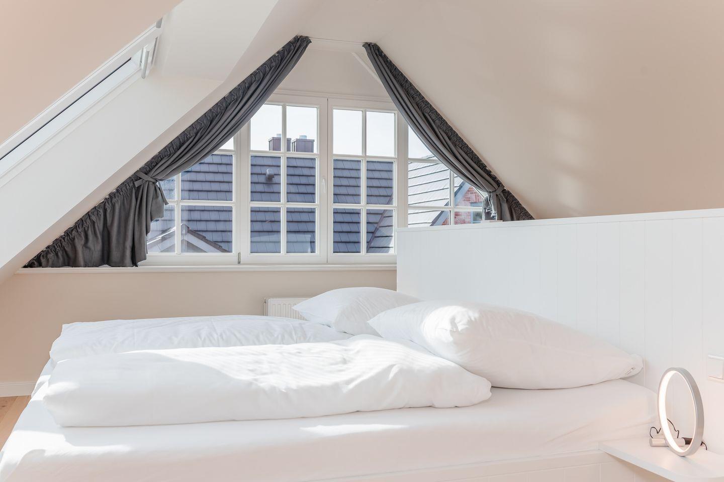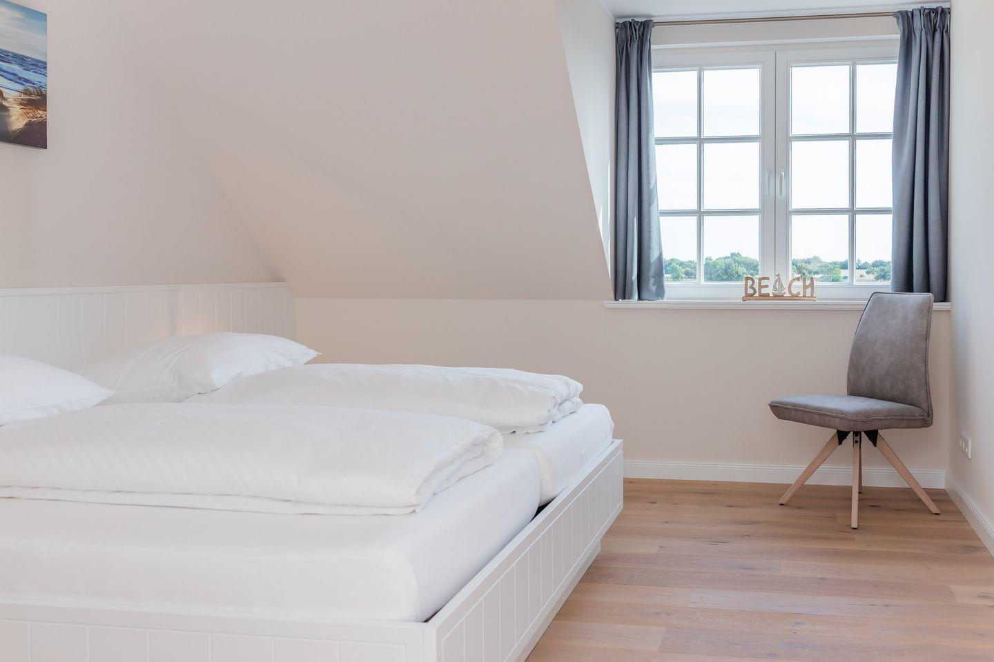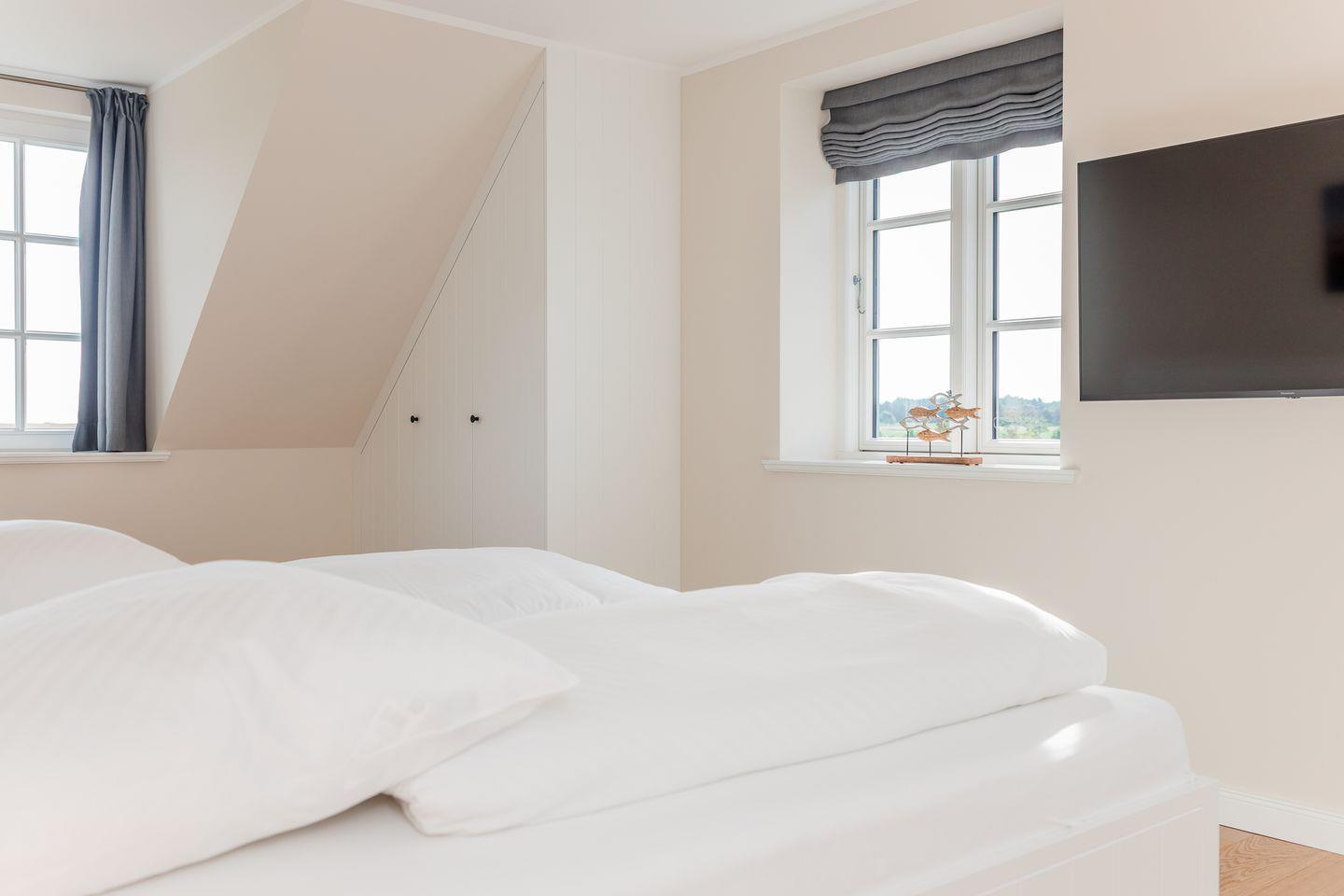 Das Dachgeschoss stellt ein Highlight der Unterkunft dar. Es ist als großzügiges drittes Schlafzimmer eingerichtet und bietet über die große Fensterfront einen herrlichen Blick über Felder bis zur Nordsee.