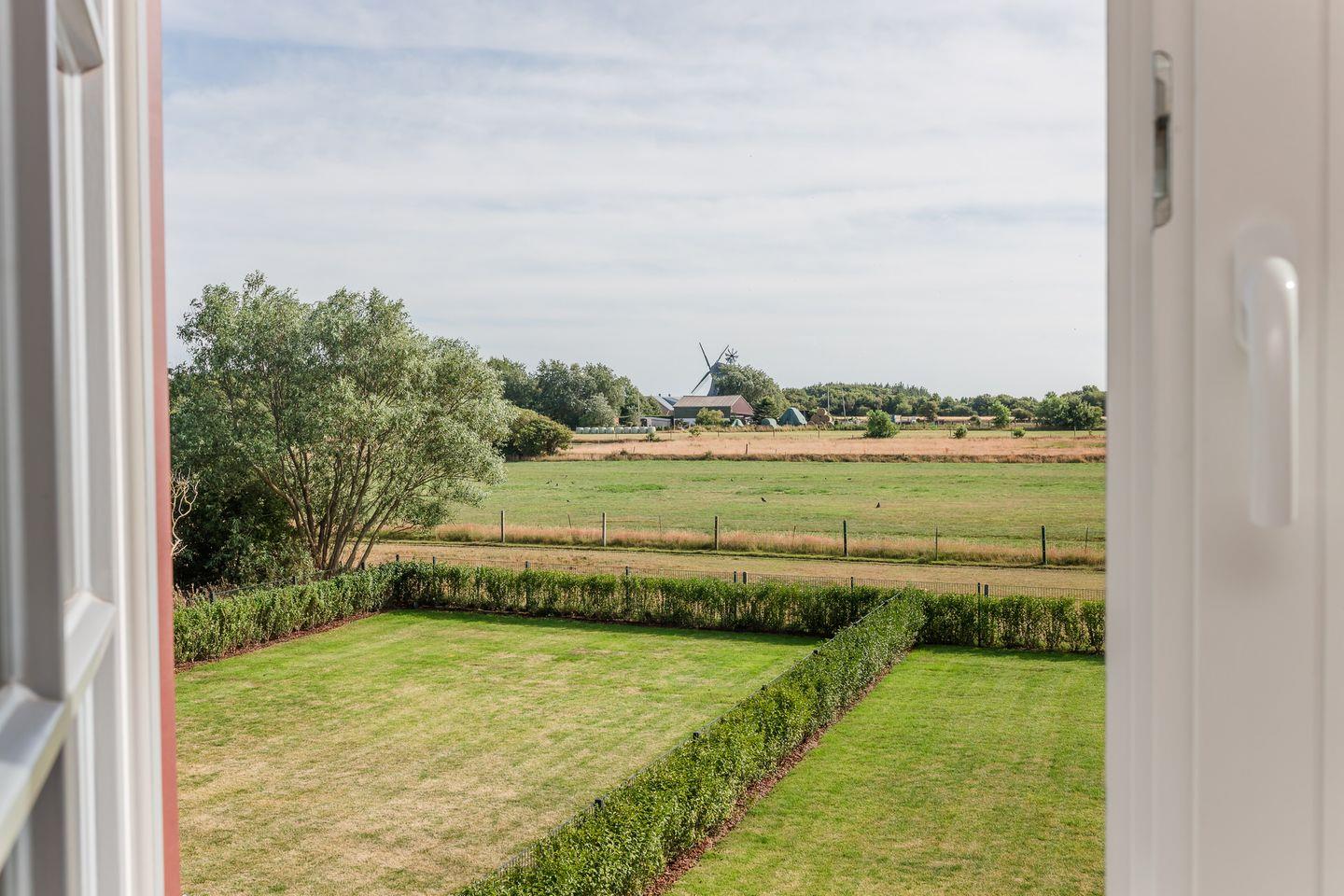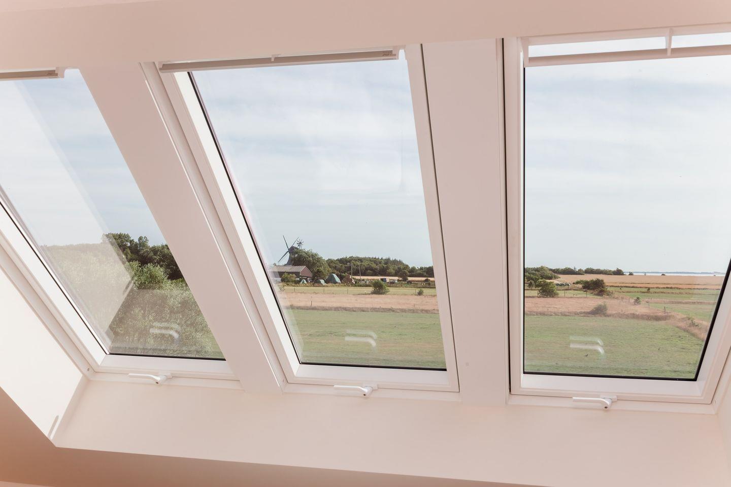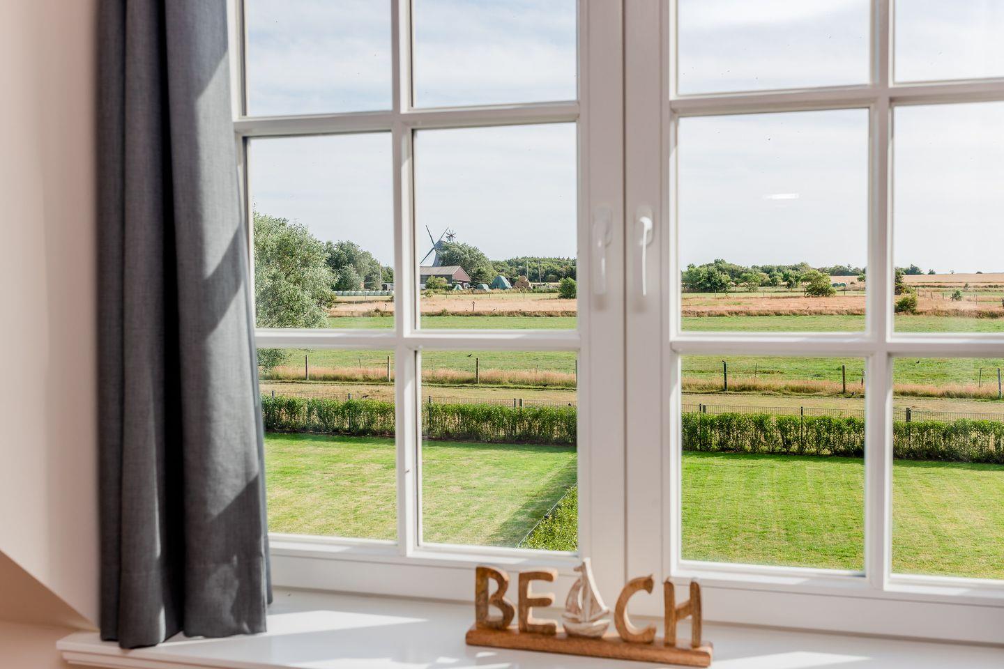 Das Dachgeschoss stellt ein Highlight der Unterkunft dar. Es ist als großzügiges drittes Schlafzimmer eingerichtet und bietet über die große Fensterfront einen herrlichen Blick über Felder bis zur Nordsee.