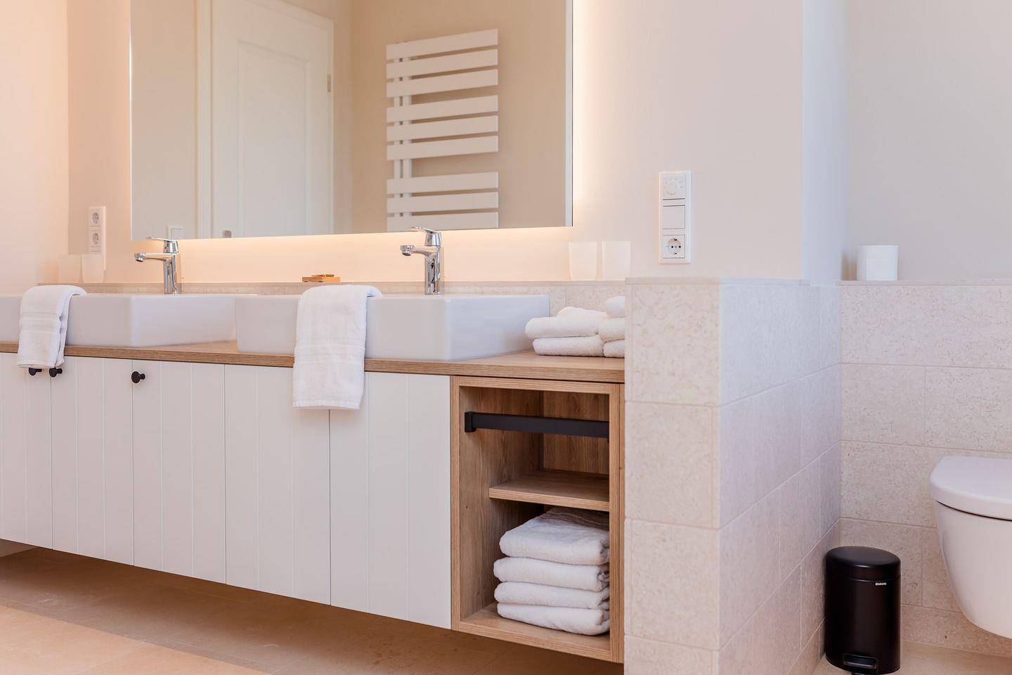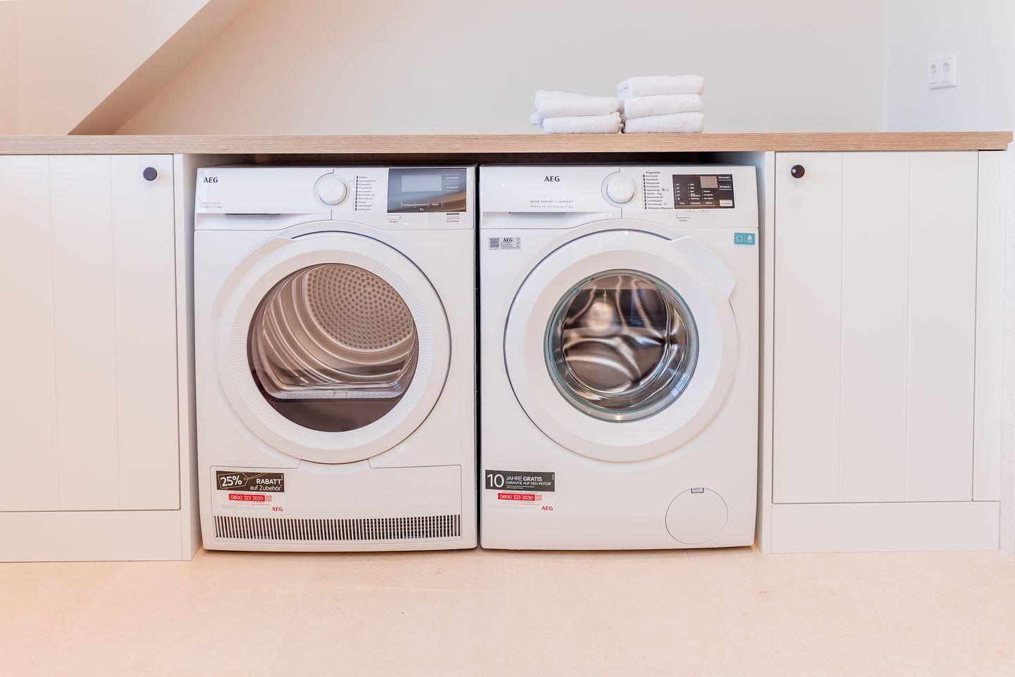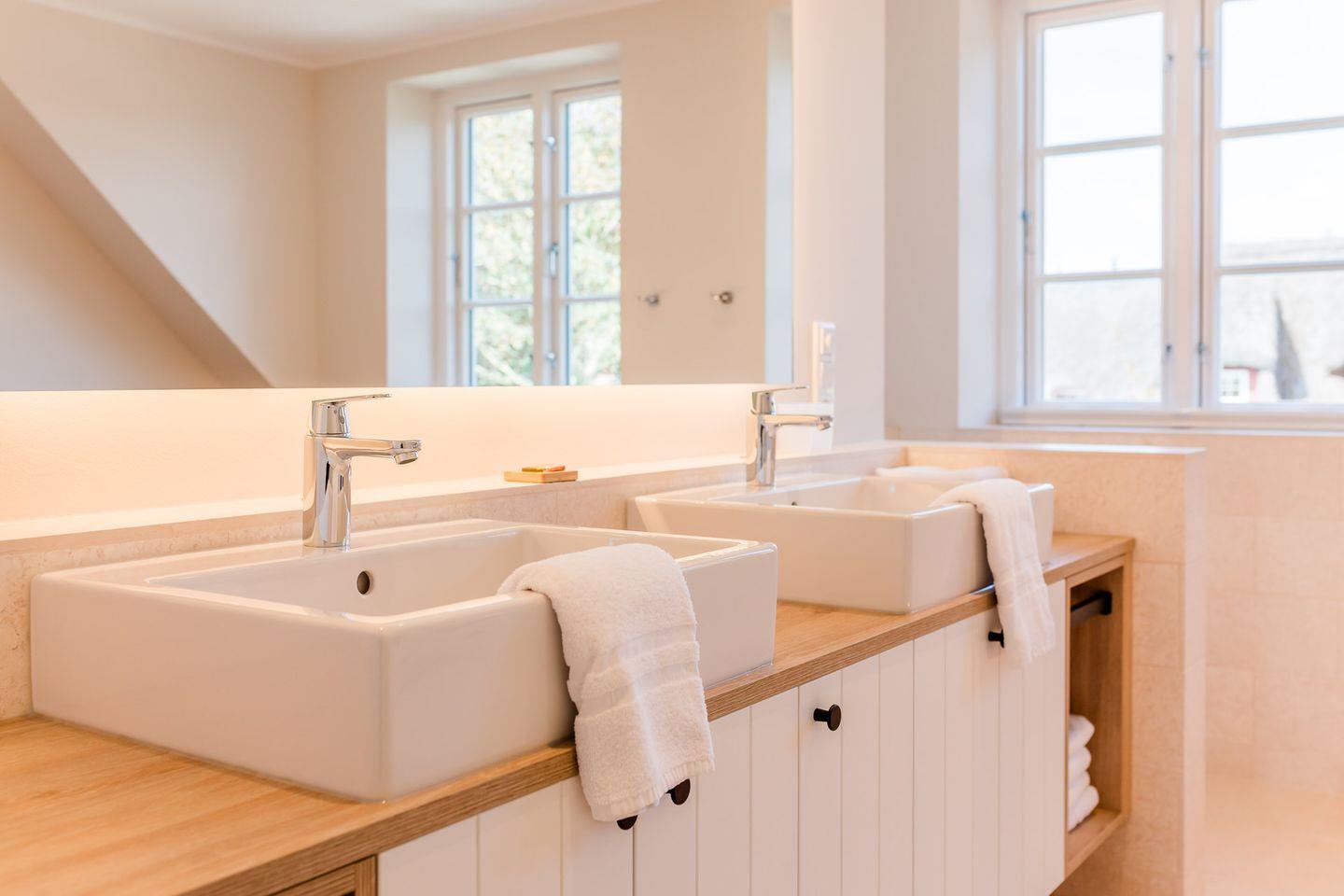 Im Obergeschoss sind zwei Schlafzimmer - beide mit je einem Doppelbett und einem Smart-TV ausgestattet -, sowie zwei Duschbäder. In einem der Bäder stehen Ihnen eine Waschmaschine und ein Trockner zur Verfügung.