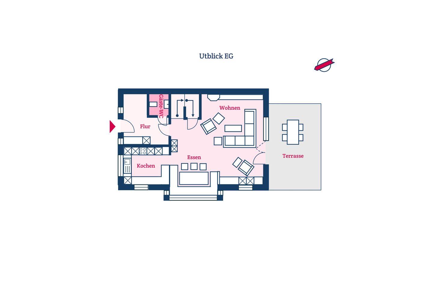 Im Erdgeschoss befinden sich der großzügige Wohn und Essbereich mit offener Küche sowie ein Gäste-WC. Über den Wohnbereich gelangen Sie direkt auf die eigene Terrasse und in den Garten. Der Kamin sorgt auch an kühleren Abenden für eine angenehme Atmosphäre.