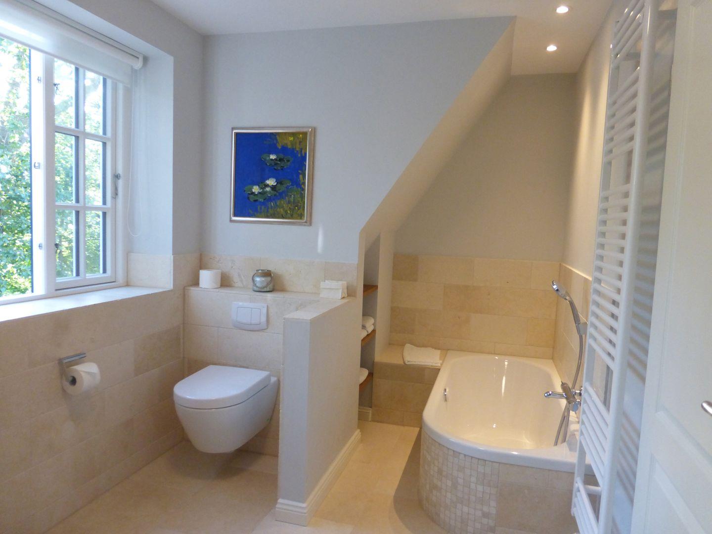 Im Obergeschoss befinden sich die 3 Schlafzimmer sowie ein weiteres Badezimmer mit Wanne und Raindance-Dusche. Im Dachgeschoss erwartet Sie ein Rückzugsraum mit Sauna und Blick auf die Borgsumer Mühle.