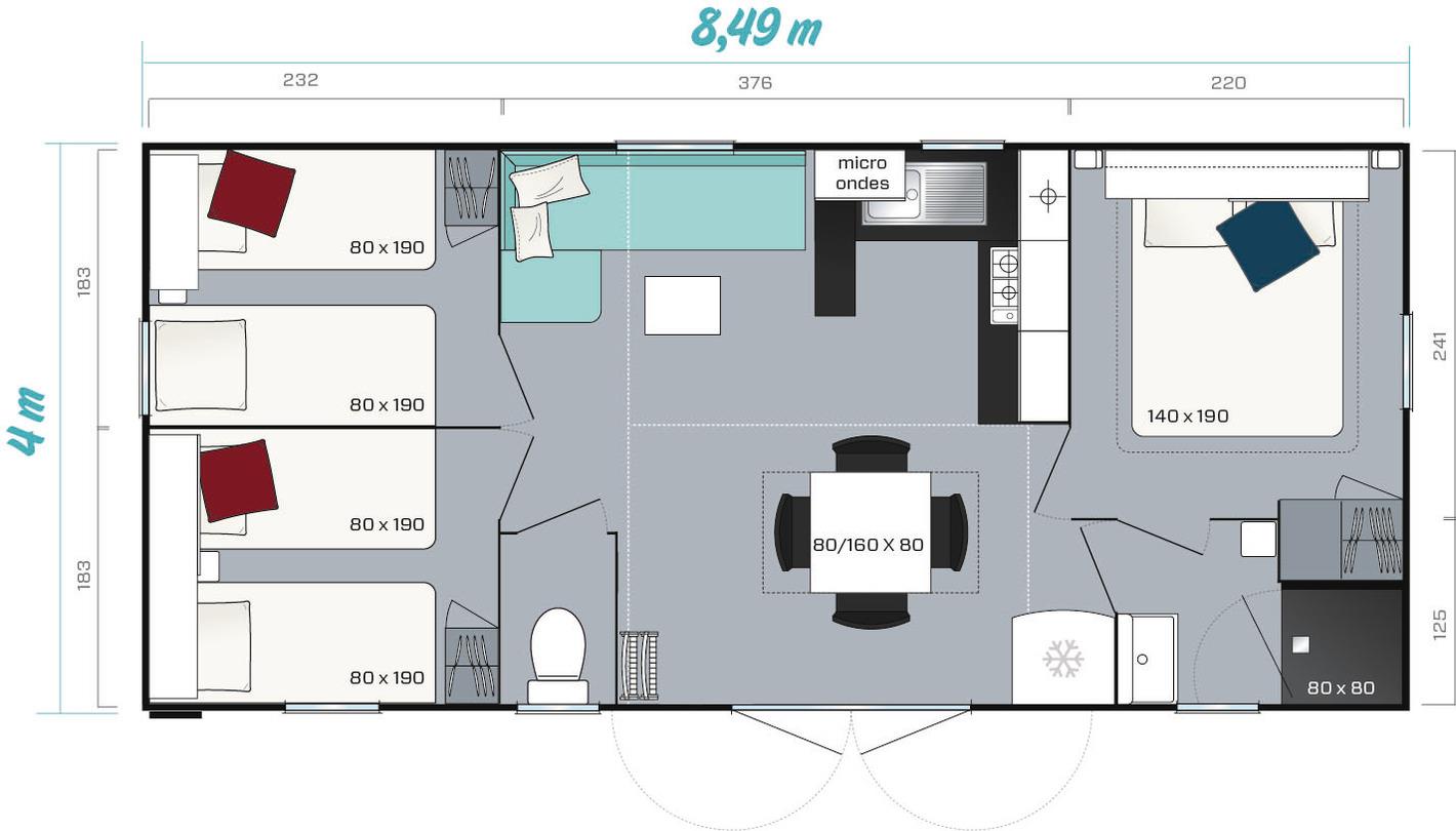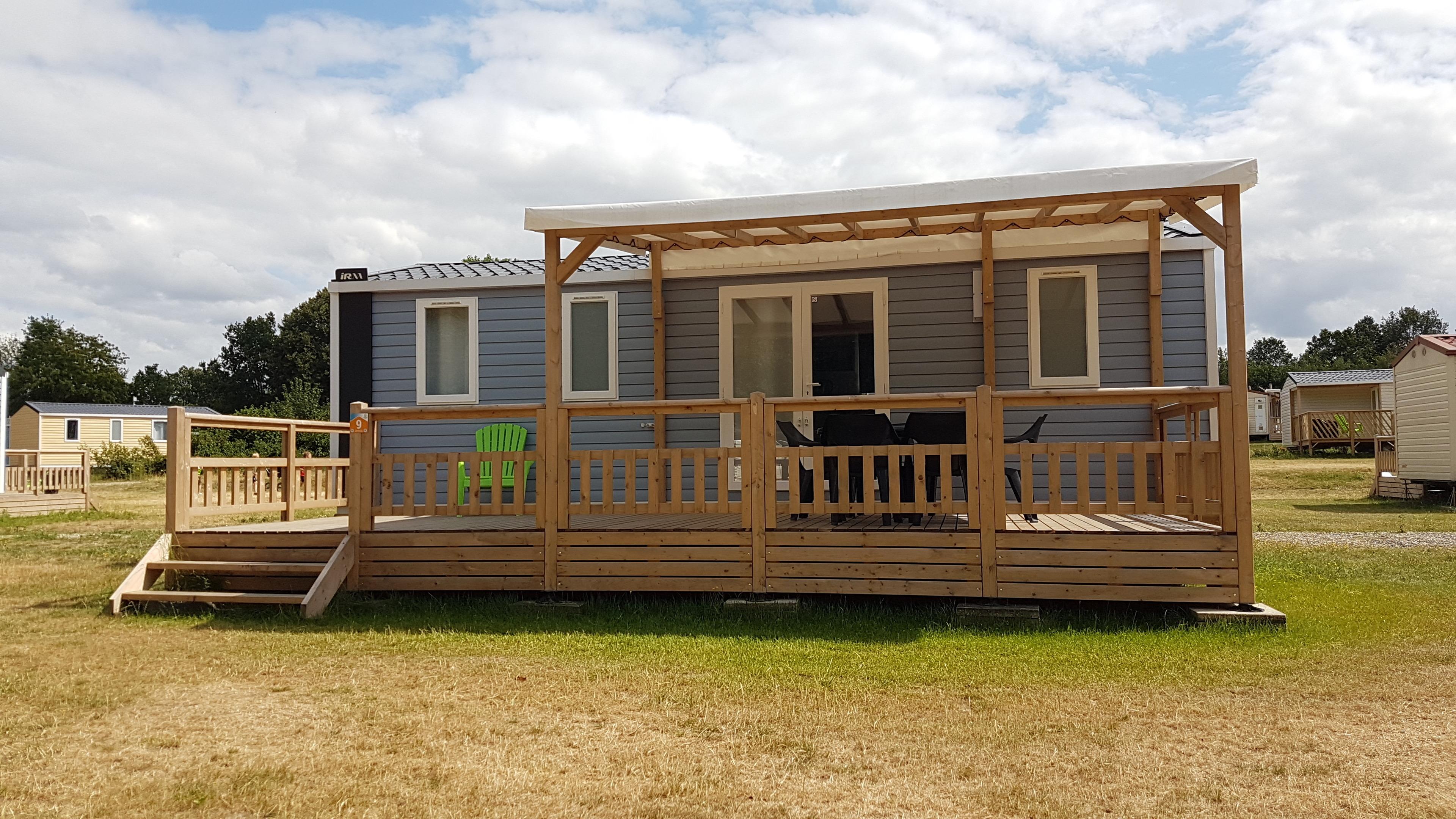 Das Mobilheim Comfort deluxe (max 6 Personen) hat 3 Schlafzimmer, ist Ideal für Familien. Die Mobilheime stehen weit auseinander so können in Ruhe den Urlaub genießen. Das Mobilheim verfügt über 6 Schlafgelegenheiten. Es gibt eine Heizung für ein angenehmer Temperatur. Geeignet für Max 3 Erwachsene und 3 Kinder. Wohnbereich mit eingerichteter Küche mit Kühlschrank mit Gefrierfach ein Kochfeld mit 4 Gasbrennern und eine Kaffemaschine. Elternschlafzimmer mit Doppelbett (160 x 195), 2 Kinderzimmern mit jeweils 2 Einzelnebetten (80 x 195). Badezimmer mit Schrank, Waschtisch, Duschkabine und separates WC. Überdachte Holzveranda mit Gartenmöbel.