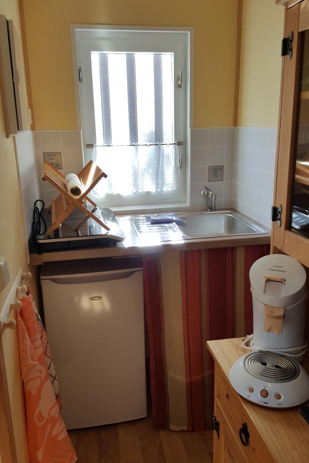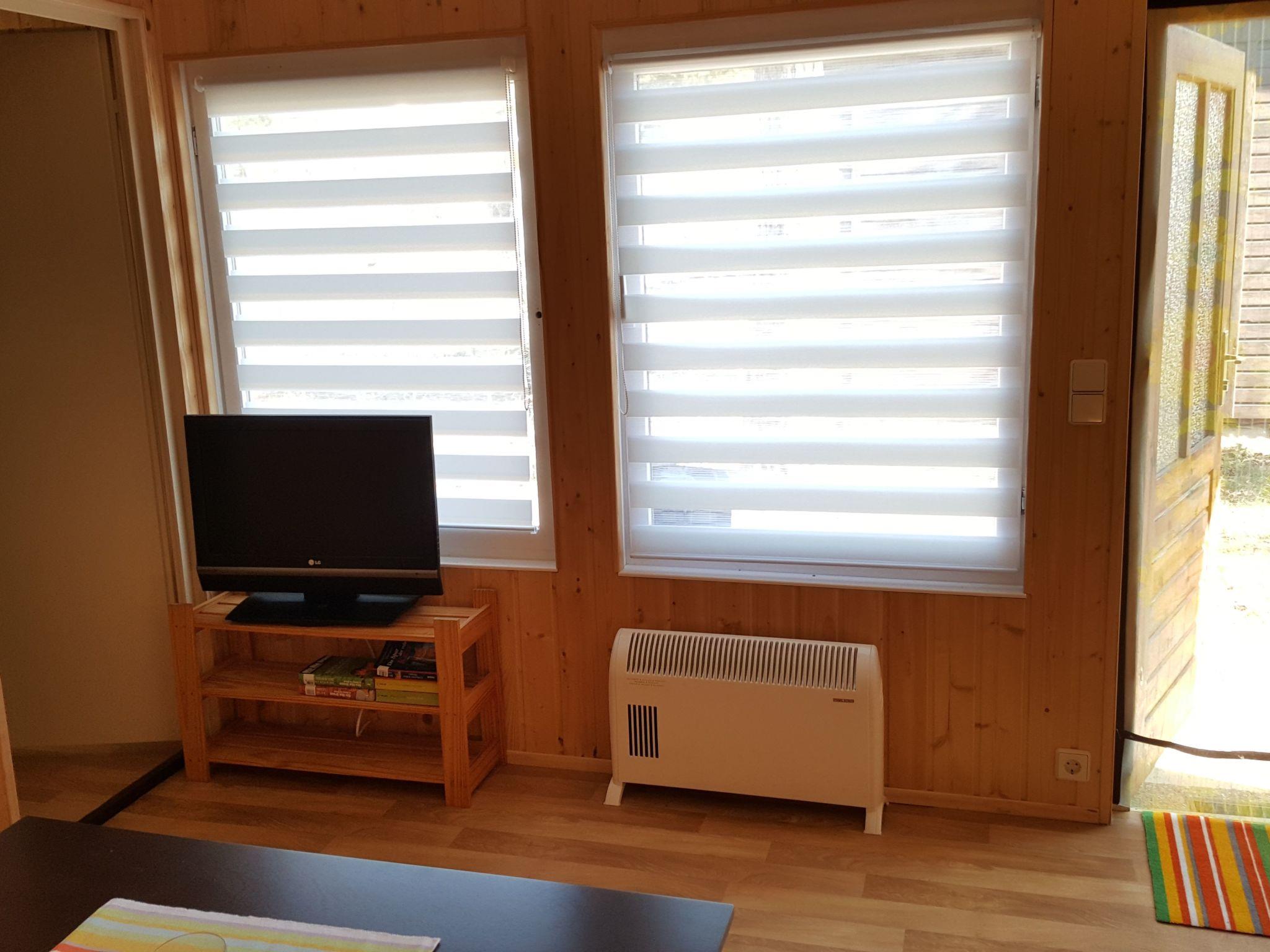 The newly built wooden bungalows with kitchenette, bathroom, living room and bedroom are designed for a cosy, functional stay. You will find a living room with a functional sofa, satellite TV, radio; a bedroom with two upholstered beds with height-adjustable headboards and a bed base (can be converted if required), a wardrobe and a clothes horse. The bathroom is equipped with WC, shower and washbasin. The bathroom and living room can be heated with electric hot-air heaters. The kitchenette is fully equipped with a fridge, double induction hob, instant coffee machine, kettle, toaster and egg cooker, allowing you to prepare a cosy breakfast, lunch or a nice dinner - just like at home. A hoover can be borrowed free of charge on request.
