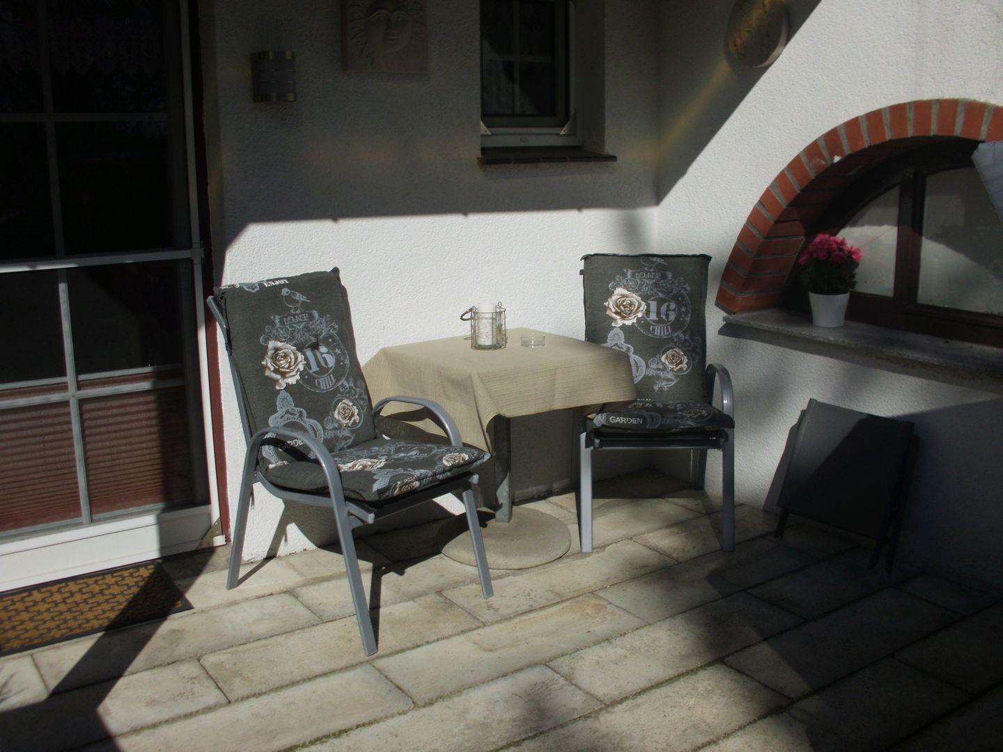 Im Außenbereich vor der Ferienwohnung befindet sich eine Terasse mit Sitzecke und Strandkorb.