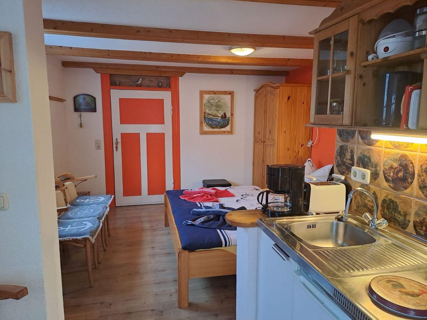 Die Ferienwohnung ist hell und freundlich gestaltet. Sie besteht aus einem kombinierten Wohn-, Schlaf- und Küchenbereich mit einer kleinen, gemütlichen Sitzecke. Das Badezimmer ist separat und als Duschbad ausgestattet. Alle Fenster verfügen über Plissees.