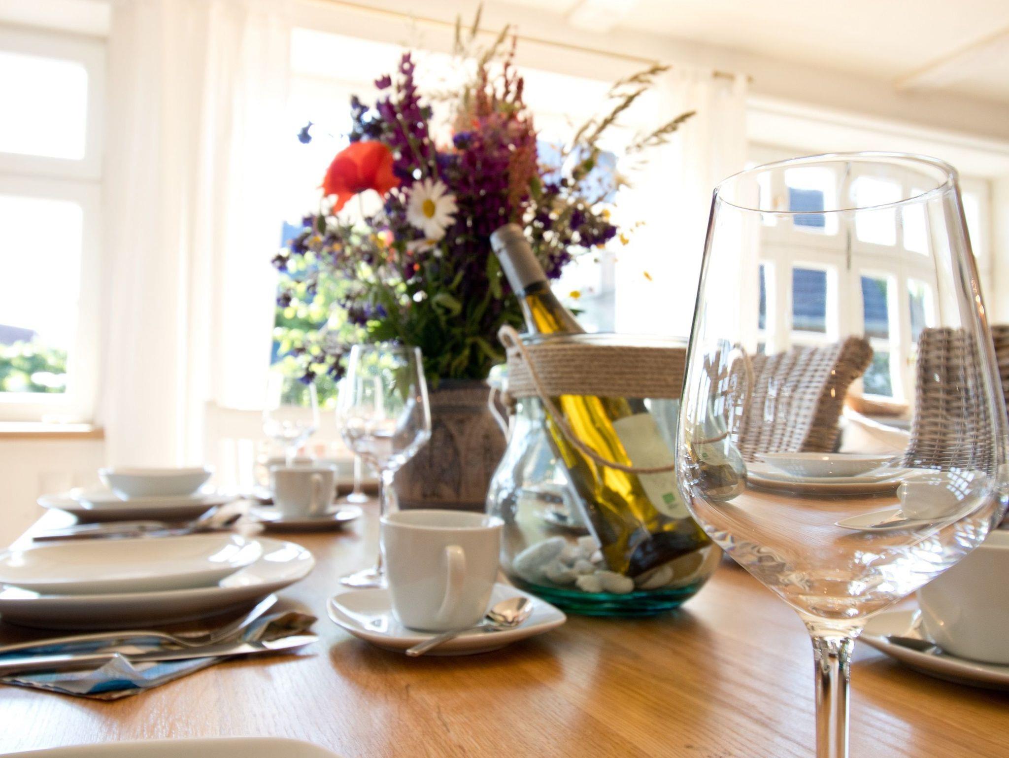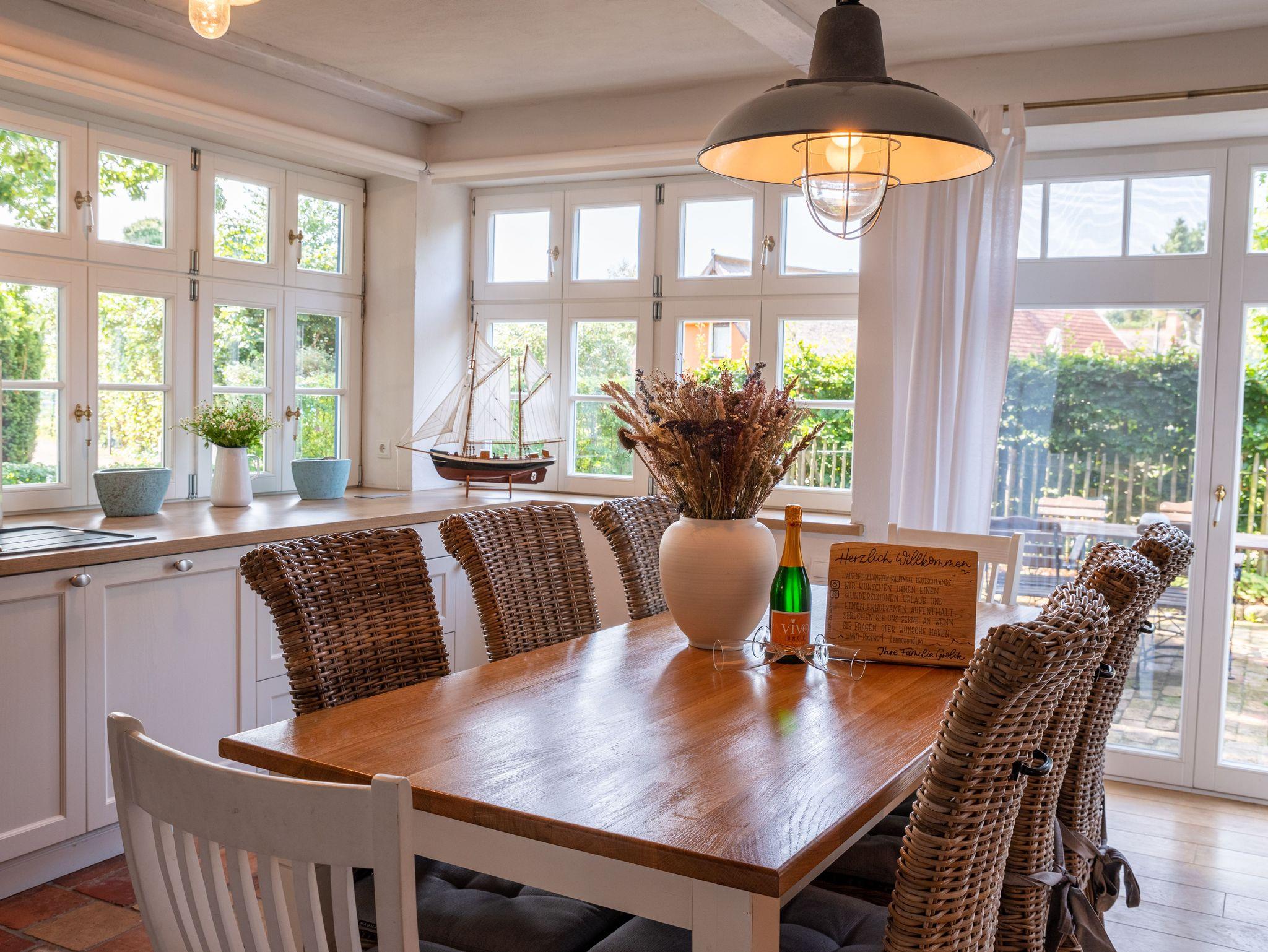 Die voll ausgestattete Einbauküche verfügt über hochwertige Geräte wie Geschirrspülmaschine, Backofen, Ceranfeld und eine Nespresso Maschine. Am großen Esstisch finden bis zu acht Personen bequem Platz.