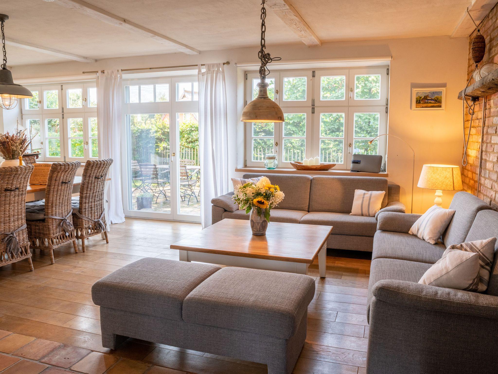 Das Ferienhaus Ankerplatz bietet großzügigen Wohnkomfort und eine durchdachte Raumaufteilung für Familien oder kleine Gruppen. Herzstück des Hauses ist der große, offen gestaltete Wohn und Essbereich mit gemütlichem Kamin. Originale Darßer Fliesen und Eichen Echtholzdielen verleihen dem Raum einen besonderen Charakter. Für angenehme Wärme sorgt eine Fußbodenheizung im gesamten Haus. Vom Wohnbereich aus gelangen Sie direkt auf die nordöstlich ausgerichtete Terrasse.