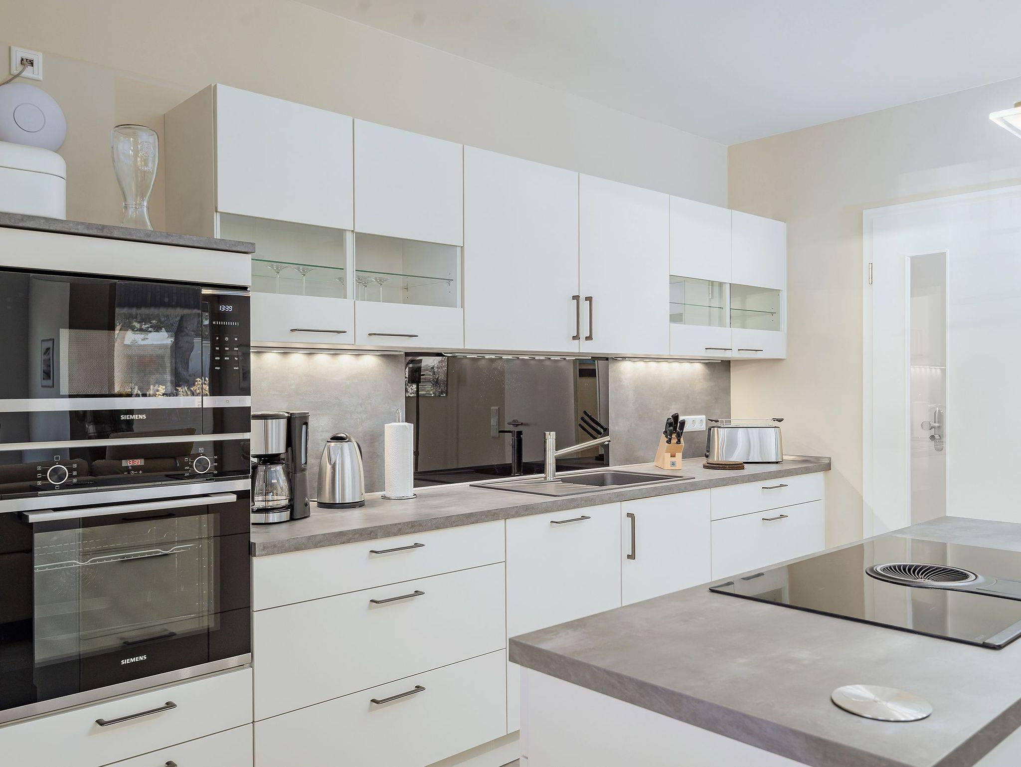 • Einbauküche mit Kücheninsel + Induktionskochfeld, Backofen, Geschirrspüler, Kühl-/Gefrierkombination, Wasserkocher, Toaster, Kaffeemaschine, Kochutensilien von Zwilling, Mikrowelle