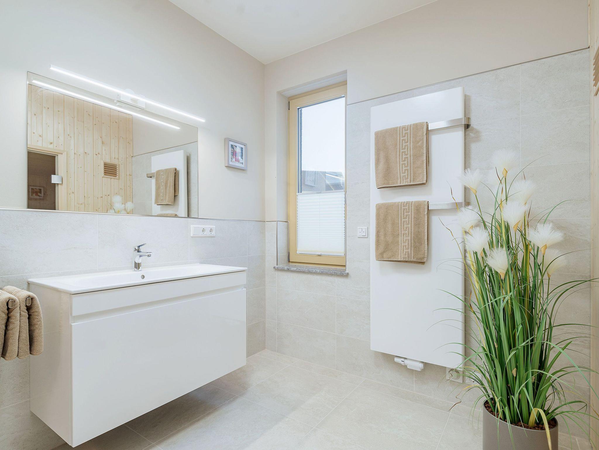 • Tageslichtbad mit elektr. Fußbodenheizung, ebenerdiger Dusche, großer Waschtisch, Handtuchheizkörper und Sauna