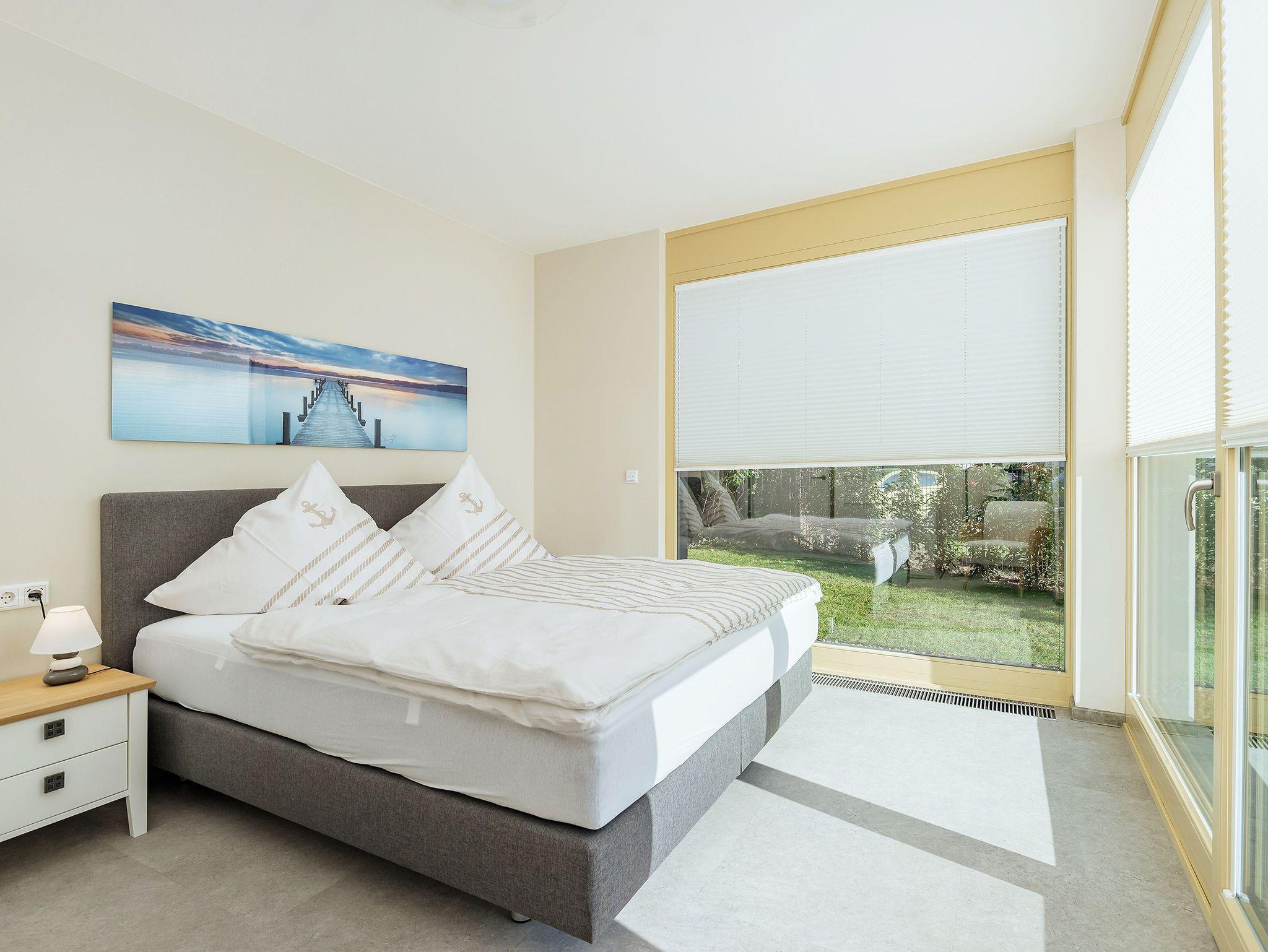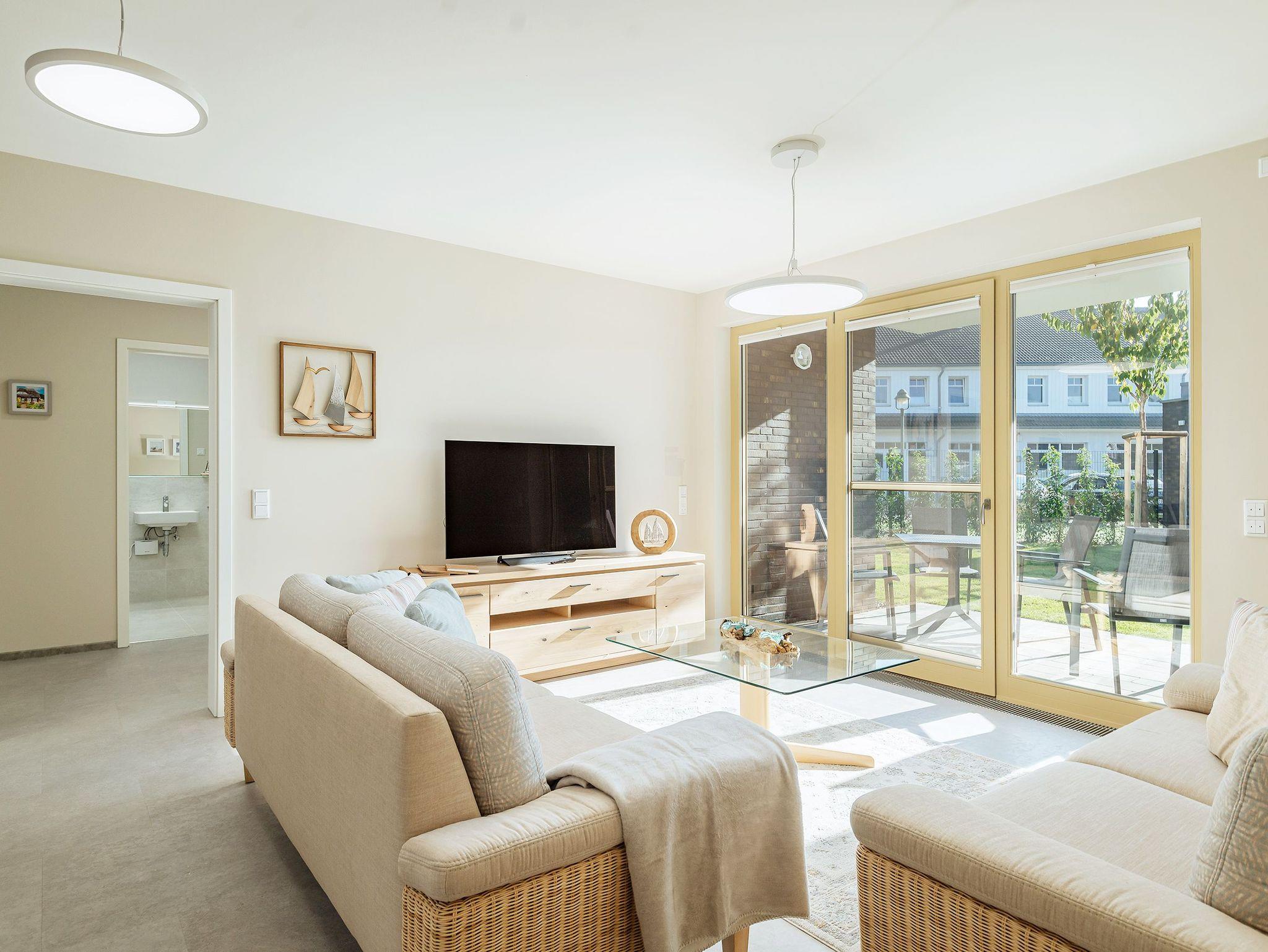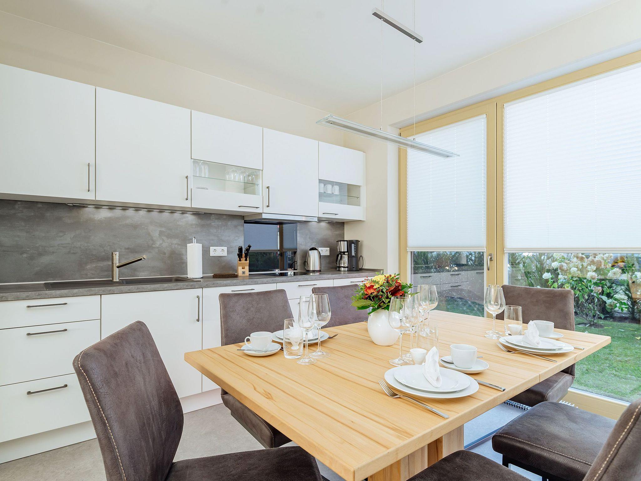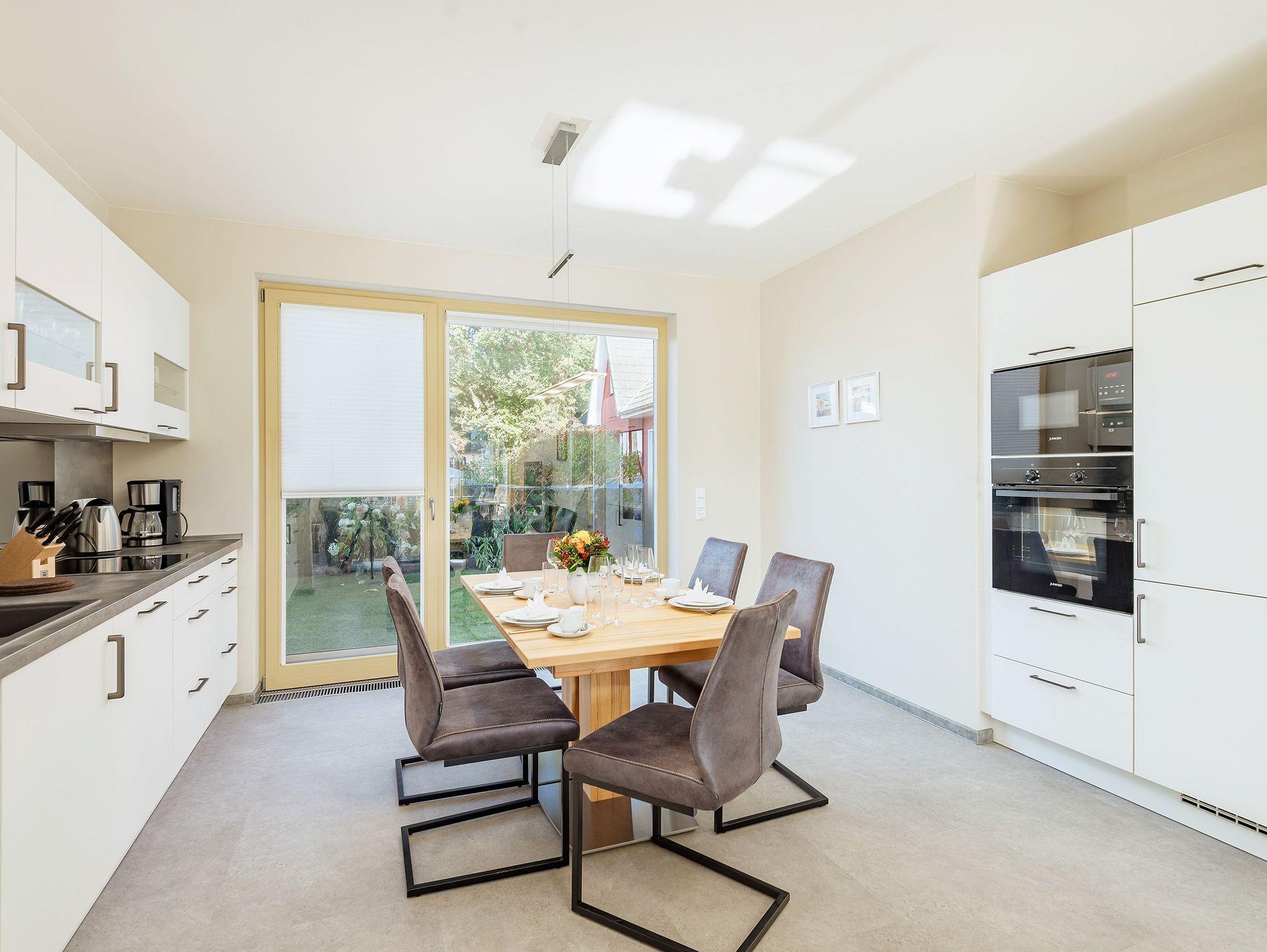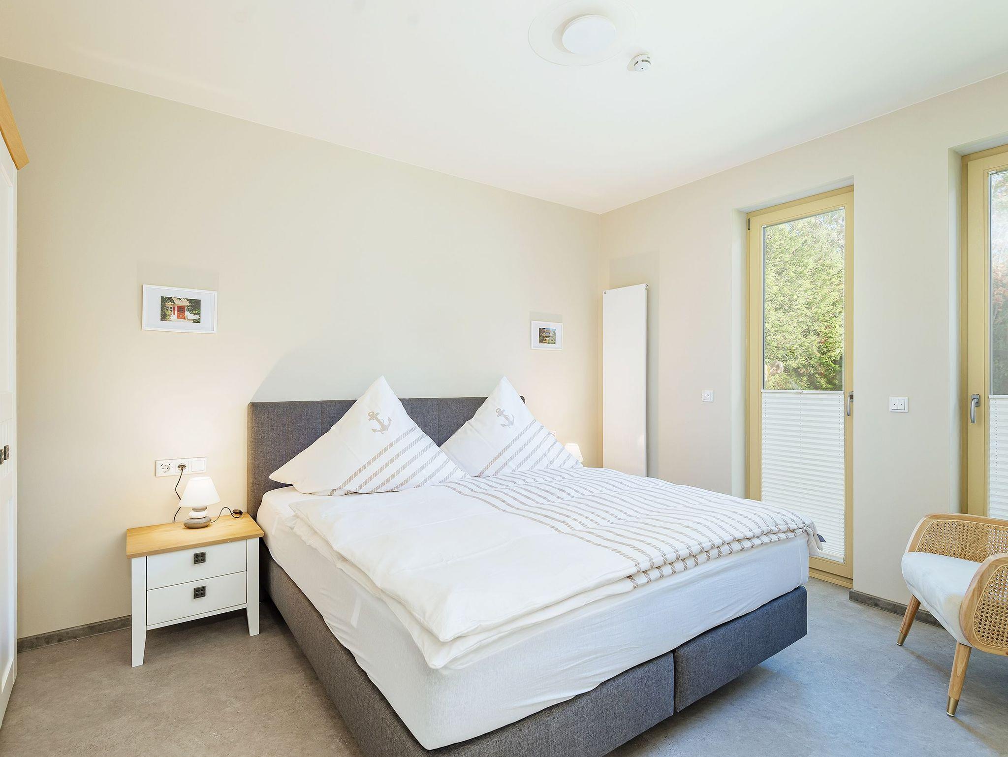 To Huus - so soll man sich fühlen im Urlaub. Diese großzügige 3-Zimmer-Wohnung mit einer Wohnfläche von ca. 90 m² bietet Komfort und modernes Wohnen. Sie hat 2 geräumige Schlafzimmer mit je einem Boxspringbett von 2 x 1,80 m. Die Wohlfühloase Badezimmer hat einen Waschtisch, eine ebenerdige Dusche, eine elektr. Fußbodenheizung, einen Handtuchheizkörper und eine private Sauna. Ein zusätzliches Gäste-WC sorgt für Bequemlichkeit. Die moderne Einbauküche mit Ceranfeld, Backofen,Mikrowelle, Geschirrspüler, Kühl-/Gefrierkombination, Wasserkocher, Toaster, Kaffeemaschine, Kochuntensilien von Zwilling, sowie hochwertiges Geschirr lassen das Herz eines Hobbykochs höher schlagen. Für den PKW steht ein Außenstellplatz zur Verfügung. Für das E-Auto eine Ladesäule und für das Fahrrad ein abschließbares Fahrradhaus. Entdecke Dein neues Urlaubsdomizil im Seebad Born.