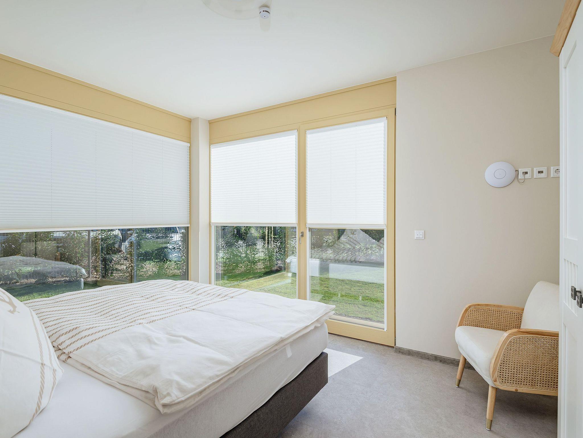 • bodentiefe Fenster weitestgehend mit Gaze, Plissee und Rollläden