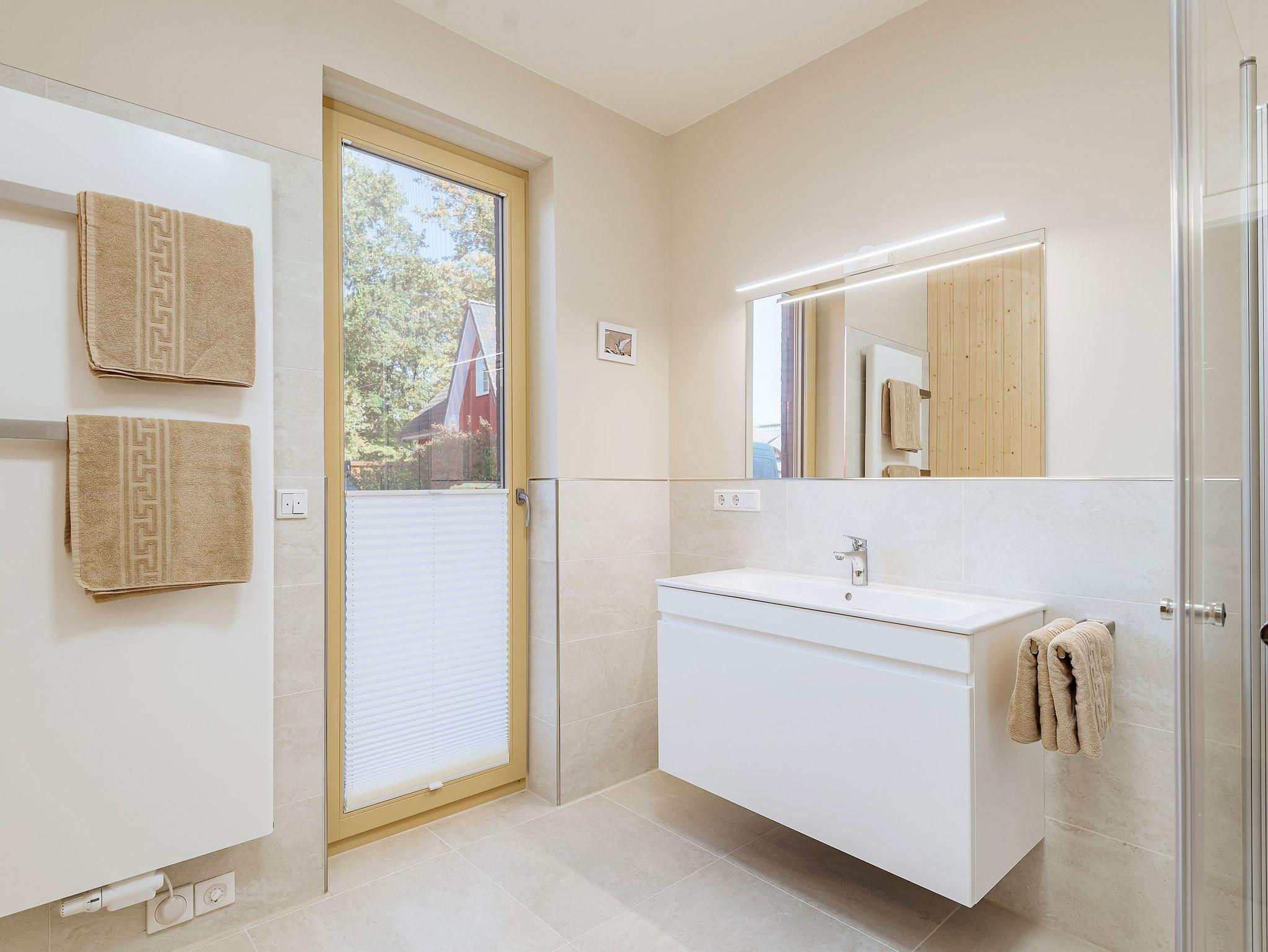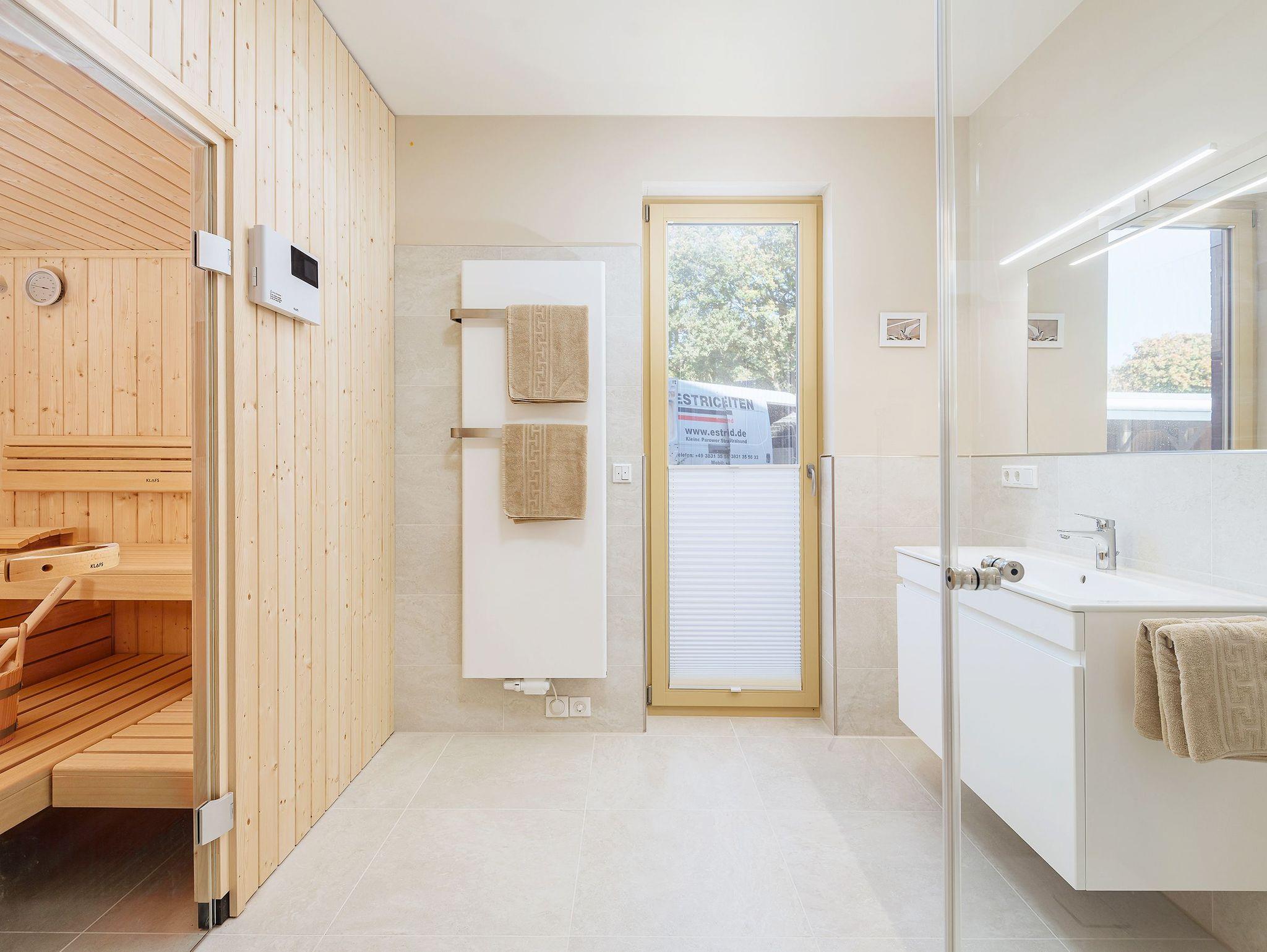 • Tageslichtbad mit elektr. Fußbodenheizung, ebenerdiger Dusche, großer Waschtisch, Handtuchheizkörper und Sauna