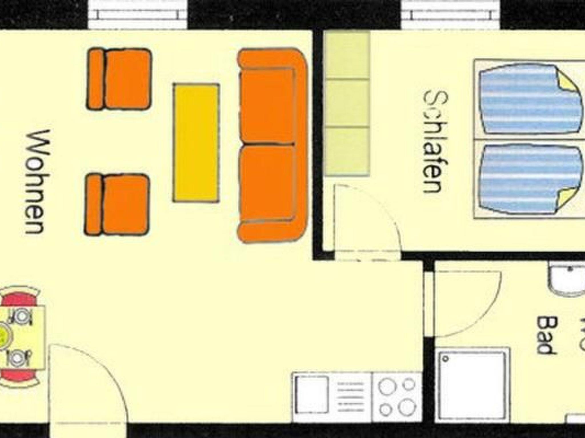 Our holiday flat offers plenty of space for 2 people on approx. 40 m² of living space, especially as the living area is generously proportioned. The holiday flat has 1 bedroom, a large living room, an integrated kitchenette and a bathroom/WC. The holiday flat is comfortably and stylishly furnished and has underfloor heating throughout the living area. In addition to the sofa suite, there is an additional dining table in the living room. Satellite/colour TV with flat screen, stereo system (radio, CD player) and Internet access are also included. The small kitchen is fully equipped with a hob, fridge, coffee machine, toaster and egg cooker. Crockery is of course also available.
