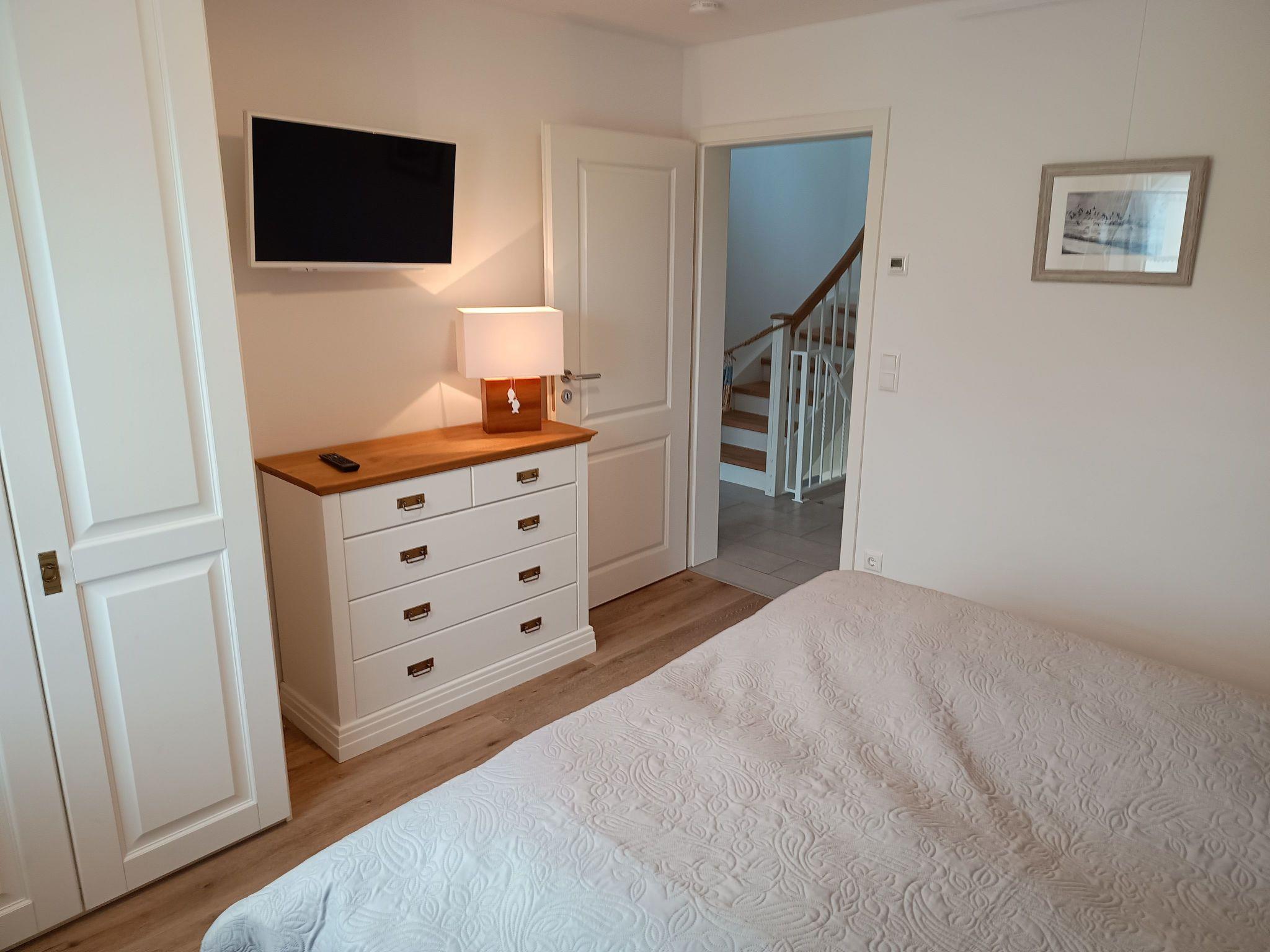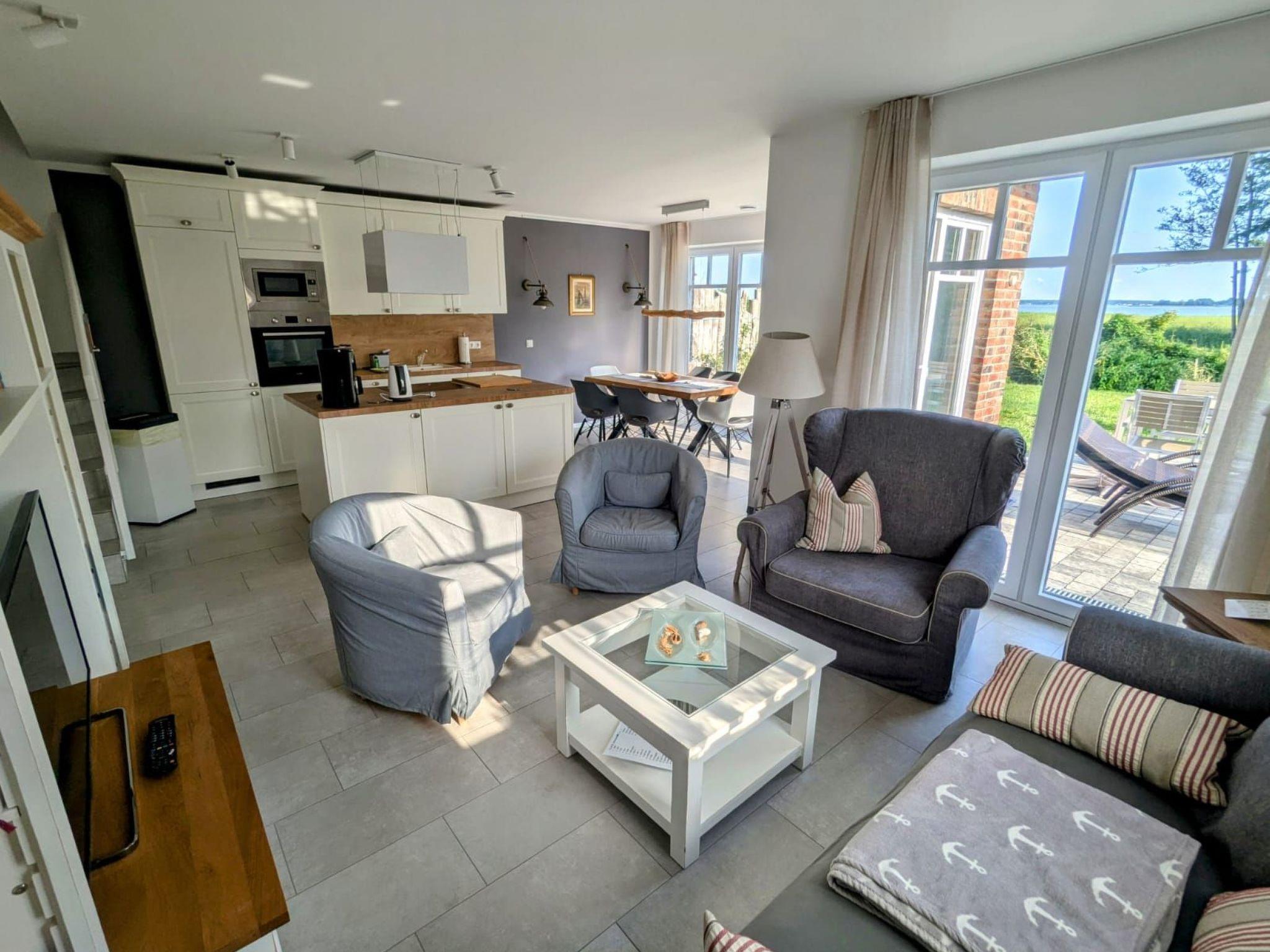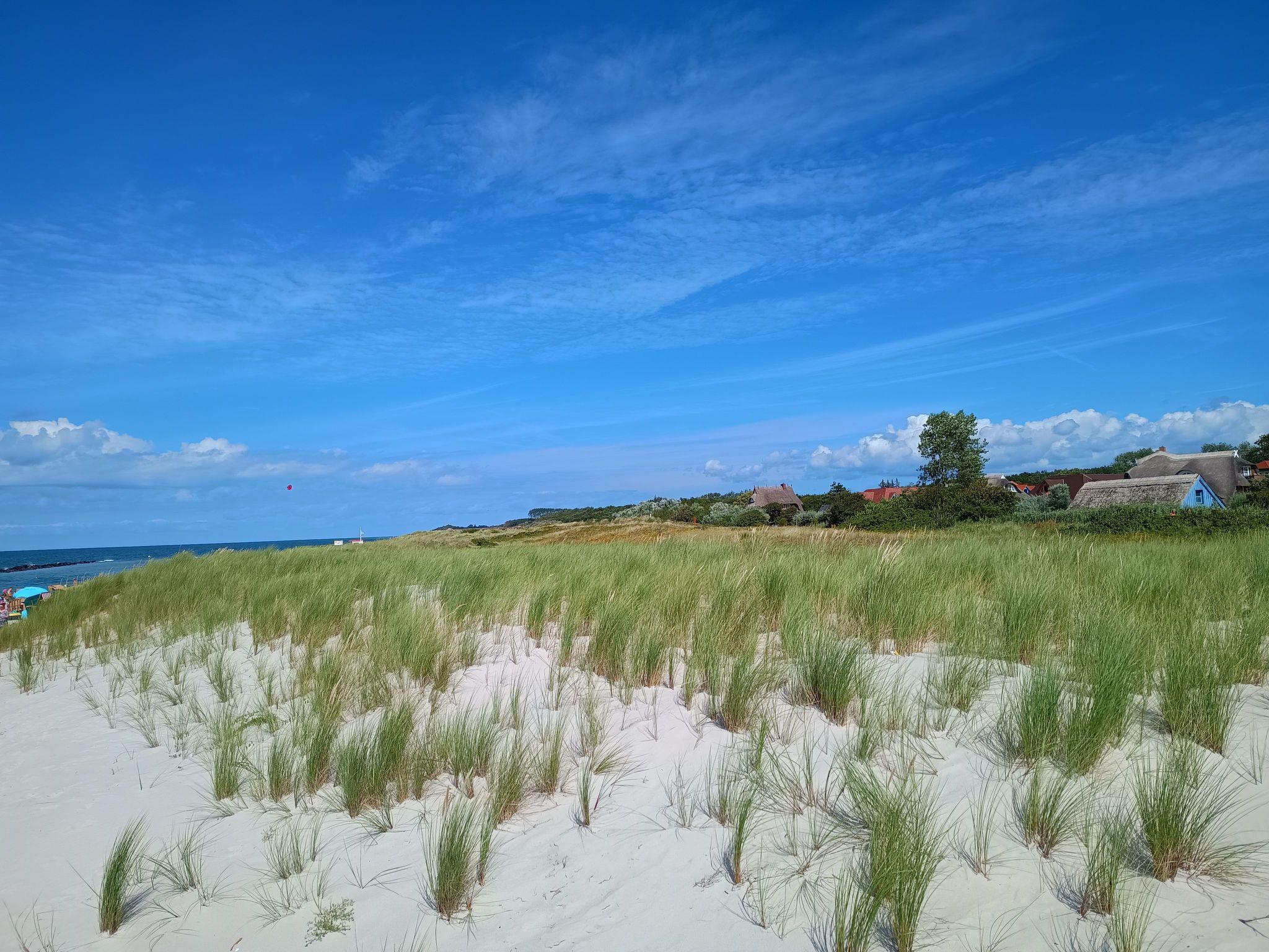 The south-facing terrace area offers ample seating for all the occupants of the house. From the terrace you have a fantastic view of the countryside and the Bodden. The house is in a quiet location, as it was built approx. 60 metres back from the "Bauernreihe" road at the end of a private lane. The semi-detached house Luv faces south-west. Google/Maps provides a good overview of the 'location'.