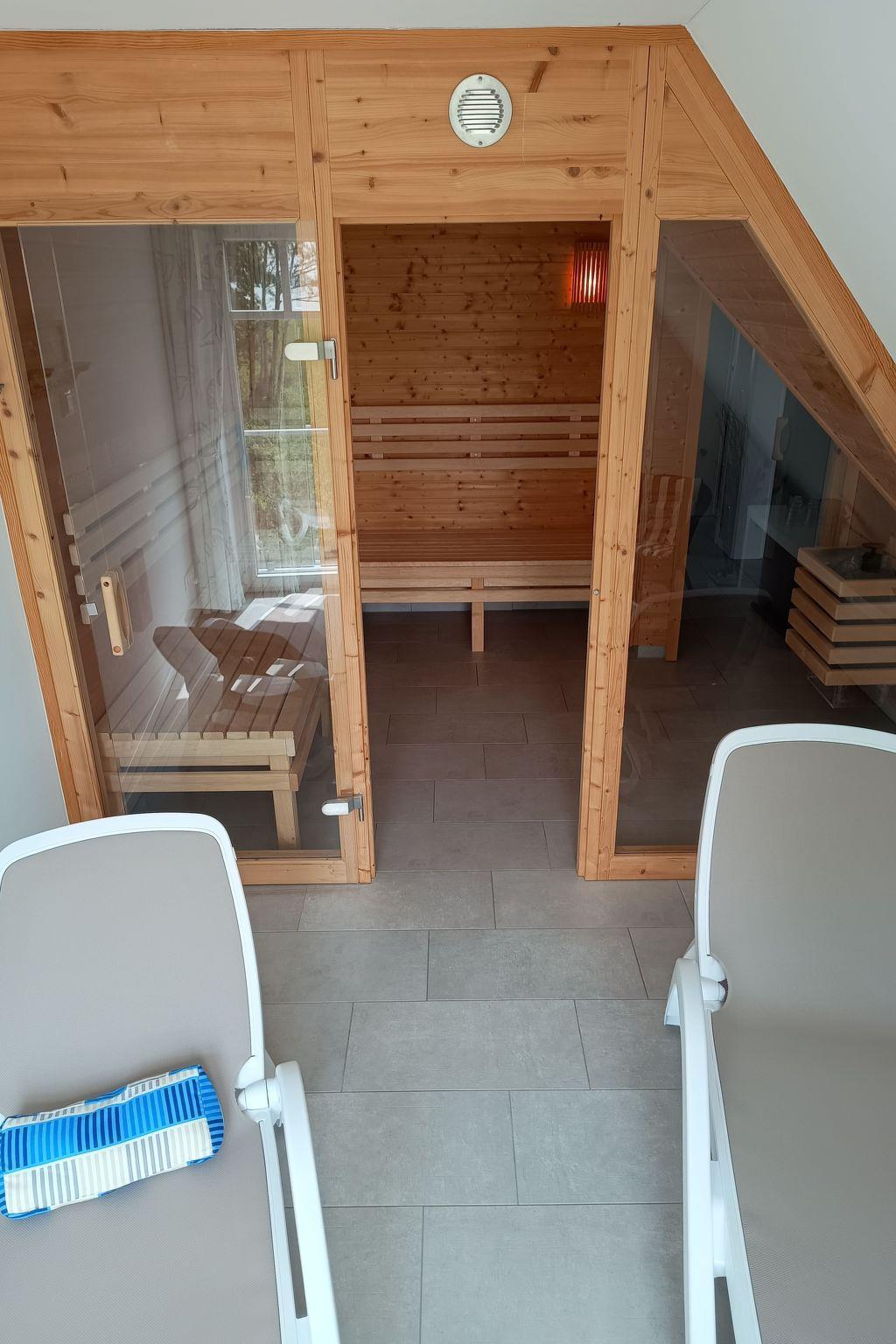 The holiday home Luv was ready for occupancy at the end of 2019. Lee and Luv are the two halves of a semi-detached house, so they are identical in construction and furnished in the same way. Luv has a living space of 115 square metres, 3 bedrooms with a total of 6 beds and 2 bathrooms. The fitted kitchen includes a kitchen block with fridge-freezer, oven, dishwasher, microwave, coffee machine, toaster, etc. A cooking island with four induction hobs and many drawers for provisions etc. completes the kitchen. In the living room, a 3-seater sofa, a 1.5-seater wing chair and two cocktail chairs invite you to linger. The holiday home has been furnished with great attention to detail - after all, you should feel right at home as a guest! The highlight is the unobstructed view of the wide expanse of water of the Bodden from the dining room and the relaxation room on the upper floor. After long excursions, you can end the day in the cosy warmth of the sauna and relaxation room. The view of the Bodden and nature has a calming effect. It lets you forget the stress of everyday life. You can also make plans for the next day in harmonious togetherness. You can activate the use of the sauna via a coin-operated device.30 minutes costs a two-euro coin. You need two e u r o coins to operate the sauna heater. After operating the sauna heater for 30 minutes, you will reach a temperature of approx. 45 degrees, which rises to approx. 65 degrees over the next 30 minutes. Some sauna users may consider this temperature to be too low. We consider it to be sufficient and have focussed more on a comfortable sauna size and a relaxation room with a great view. We ask our guests to bring their own sauna towels and bathrobes. These - and other items of linen - can be washed in the washing machine, then hung up on the drying rack and left to dry.