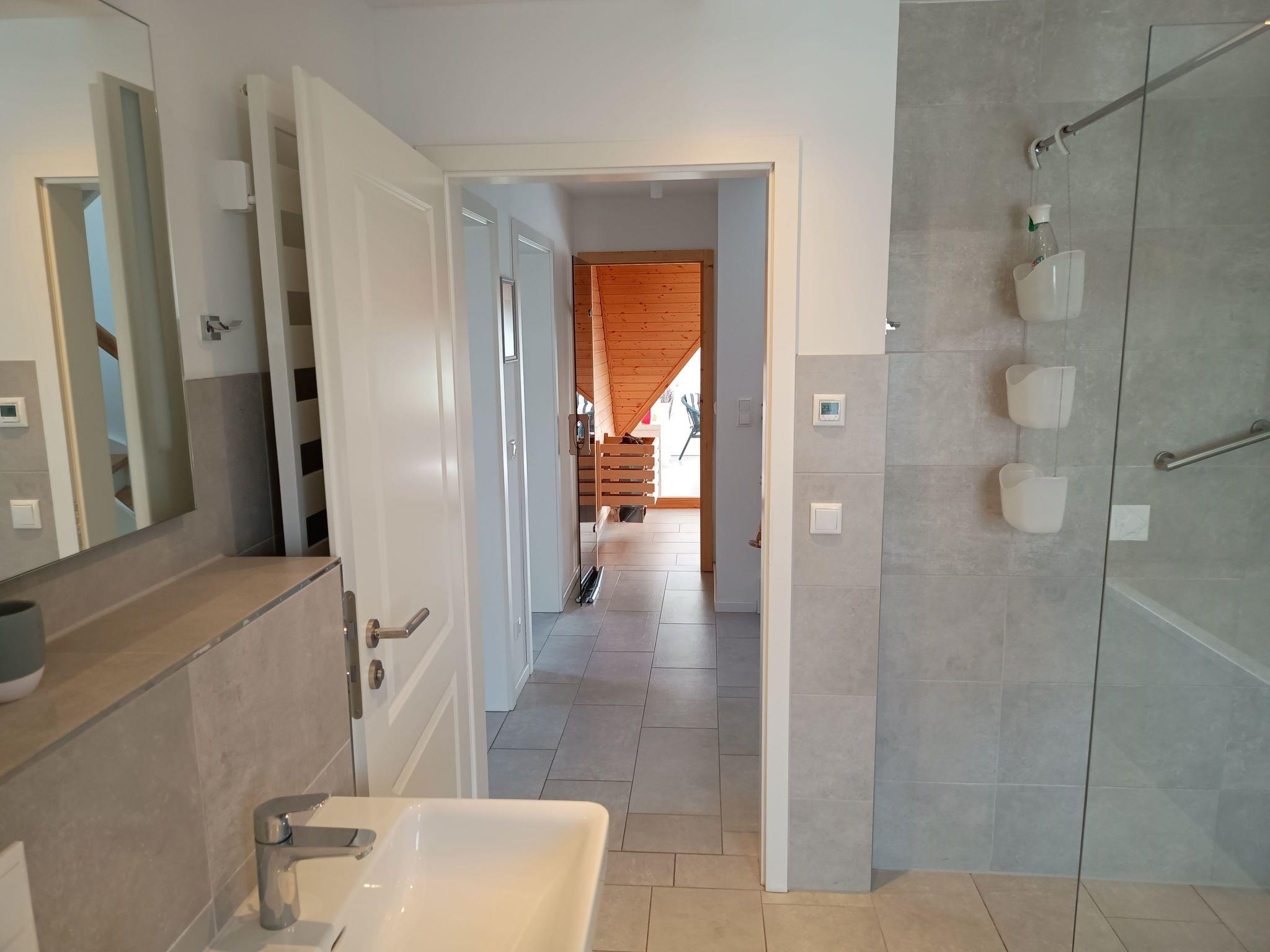 The holiday home Lee was ready for occupancy at the end of 2019. It has a living space of 115 square metres, 3 bedrooms with a total of 6 beds and 2 bathrooms. The fitted kitchen includes a kitchen block with fridge-freezer, oven, dishwasher, microwave, coffee machine, toaster, etc. A cooking island with four induction hobs and many drawers for provisions etc. completes the kitchen. In the living room, a 3-seater sofa, a 1.5-seater wing chair and two cocktail chairs invite you to linger. The holiday home has been furnished with great attention to detail - after all, you should feel right at home as a guest! The highlight is the unobstructed view of the wide expanse of water of the Bodden from the dining room and the relaxation room on the upper floor. After long excursions, you can end the day in the cosy warmth of the sauna and relaxation room. The view of the Bodden and nature has a calming effect. It lets you forget the stress of everyday life. You can also make plans for the next day in harmonious togetherness. You can activate the use of the sauna via a coin-operated device. 30 minutes cost one two-euro coin. To operate the sauna heater, you need two e u r o coins. After half an hour, the sauna heater has heated the room to approx. 45 degrees. The temperature rises to approx. 65 degrees over the next 30 minutes. Some sauna-goers may consider this temperature to be too low. We think it is sufficient and have placed more emphasis on a comfortable sauna size and a relaxation room with a great view. We ask our guests to bring their own sauna towels and bathrobes. These - and other items of linen - can be washed in the washing machine, then hung up on the drying rack and left to dry.