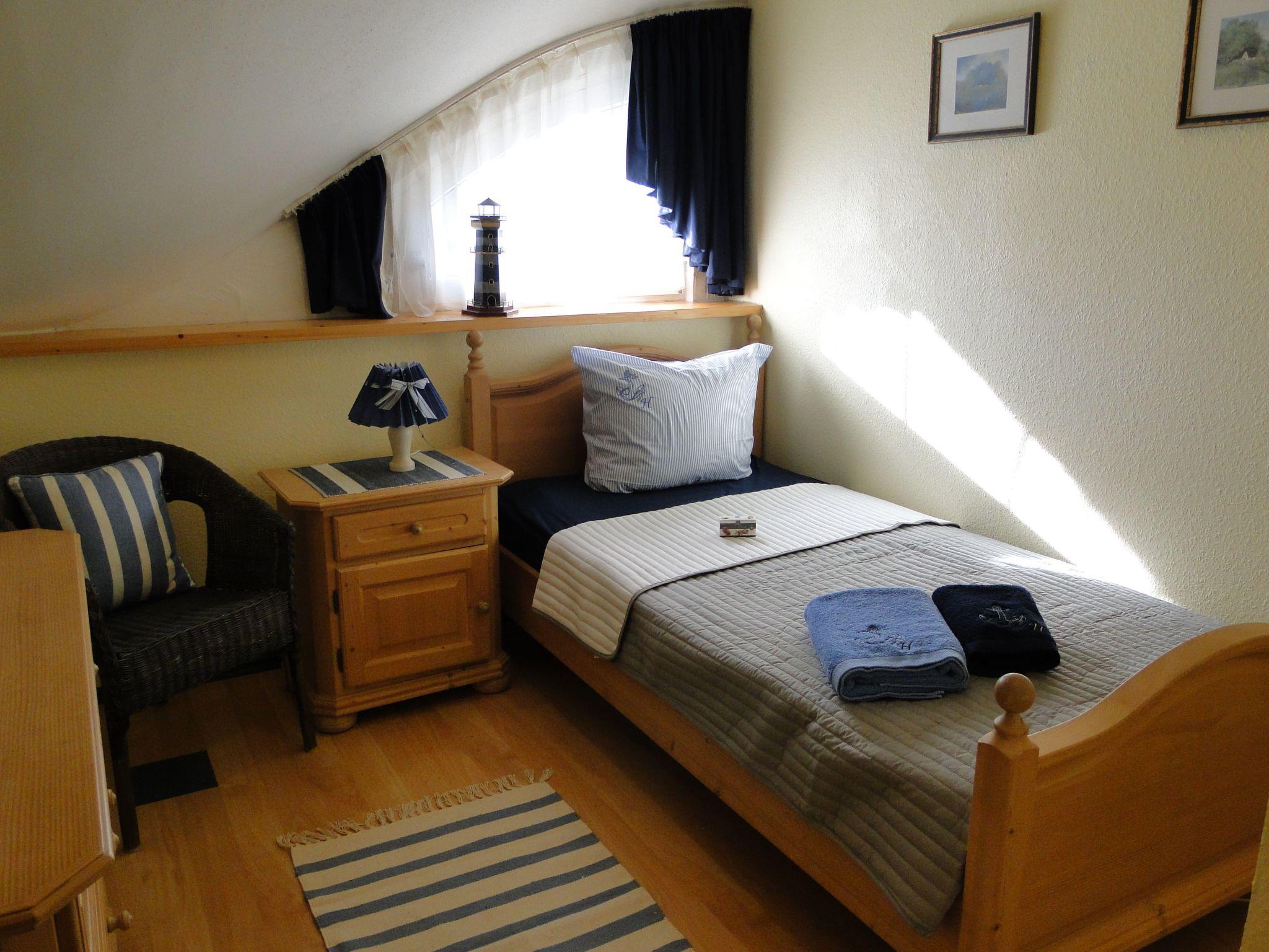Inside, the house impresses with a generous living space of 85 square metres, spread over two levels. On the ground floor, you will find an inviting hallway, a modern shower room, a fully equipped kitchen and a cosy dining and living room with a fireplace to create a homely atmosphere. Upstairs, three lovingly furnished bedrooms, one with a double bed (180 x 200) and two others with single beds (90 x 200), offer space for those seeking relaxation. A further shower room and amenities such as free Internet and satellite TV round off the comfort.