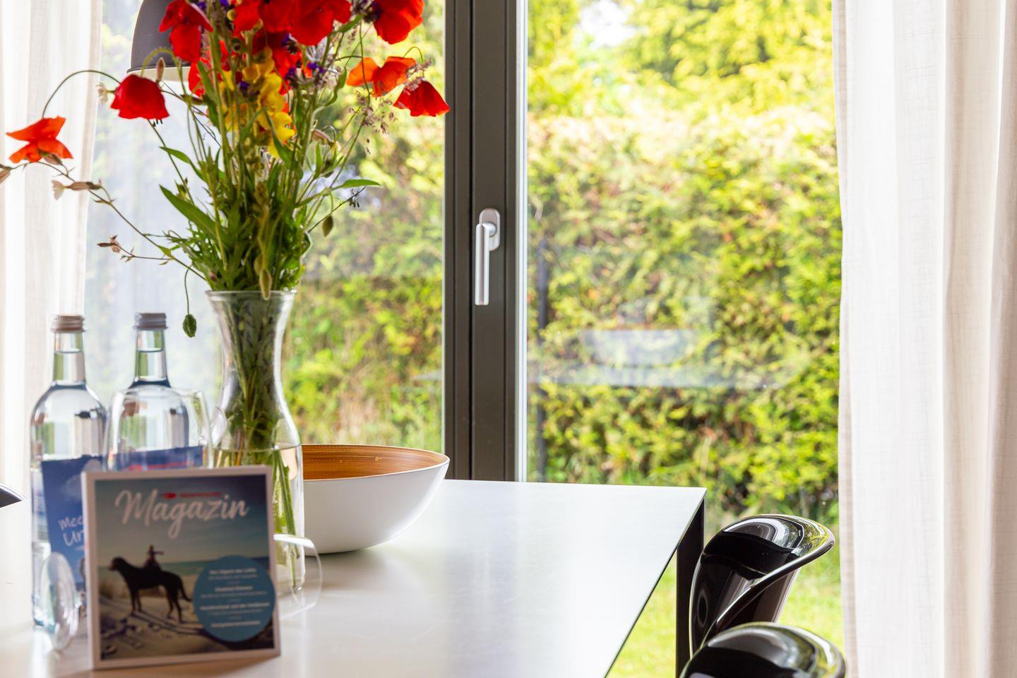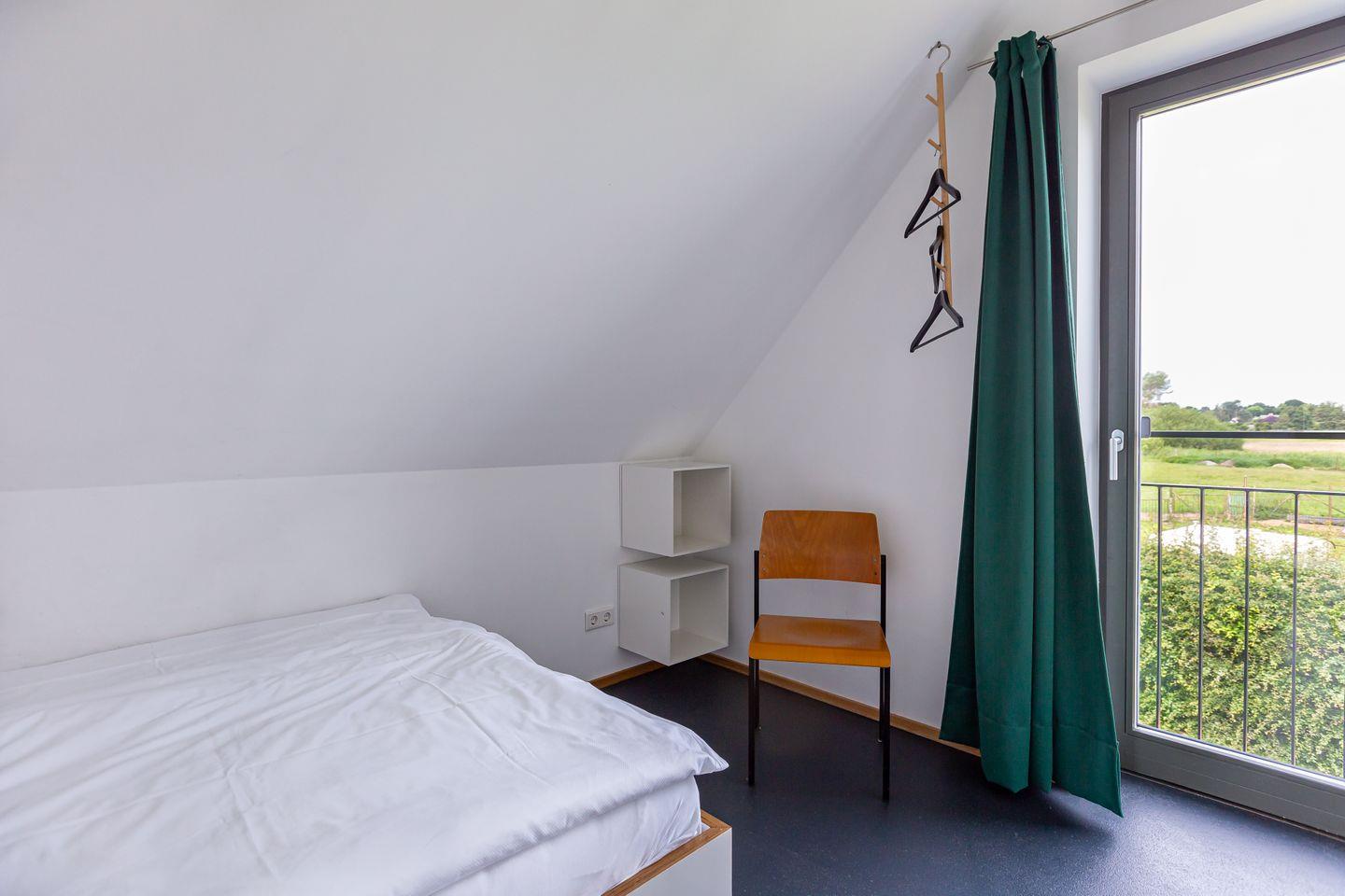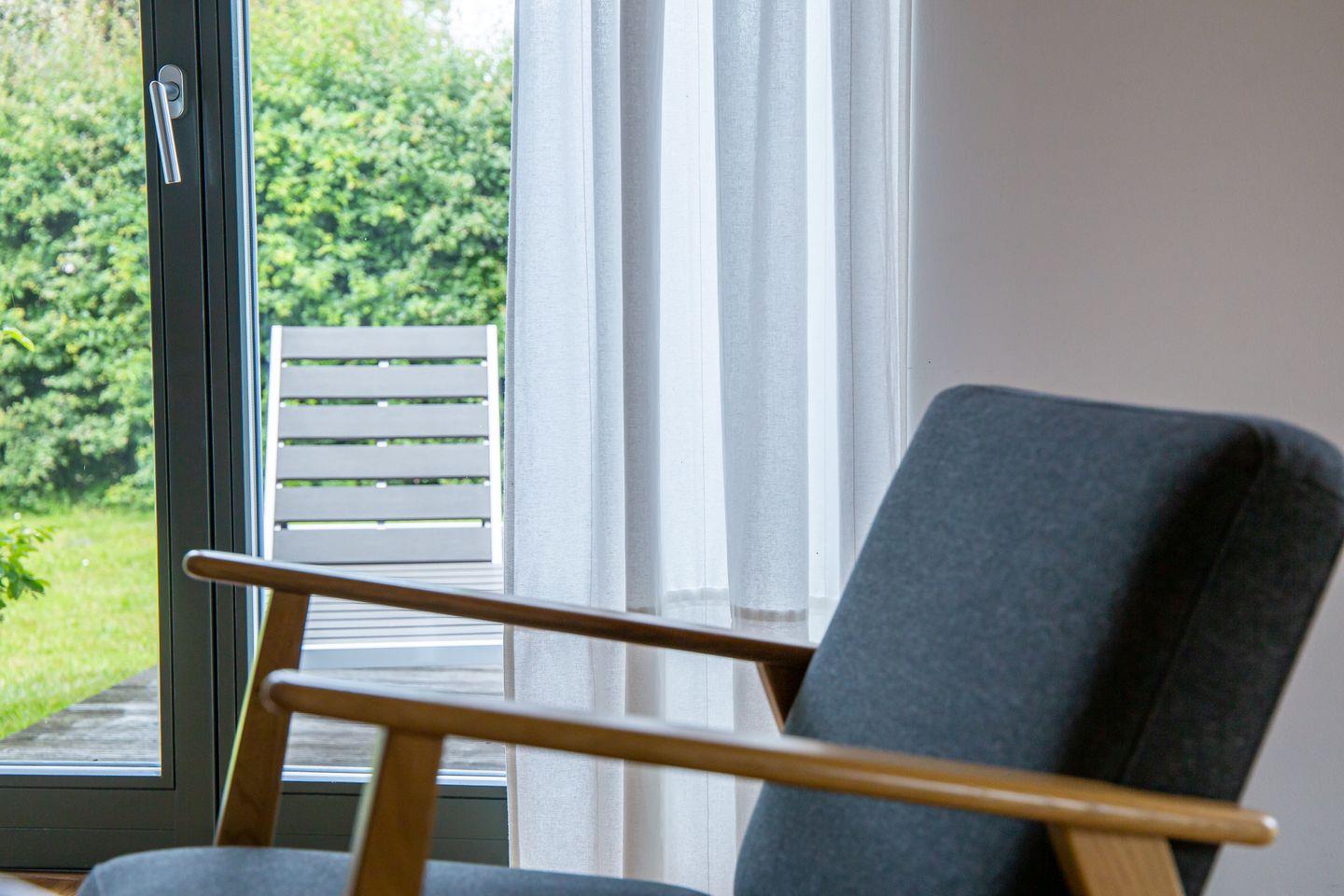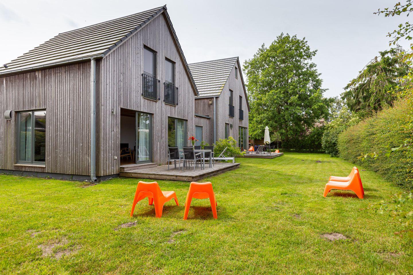 Eine moderne Architektur und ökologische Holzbauweise sind charakteristisch für dieses Landhaus nahe der Ostsee. Im Erdgeschoss erwartet dich ein großzügiger und lichtdurchfluteter Wohnraum mit klarem Design und retroinspirierten Möbeln. Mit der Holzbalkenkonstruktion in der Decke und dem Echtholzparkett wird das Naturmaterial Holz auch im Innenbereich wieder aufgegriffen und sorgt für eine tolle Wohnatmosphäre. Die Küchenzeile und der große Esstisch fügen sich harmonisch in den Wohnbereich ein. Ein begehbare Garderobe befindet sich ebenfalls auf der unteren Etage. Im Obergeschoss erwarten dich zwei cleane Schlafzimmer, die jeweils mit einem Doppelbett (180 cm und 140 cm) ausgestattet sind - handgefertigt vom Tischler. Ein modernes Badezimmer mit Dusche/WC rundet das Urlaubsdomizil perfekt ab.