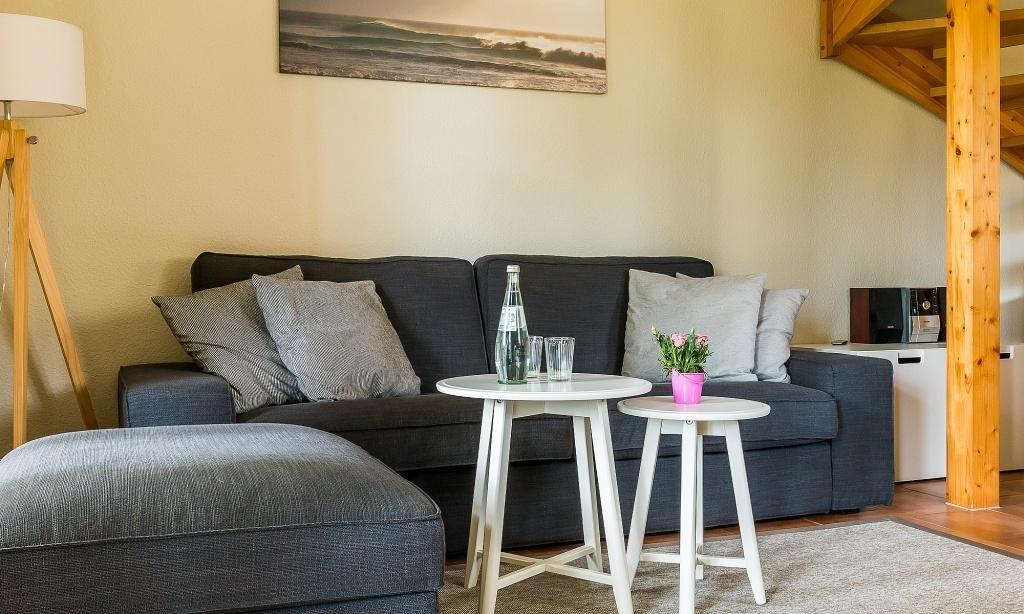 Das Erdgeschoss verfügt über einen Wohnraum mit einer gemütlichen Sitzecke am Kaminofen. Die Küchenzeile mit angrenzendem Essbereich ist direkt in den Wohnbereich integriert und schafft einen offenen Wohncharakter. Ein Bad mit Dusche/WC findet ebenfalls im Erdgeschoss Platz. Im Obergeschoss befinden sich zwei Schlafzimmer, die jeweils mit Doppelbetten ausgestattet sind sowie ein Bad mit Dusche / WC. Zwei weitere Einzelbetten findest du in der offenen Schlafgalerie im Dachgeschoss.