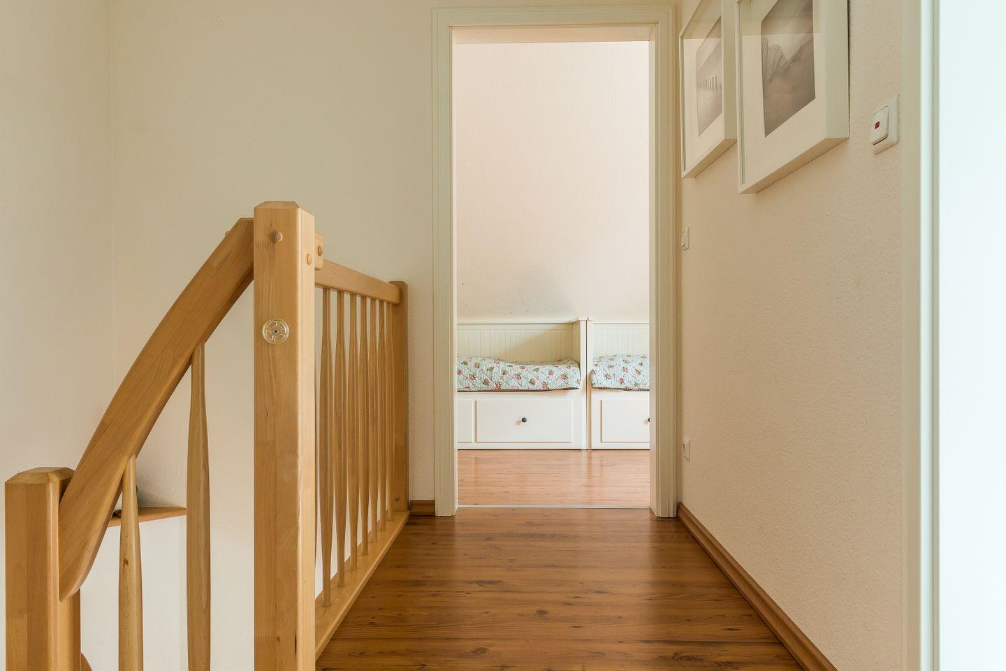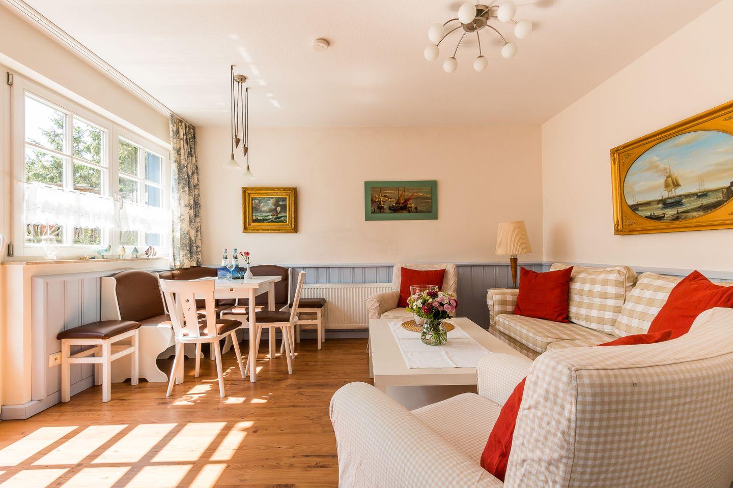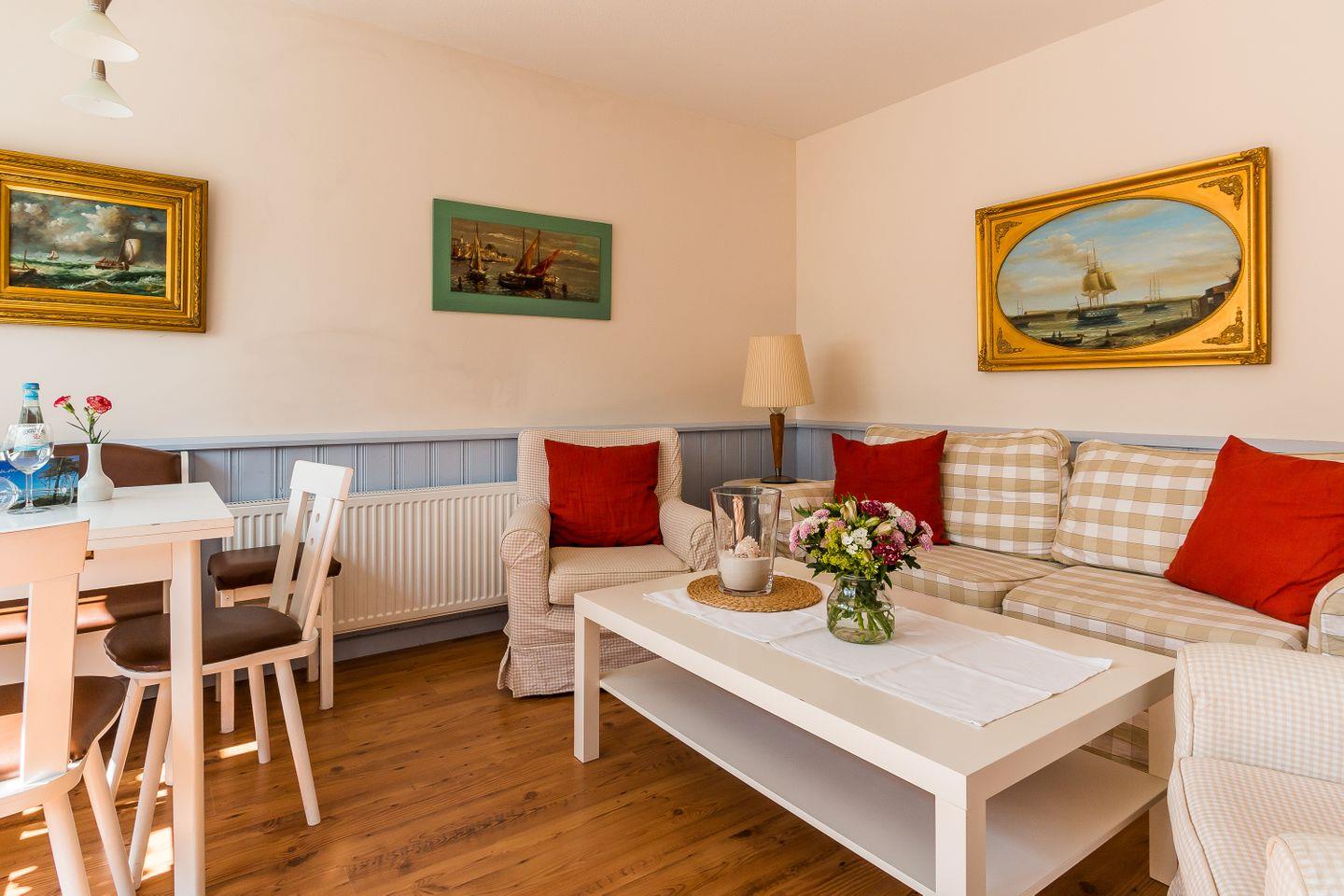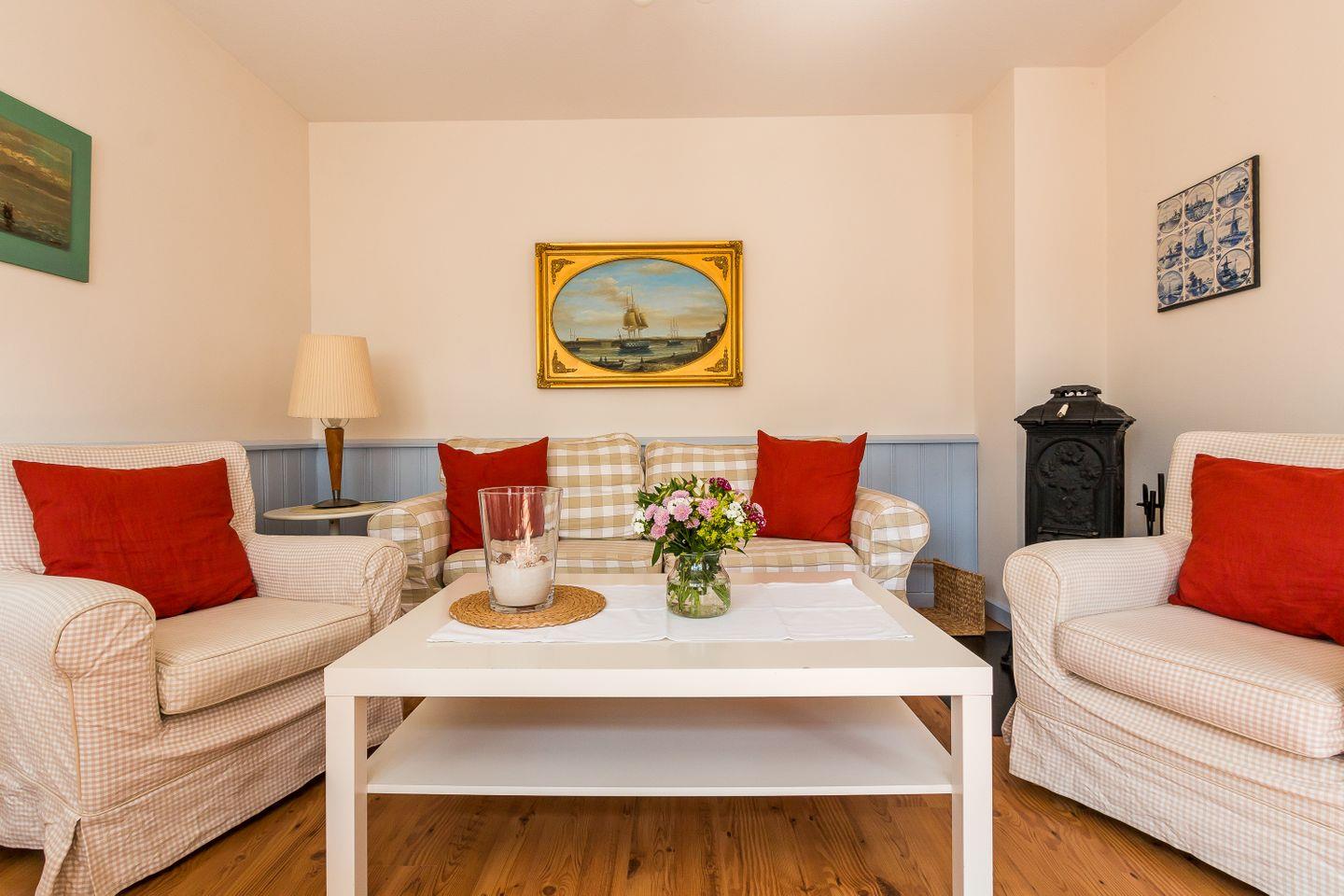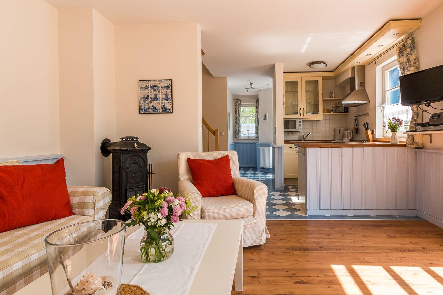 Die Maisonette-Wohnung ist mit individueller, zeitgemäßer und maritimer Wohnlichkeit ausgestattet und strahlt viel Gemütlichkeit aus. Im Erdgeschoss erwartet dich der liebevoll eingerichtete Wohnraum mit TV und DVD- und CD-Player und einem Kaminofen, der für kuschelige Wärme sorgt. Mit im Raum integriert ist die offen gestaltete Küche. Dank der komfortablen Ausstattung mit Geschirrspüler, Ceranherd, Backofen und Mikrowelle lässt diese keine Wünsche offen und lädt zum geselligen Kochen ein. Ein Gäste-WC befindet sich ebenfalls im Erdgeschoss. Die beiden hellen und freundlich eingerichteten Schlafzimmer liegen im Obergeschoss und sind mit einem Doppelbett und einem Kojenbett (für ein bis zwei Personen) ausgestattet. Hier befindet sich auch das Hauptbadezimmer mit Dusche/WC.