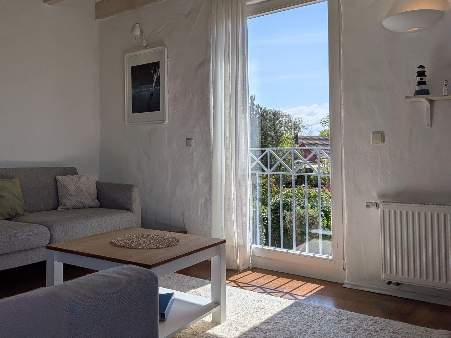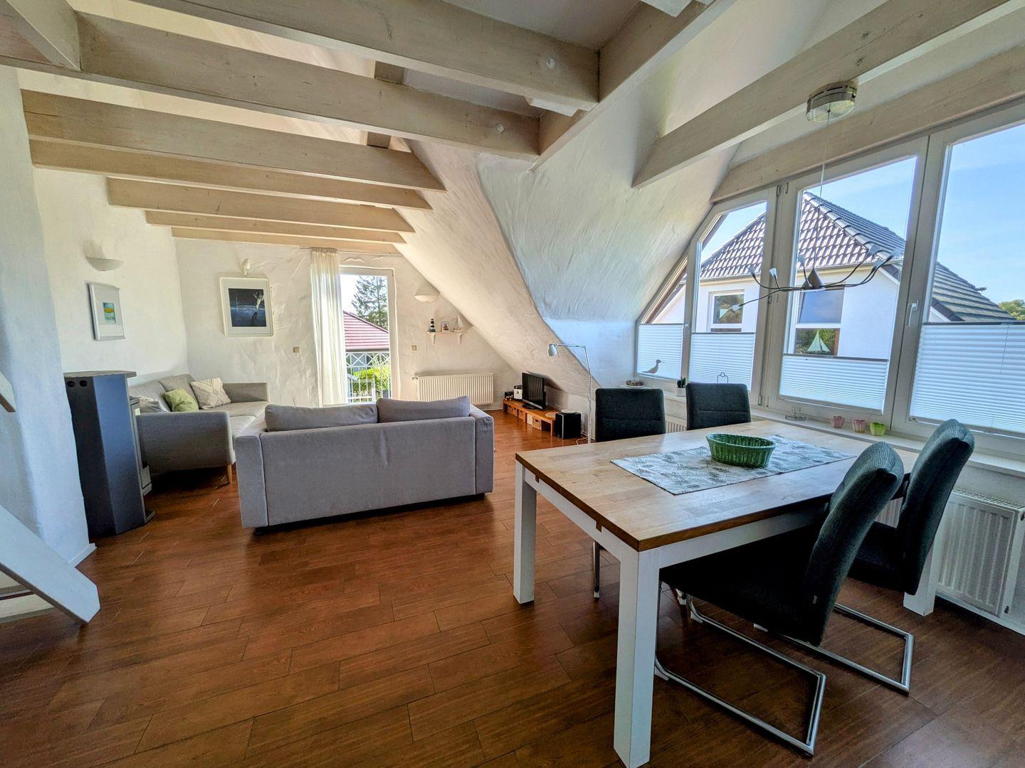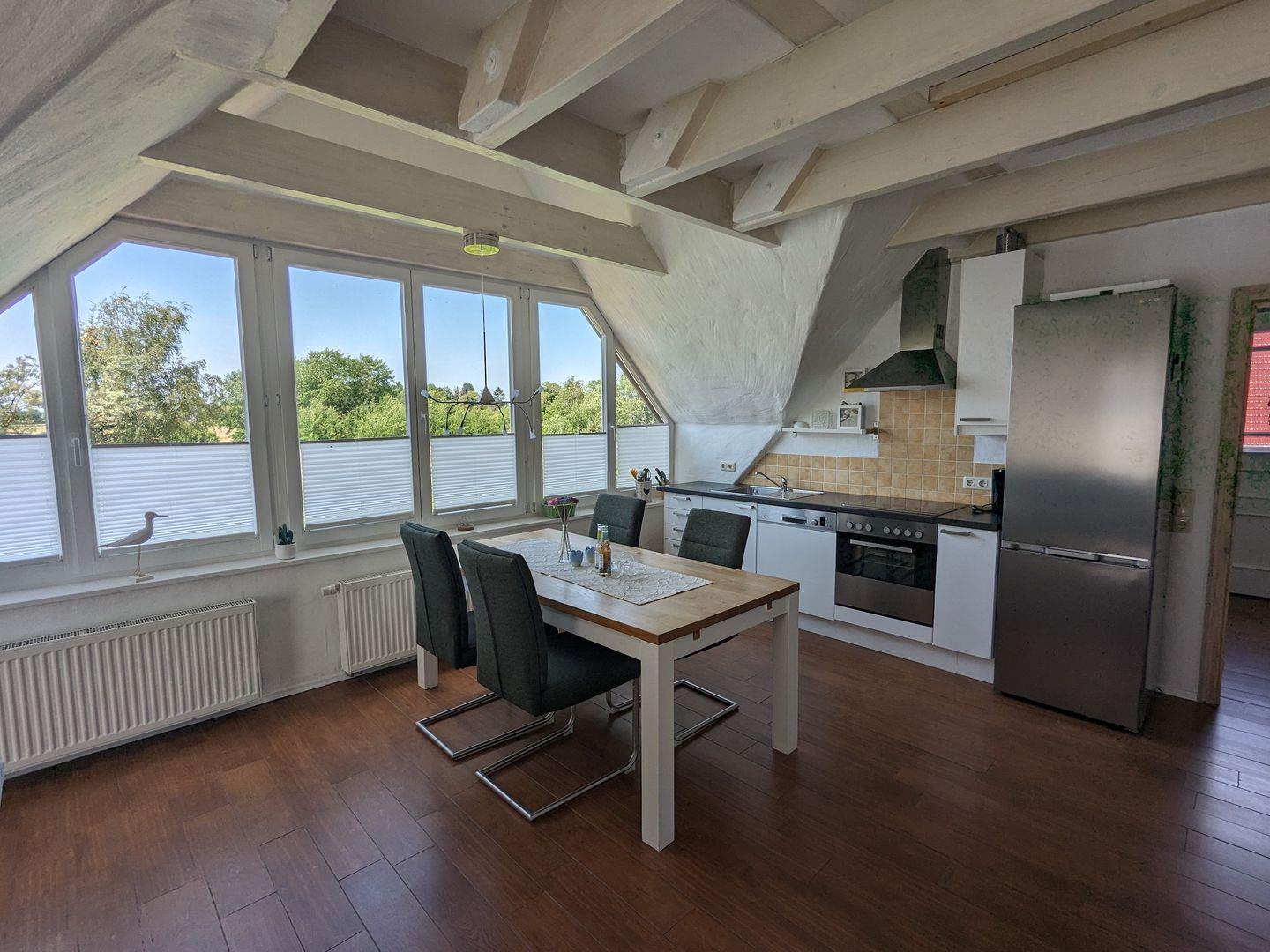 Ferienwohnung Weitblick - der Blick über die weiten Wiesen ist traumhaft schön. Der lichtdurchflutete Wohn- und Essraum mit offener Balkendecke und viele weitere liebevolle Details machen die Wohnung zu einer besonderen Adresse. Für Aktive: Reiterhof und Kletterwald sind in der Nähe.