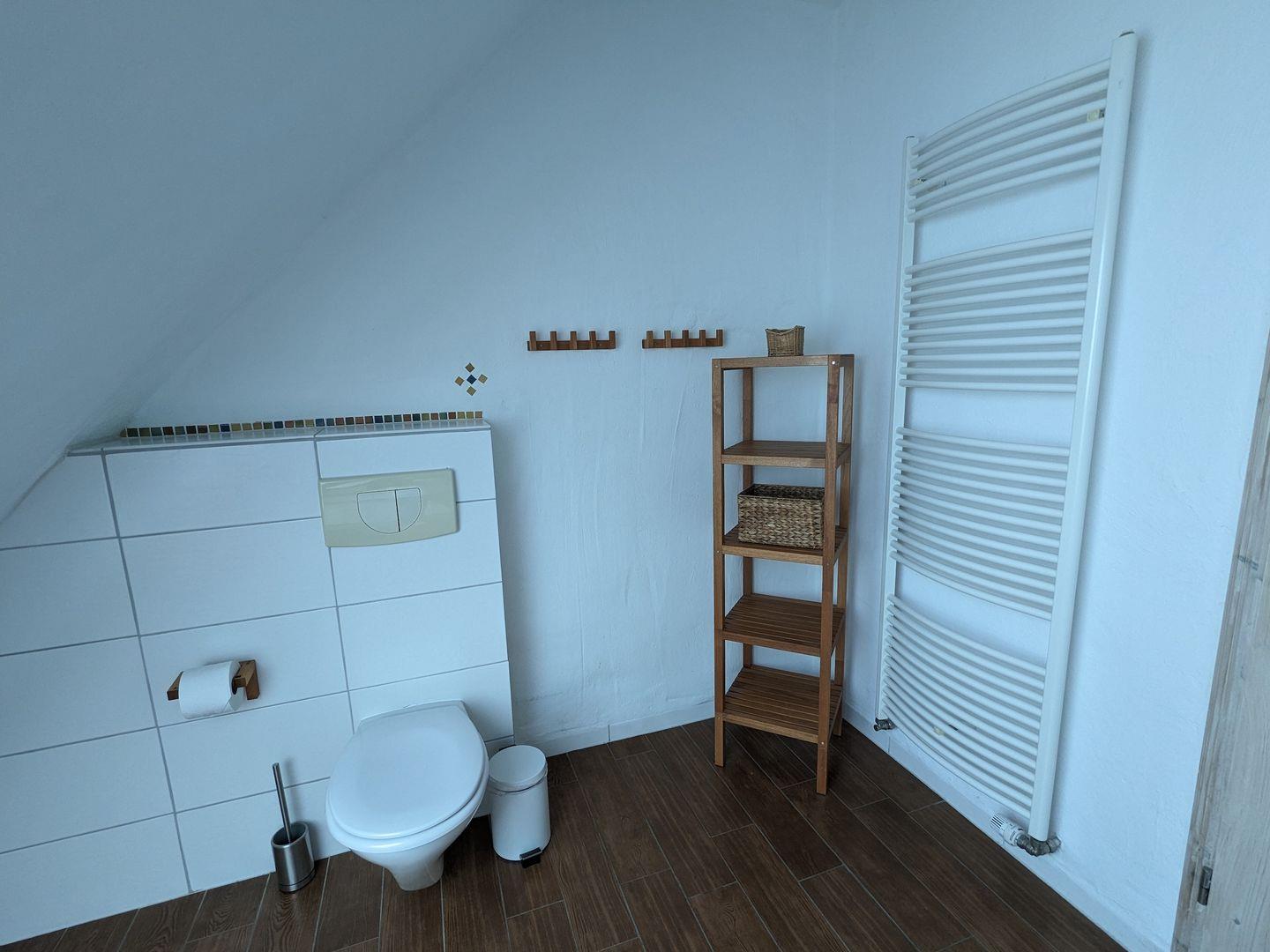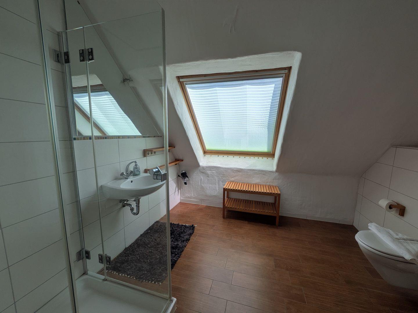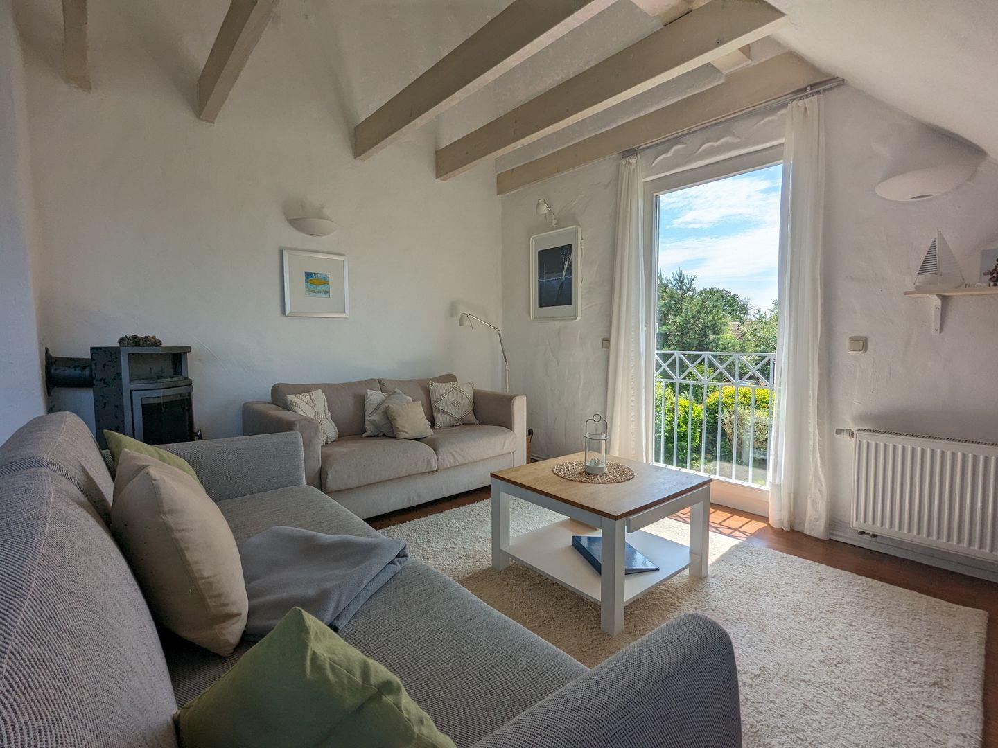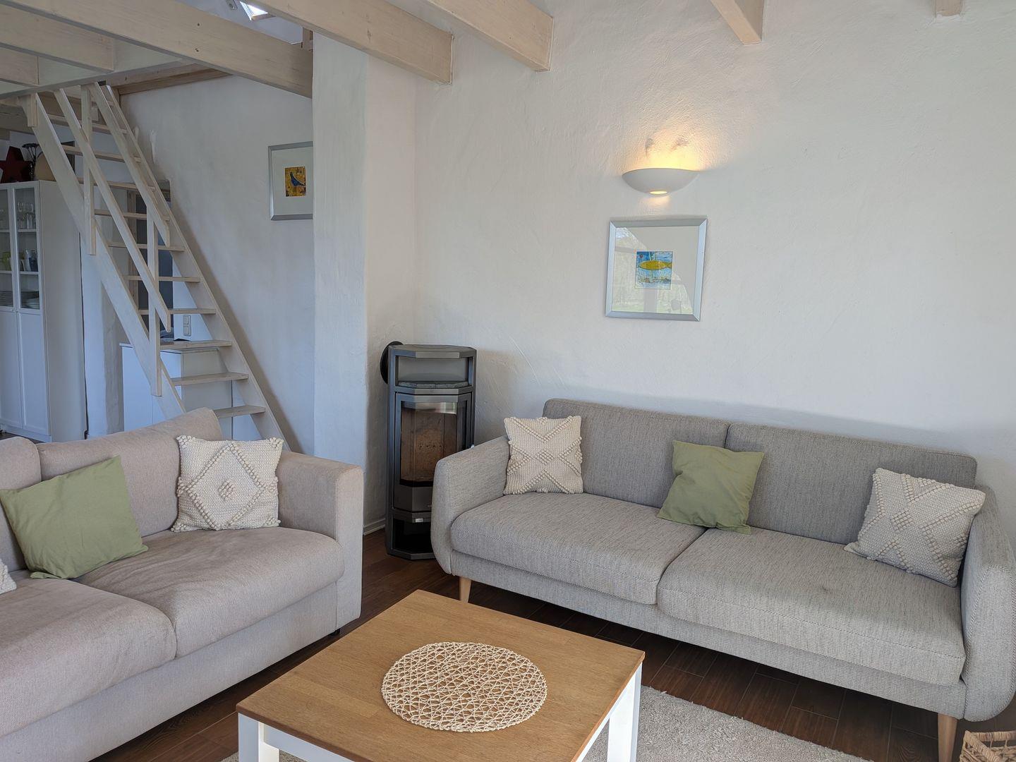 Obergeschoss / kostenfreies WLAN / Sat-TV mit Flachbildschirm, Stereoanlage mit Radio und CD / Kaminofen / sehr gut ausgestattete Küche, Herd mit Ceranfeld und Backofen, Geschirrspüler / zwei Schlafzimmer mit Doppelbett, ein Schlafsofa im offenen Spitzboden / Bad mit Dusche, Gäste-WC / Abstellraum mit Waschmaschine und kleiner Gartengrill