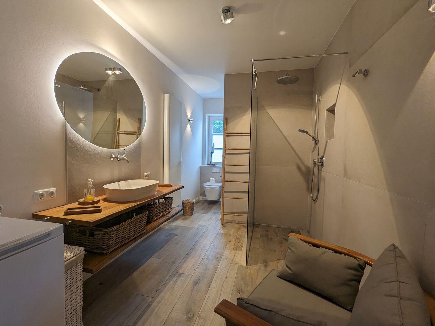großzügige und neu renovierte Bad. Ein ausgiebiges Frühstück auf der Terrasse im Grünen macht den Start in den Tag perfekt. Im Anschluss lädt der Boddenbadestrand vor der Haustür zum verweilen ein. Oder Sie starten eine Radtour durch den Darßer Urwald zum Weststrand...