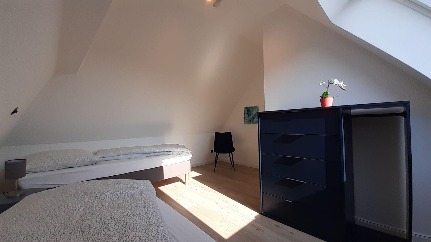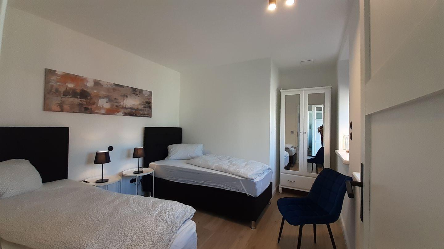Geschirrspülern und einem Essbereich. Ein Schlafzimmer mit zwei Einzelbetten