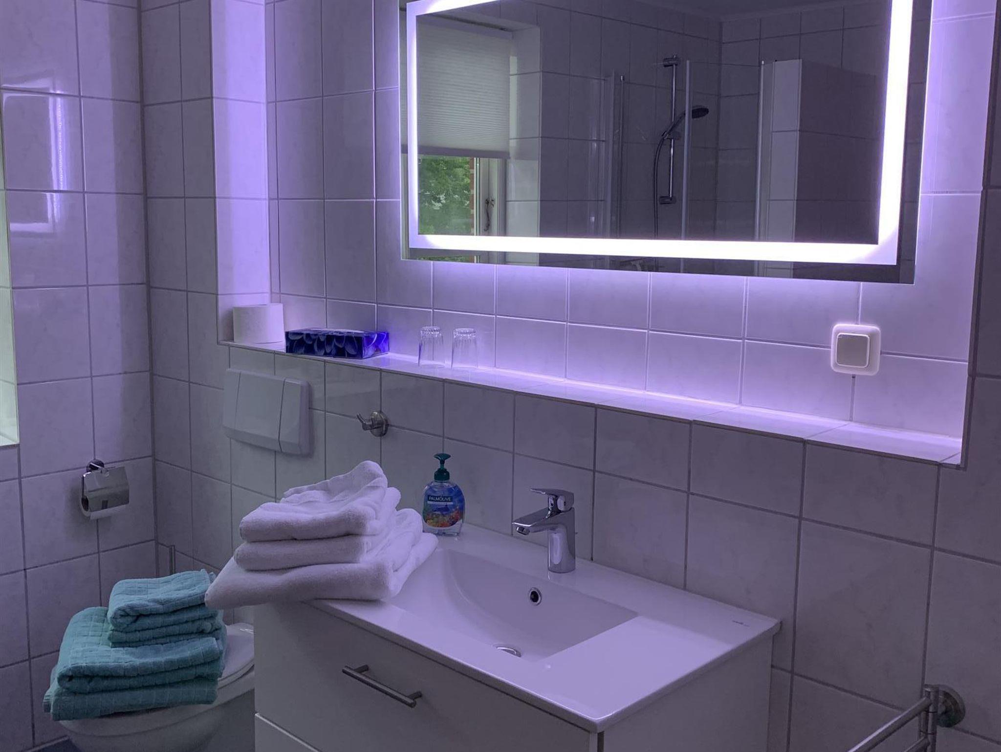 In der Küche selbst wartet auf Sie ein kleiner Sitzbereich für zwei Personen für ein schnelles Frühstück. Von der Diele aus haben Sie auch einen Zugang in einen Hauswirtschaftsraum in der sich eine Waschmaschine für Sie befindet. Ein Gäste-WC ist selbstverständlich im Erdgeschoss vorhanden. Von der Diele aus betreten Sie auch den großzügigen Wohnraum in dem sich dann eine Sofaecke so wie ein Essbereich befindet. Selbstverständlich ist der Wohnzimmerbereich mit einem TV ausgestattet.