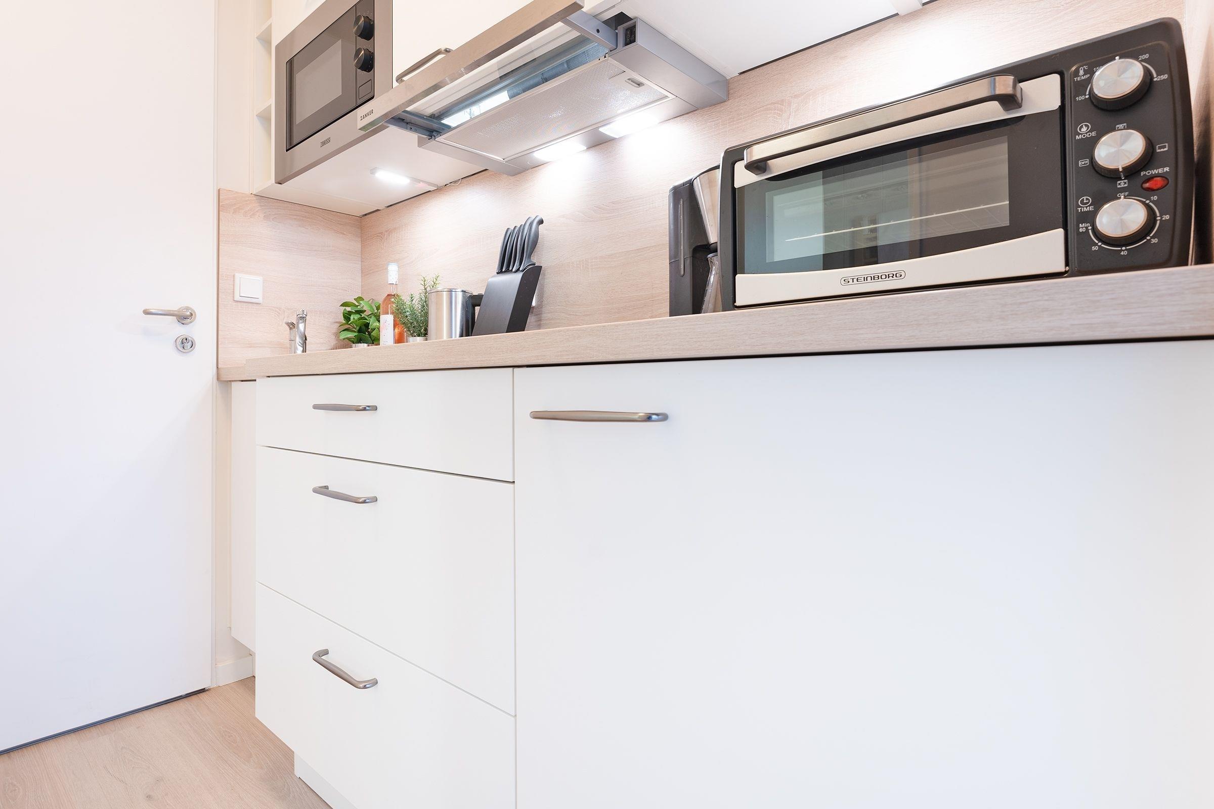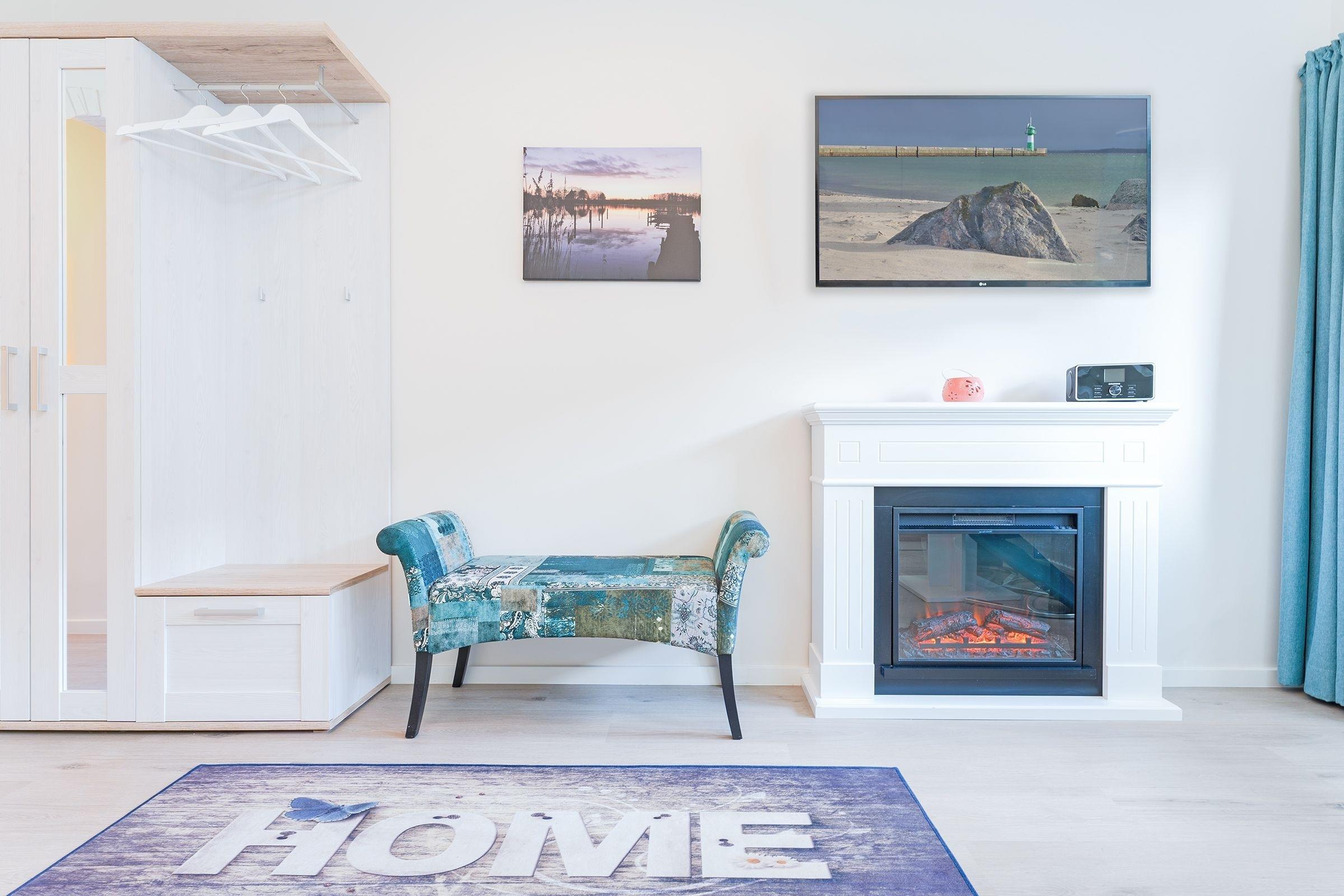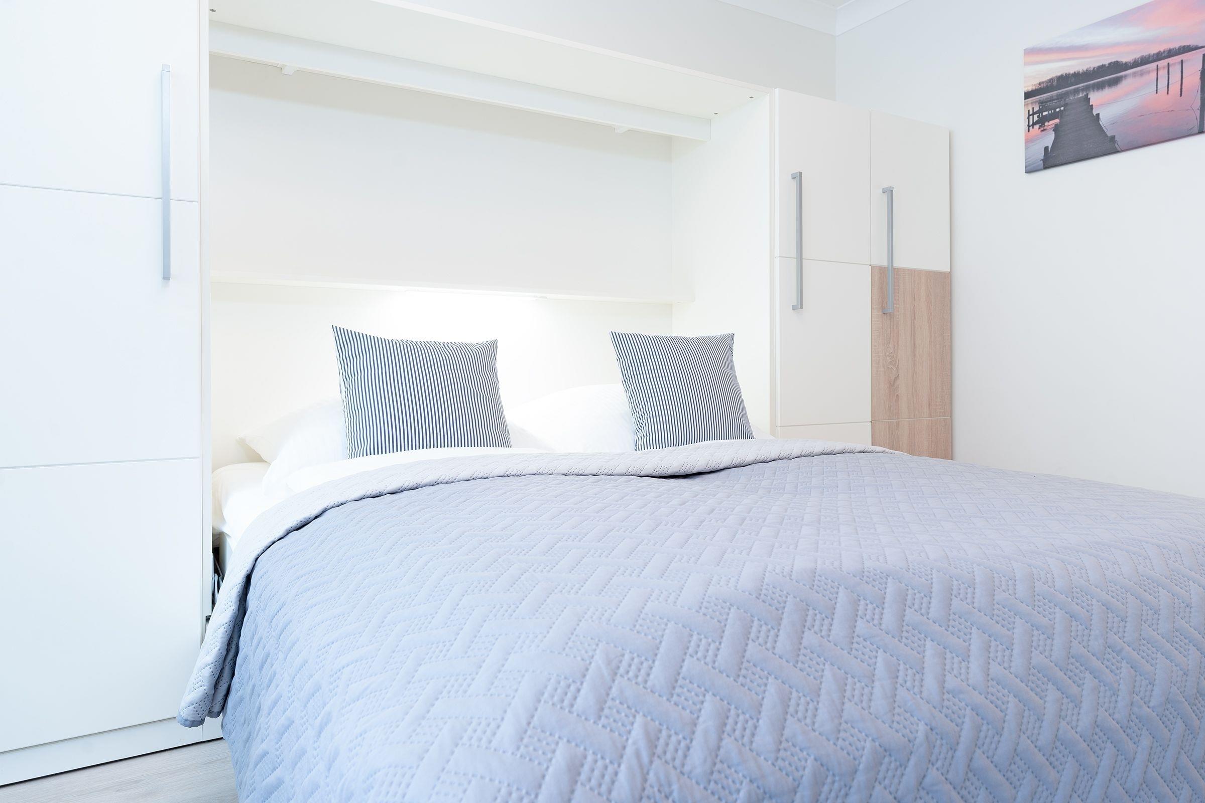 Es erwartet Sie eine moderner und lichtdurchfluteter Wohn-/Schlafbereich mit Zugang auf den möblierten Süd-Balkon. Genießen Sie hier zahlreiche Sonnenstunden mit seitlichem Blick auf den nahegelegenen See. Am Abend verwandeln Sie das platzsparende Schrankbett in Ihre Ruhe-Oase (2x 80x200 cm) und können es sich vor dem Smart-TV und dem Elektrokamin gemütlich machen. Tagsüber bietet der Esstisch ausreichend Platz zum Lesen, Fernsehen, Essen, Klönen oder Spielen. In der angrenzenden Küche, die mit vielen Annehmlichkeiten ausgestattet ist, können Sie Ihre Lieblingsspeisen spielend zubereiten. Das funktionale Dusch-Bad ist zusätzlich mit einem beheizbaren Handtuchhalter sowie einem Fön ausgestattet.