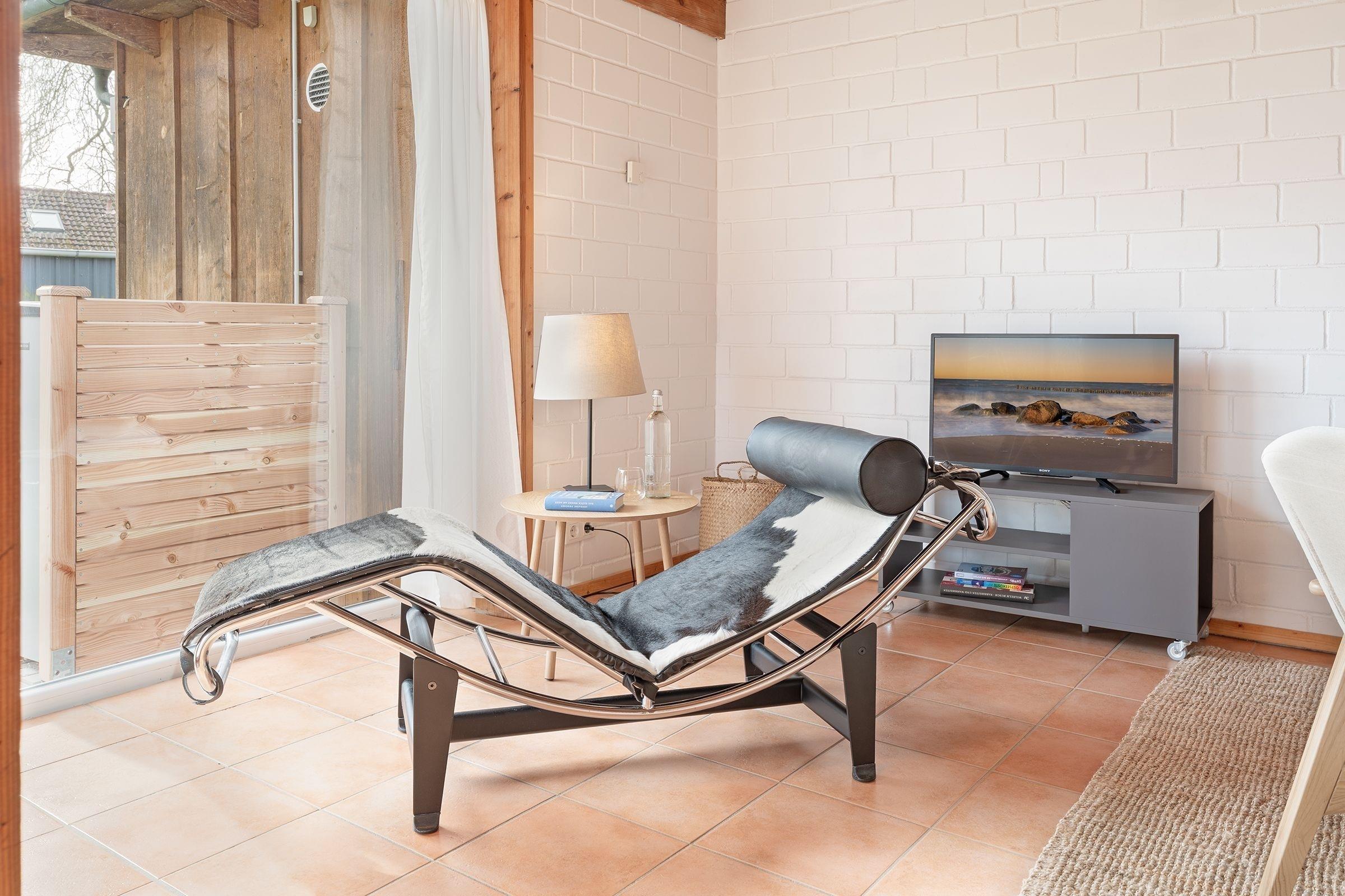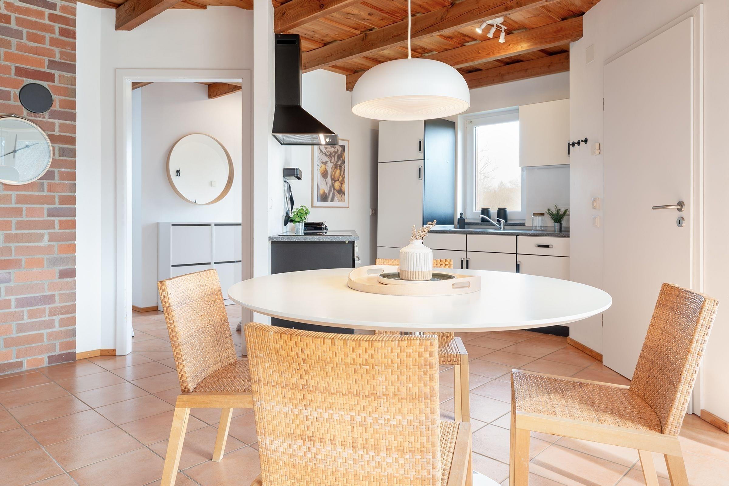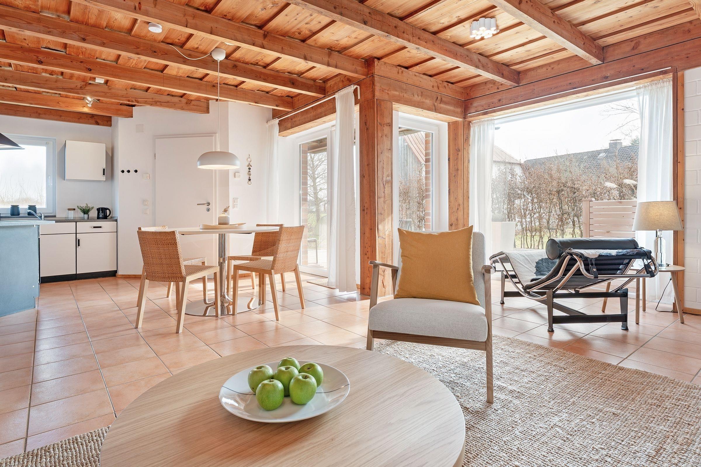 Diese moderne Ferienwohnung in Bosau bietet den perfekten Rückzugsort für einen entspannten Urlaub in der Holsteinischen Schweiz. Die großzügige und geschmackvolle Einrichtung sorgt für Wohlfühlatmosphäre. Das helle Wohnzimmer lädt mit einer gemütlichen Sofaecke und einem TV zum Verweilen ein. Von hier aus gelangen Sie auf die überdachte Terrasse, die mit Gartenmöbeln ausgestattet ist – ideal für Mahlzeiten oder entspannte Stunden im Freien. Der angrenzende Gemeinschaftsgarten bietet zusätzliche Möglichkeiten zur Erholung. Die offene, moderne Küche ist sehr gut ausgestattet: Cerankochfeld, Backofen, Kühlschrank mit Gefrierfach und eine Espressomaschine lassen keine Wünsche offen. Der Essbereich bietet ausreichend Platz für gemeinsame Mahlzeiten. Das Schlafzimmer mit bodentiefen Fenstern ist komfortabel eingerichtet und überzeugt mit seiner harmonischen Gestaltung. Das bequeme Doppelbett (2x 90x200 cm) sorgt für erholsame Nächte. Das tageslichthelle Duschbad bringt Sie entspannt in den neuen Tag.