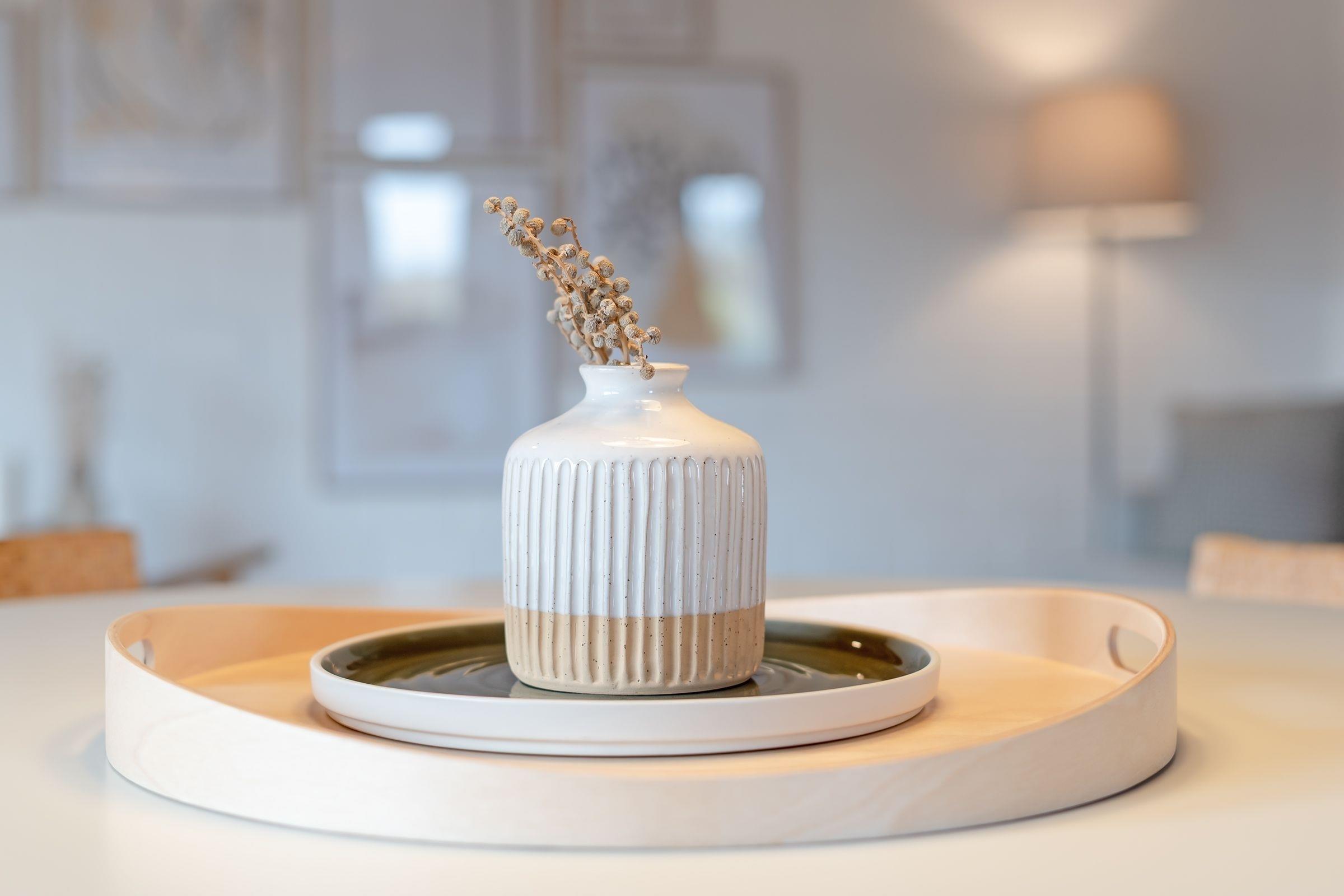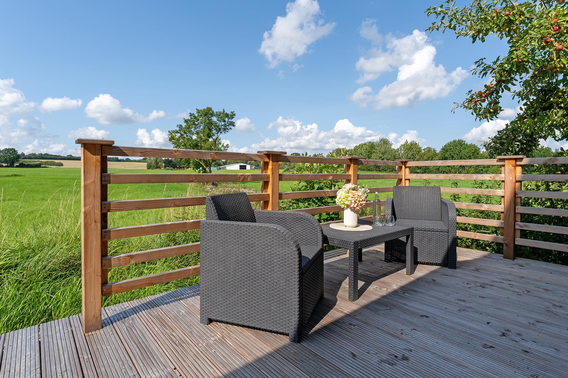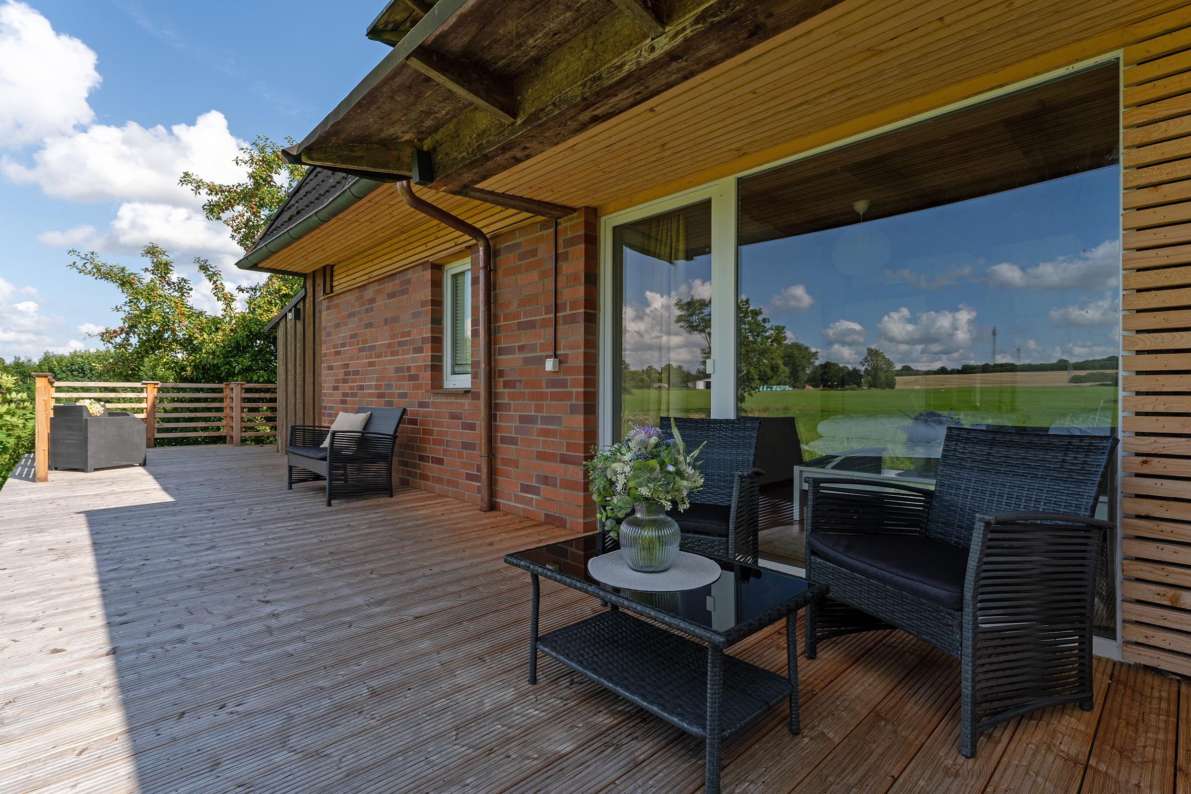 Diese moderne Ferienwohnung in Bosau bietet den perfekten Rückzugsort für einen entspannten Urlaub in der Holsteinischen Schweiz. Die großzügige und geschmackvolle Einrichtung sorgt für Wohlfühlatmosphäre. Das helle Wohnzimmer lädt mit einer gemütlichen Sofaecke und einem TV zum Verweilen ein. Von hier aus gelangen Sie auf die überdachte Terrasse, die mit Gartenmöbeln ausgestattet ist – ideal für Mahlzeiten oder entspannte Stunden im Freien. Der angrenzende Gemeinschaftsgarten bietet zusätzliche Möglichkeiten zur Erholung. Die offene, moderne Küche ist sehr gut ausgestattet: Cerankochfeld, Backofen, Kühlschrank mit Gefrierfach und eine Espressomaschine lassen keine Wünsche offen. Der Essbereich bietet ausreichend Platz für gemeinsame Mahlzeiten. Das Schlafzimmer mit bodentiefen Fenstern ist komfortabel eingerichtet und überzeugt mit seiner harmonischen Gestaltung. Das bequeme Doppelbett (2x 90x200 cm) sorgt für erholsame Nächte. Das tageslichthelle Duschbad bringt Sie entspannt in den neuen Tag.