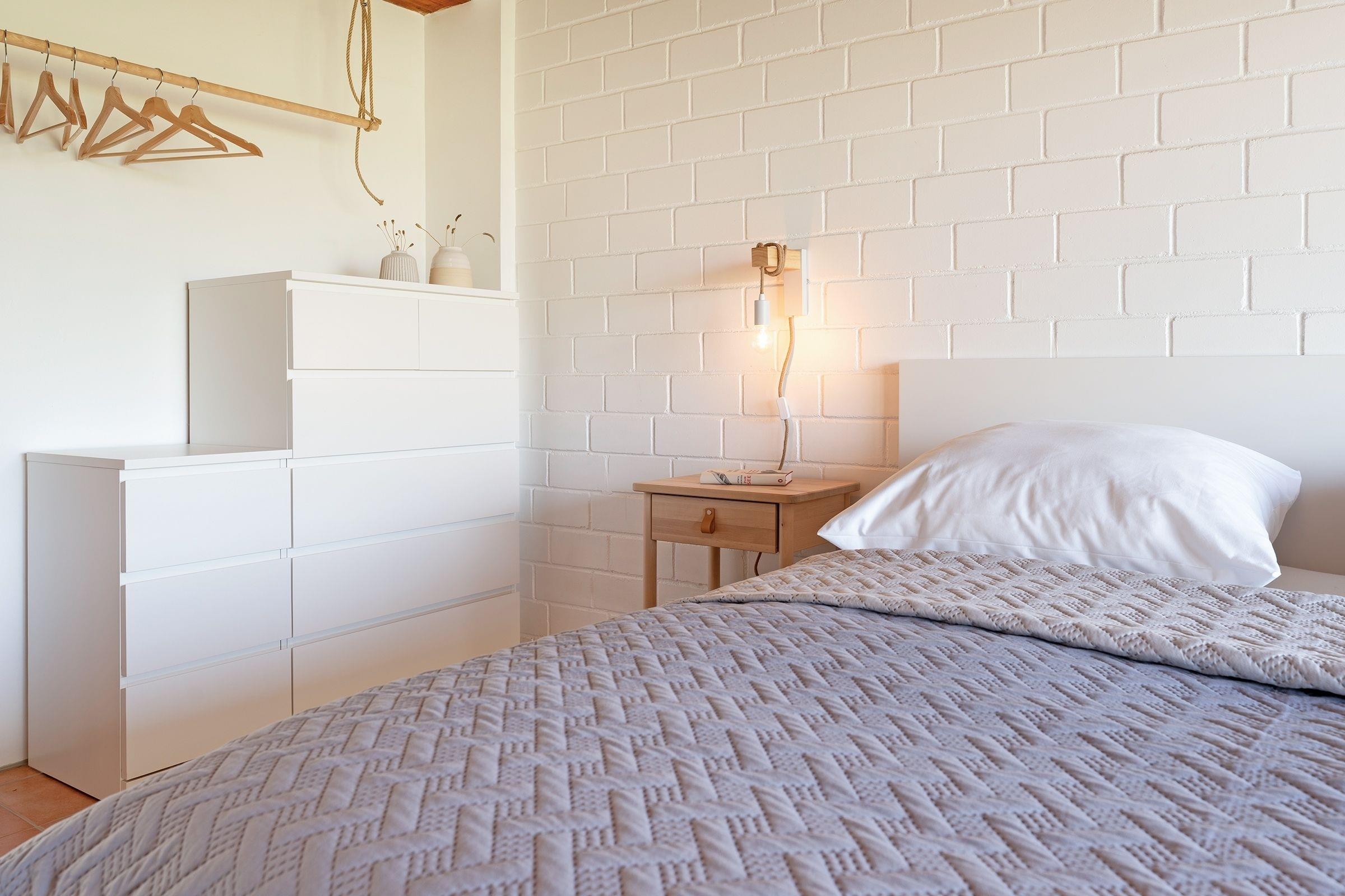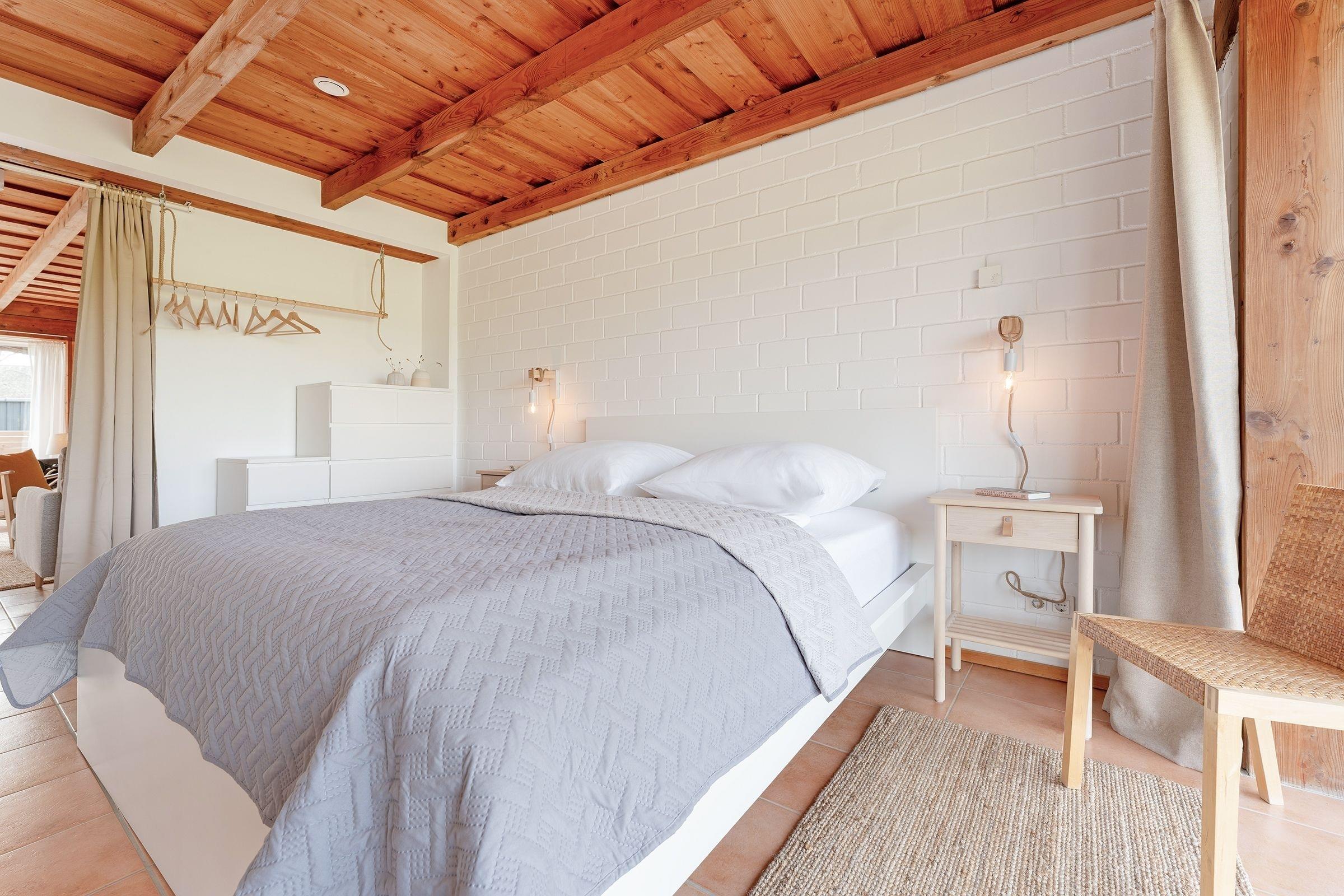 Schlafzimmer: 1 Doppelbett (2x 90x200 cm), Kleiderschrank, Verdunkelung: Vorhang, Platz für ein Babybett vorhanden